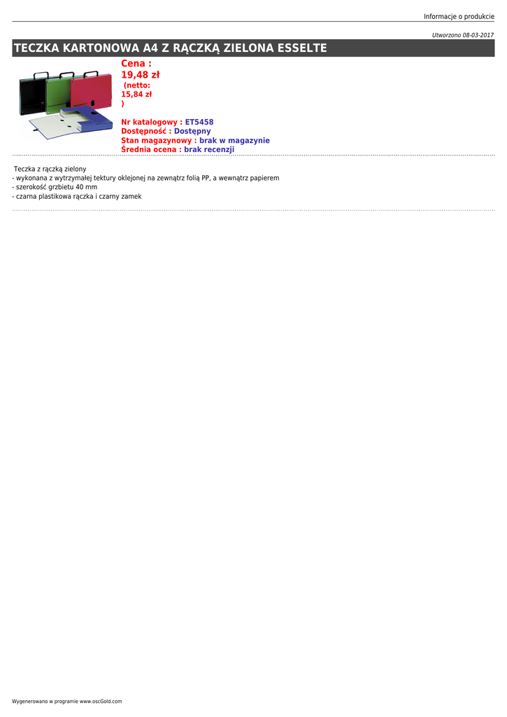 Informacje o produkcie Utworzono 08-03-2017 TECZKA KARTONOWA A4 Z RĄCZKĄ ZIELONA ESSELTE Cena : 19,48 zł (netto: 15,84 zł ) Nr katalogowy : ET5458 Dostępność : Dostępny Stan magazynowy : brak w magazynie Średnia ocena : brak recenzji Teczka z rączką zielony - wykonana z wytrzymałej tektury oklejonej na zewnątrz folią PP, a wewnątrz papierem - szerokość grzbietu 40 mm - czarna plastikowa rączka i czarny zamek Wygenerowano w programie www.oscGold.com