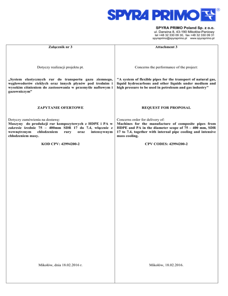 SPYRA PRIMO Poland Sp. z o.o. ul. Darwina 8, 43-190 Mikołów-Paniowy tel +48 32 330 09 30, fax +48 32 330 09 31 [email protected] www.spyraprimo.pl Załącznik nr 3 Attachment 3 Dotyczy realizacji projektu pt. Concerns the performance of the project: „System elastycznych rur do transportu gazu ziemnego, węglowodorów ciekłych oraz innych płynów pod średnim i wysokim ciśnieniem do zastosowania w przemyśle naftowym i gazowniczym” "A system of flexible pipes for the transport of natural gas, liquid hydrocarbons and other liquids under medium and high pressure to be used in petroleum and gas industry" ZAPYTANIE OFERTOWE REQUEST FOR PROPOSAL Dotyczy zamówienia na dostawę: Maszyny do produkcji rur kompozytowych z HDPE i PA w zakresie średnic 75 – 400mm SDR 17 do 7.4, włącznie z wewnętrznym chłodzeniem rury oraz intensywnym chłodzeniem masy. Concerns order for delivery of: Machines for the manufacture of composite pipes from HDPE and PA in the diameter scope of 75 – 400 mm, SDR 17 to 7.4, together with internal pipe cooling and intensive mass cooling. KOD CPV: 42994200-2 CPV CODES: 42994200-2 Mikołów, dnia 18.02.2016 r. Mikołów, 18.02.2016. CONTENTS: SPIS TREŚCI: 1. 2. 3. 4. Nazwa (firma) oraz adres zamawiającego. Postanowienia ogólne. Opis przedmiotu zamówienia. Termin związania ofertą oraz wykonania przedmiotu zamówienia. 5. Informacje o sposobie porozumiewania się zamawiającego z wykonawcami oraz przekazywania dokumentów, 6. Opis sposobu przygotowania ofert oraz załączników; 7. Informacje dotyczące zakresu wykluczenia. 8. Miejsce oraz termin składania ofert. 9. Wybór oferty. 10. Warunki udziału w postępowaniu 11. Kryteria oceny ofert i sposób obliczenia ceny oraz informacja o wagach punktowych lub procentowych przypisanych do poszczególnych kryteriów oceny oferty. 12. Informacja dotycząca wyboru najkorzystniejszej oferty. 1. 2. 3. 4. Name (company) and address of the Ordering Party. General provisions. Description of the subject of the procurement. The bid validity period and the performance of the subject of the order. 5. Information about the method of contact between the Ordering Party and the Contractors and the method of passing documents, 6. Description of the bid and appendix drafting method 7. Information regarding the exclusion scope. 8. Place and deadline for bid submission. 9. Bid selection 10. Conditions of participation in the procedure 11. Bid assessment criteria and the method for price calculation as well as information about point weights or percentage weights assigned to the specific bid assessment criteria. 12. The information concerning the selection of the most advantageous bid. 1. 1. ZAMAWIAJĄCY „SPYRA-PRIMO Poland” Sp. z o.o. ul. Karola Darwina 8 43-190 Mikołów-Paniowy NIP 6350009571 THE ORDERING PARTY "SPYRA-PRIMO Poland" Sp. z o.o. ul. Karola Darwina 8 43-190 Mikołów-Paniowy, Poland NIP 6350009571 2. POSTANOWIENIA OGÓLNE a) Każdy oferent może złożyć tylko jedną ofertę. b) Oferta jest składana na piśmie w języku polskim, angielskim lub niemieckim. c) Wszystkie strony oferty winny być ponumerowane i zszyte w sposób uniemożliwiający dekompletacje zawartości oferty. d) Oferent ponosi wszelkie koszty związane z przygotowaniem i złożeniem oferty. e) W przypadku zaistnienia okoliczności, o których mowa w pkt. 4 i 5 Postanowień Ogólnych, Oferentom nie przysługują żadne roszczenia w stosunku do Inwestora. 2. GENERAL PROVISIONS a) Each Bidder may submit only one bid. b) A bid is submitted in writing, in Polish, English or German. c) All bid pages should be numbered and sewn together in a way that makes it impossible to the bid contents to be disassembled. d) The Bidder covers all costs related with the preparation and submission of the bid. e) In the case the circumstances mentioned in points 4 and 5 of the General Provisions arise, the Bidders have no claims with regard to the Investor. 3. OPIS PRZEDMIOTU ZAMÓWIENIA Przedmiotem zamówienia jest dostawa Maszyny do produkcji rur kompozytowych z HDPE i PA w zakresie średnic 75 – 400mm SDR 17 do 7.4, włącznie z wewnętrznym chłodzeniem rury oraz intensywnym chłodzeniem masy. 3. DESCRIPTION OF THE SUBJECT OF THE ORDER The subject of the order is the delivery - Machine for the manufacture of composite pipes from HDPE and PA in the diameter scope of 75 – 400 mm, SDR 17 to 7.4, together with internal pipe cooling and intensive mass cooling. Szczegółowy opis załącznik nr 1. przedmiotu zamówienia zawiera The detailed description of the subject of the order is included in appendix no. 1. 4. TERMIN ZWIĄZANIA OFERTĄ ORAZ WYKONANIA PRZEDMIOTU ZAMÓWIENIA a) Okres ważności oferty do dnia 31.05.2016 r. b) Zamawiający planuje podpisanie umowy najpóźniej do dnia 15.03.2016 r. c) Planowany termin wykonania przedmiotu zamówienia do dnia 30.10.2016 r. 4. THE BID VALIDITY PERIOD AND THE PERFORMANCE OF SUBJECT OF THE ORDER. a) Bid validity period until 31.05.2016. b) The ordering part plans to sign the agreement until 15.03.2016 at the latest. c) The planned deadline for performing the subject of the order, until 30.10.2016. 5. INFORMACJE O SPOSOBIE POROZUMIEWANIA SIĘ INWESTORA Z OFERENTAMI ORAZ PRZEKAZYWANIA DOKUMENTÓW a) Zapytanie ofertowe wraz z pozostałymi załącznikami sporządzone jest w języku polskim i angielskim . b) Oświadczenia, zawiadomienia oraz dodatkowe informacje Inwestor i oferenci przekazują pisemnie, drogą elektroniczną lub bezpośredniego doręczenia. c) Osobą uprawnioną do porozumiewania się z oferentami jest: Czesław Spyra - Prezes Zarządu, tel.: +48 32 3300930 mail: [email protected] 5. INFORMATION ABOUT THE METHOD OF CONTACT BETWEEN THE INVESTOR AND THE BIDDERS AND THE METHOD OF PASSING DOCUMENTS a) The request for proposal, along with the remaining attachments, is drafted in Polish and English. b) Declarations, notices and additional information are passed between the Investor and the Bidders in writing,