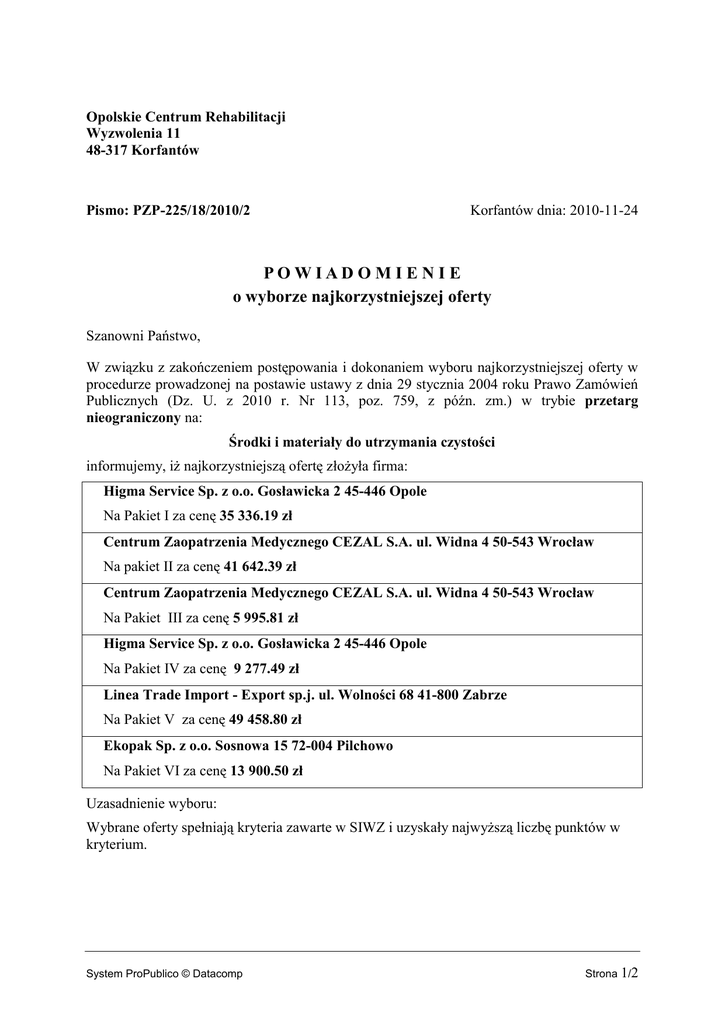 Opolskie Centrum Rehabilitacji Wyzwolenia 11 48-317 Korfantów Pismo: PZP-225/18/2010/2 Korfantów dnia: 2010-11-24 POWIADOMIENIE o wyborze najkorzystniejszej oferty Szanowni Państwo, W związku z zakończeniem postępowania i dokonaniem wyboru najkorzystniejszej oferty w procedurze prowadzonej na postawie ustawy z dnia 29 stycznia 2004 roku Prawo Zamówień Publicznych (Dz. U. z 2010 r. Nr 113, poz. 759, z późn. zm.) w trybie przetarg nieograniczony na: Środki i materiały do utrzymania czystości informujemy, iż najkorzystniejszą ofertę złożyła firma: Higma Service Sp. z o.o. Gosławicka 2 45-446 Opole Na Pakiet I za cenę 35 336.19 zł Centrum Zaopatrzenia Medycznego CEZAL S.A. ul. Widna 4 50-543 Wrocław Na pakiet II za cenę 41 642.39 zł Centrum Zaopatrzenia Medycznego CEZAL S.A. ul. Widna 4 50-543 Wrocław Na Pakiet III za cenę 5 995.81 zł Higma Service Sp. z o.o. Gosławicka 2 45-446 Opole Na Pakiet IV za cenę 9 277.49 zł Linea Trade Import - Export sp.j. ul. Wolności 68 41-800 Zabrze Na Pakiet V za cenę 49 458.80 zł Ekopak Sp. z o.o. Sosnowa 15 72-004 Pilchowo Na Pakiet VI za cenę 13 900.50 zł Uzasadnienie wyboru: Wybrane oferty spełniają kryteria zawarte w SIWZ i uzyskały najwyższą liczbę punktów w kryterium. System ProPublico © Datacomp Strona 1/2 Streszczenie oceny i porównania złożonych ofert Nr tem atu 1 2 3 4 5 5 6 6 Nazwa i adres wykonawcy (Nr oferty) Higma Service Sp. z o.o. Gosławicka 2 45-446 Opole (1) Centrum Zaopatrzenia Medycznego CEZAL S.A. ul. Widna 4 50-543 Wrocław (3) Centrum Zaopatrzenia Medycznego CEZAL S.A. ul. Widna 4 50-543 Wrocław (3) Higma Service Sp. z o.o. Gosławicka 2 45-446 Opole (1) Linea Trade Import - Export sp.j. ul. Wolności 68 41-800 Zabrze (2) HELPLAST J. Hadasik - M. Helbig Powstańców Sl. 11 43-190 Mikołów (5) Ekopak Sp. z o.o. Sosnowa 15 72-004 Pilchowo (4) Centrum Zaopatrzenia Medycznego CEZAL S.A. ul. Widna 4 50-543 Wrocław (3) Cena (koszt) 100,00 100,00 100,00 100,00 100,00 98,41 100,00 35,85 Jednocześnie informujemy, że umowa w spawie zamówienia publicznego może być zawarta, z zastrzeżeniem art. 183 ustawy Prawo Zamówień Publicznych, w terminie nie krótszym niż 5 dni od dnia przesłania niniejszego zawiadomienia o wyborze najkorzystniejszej oferty. Zamawiający może zawrzeć umowę w sprawie zamówienia publicznego przed upływem terminu, o którym mowa powyżej, jeżeli zachodzą okoliczności wymienione w art. 94 ust. 2 ustawy Prawo Zamówień Publicznych. Równocześnie zawiadamiamy, iż wyłącznie od niezgodnej z przepisami ustawy Prawo Zamówień Publicznych czynności Zamawiającego podjętej w postępowaniu o udzielenie zamówienia lub zaniechania czynności, do której Zamawiający jest zobowiązany na podstawie ustawy Prawo Zamówień Publicznych przysługuje odwołanie, z zastrzeżeniem art. 180 ust. 2 ustawy Prawo Zamówień Publicznych. Odwołanie wnosi się w terminach i formie, określonych w art. 182 oraz art. 180 ust. 4 ustawy Prawo Zamówień Publicznych. System ProPublico © Datacomp Strona 2/2