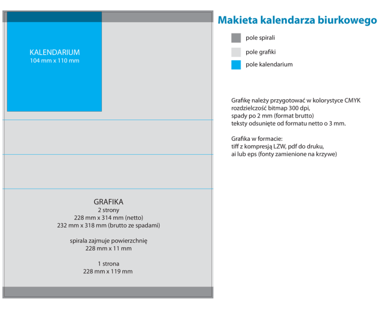 Makieta kalendarza biurkowego pole spirali KALENDARIUM pole grafiki 104 mm x 110 mm pole kalendarium Grafikę należy przygotować w kolorystyce CMYK rozdzielczość bitmap 300 dpi, spady po 2 mm (format brutto) teksty odsunięte od formatu netto o 3 mm. Grafika w formacie: tiff z kompresją LZW, pdf do druku, ai lub eps (fonty zamienione na krzywe) GRAFIKA 2 strony 228 mm x 314 mm (netto) 232 mm x 318 mm (brutto ze spadami) spirala zajmuje powierzchnię 228 mm x 11 mm 1 strona 228 mm x 119 mm