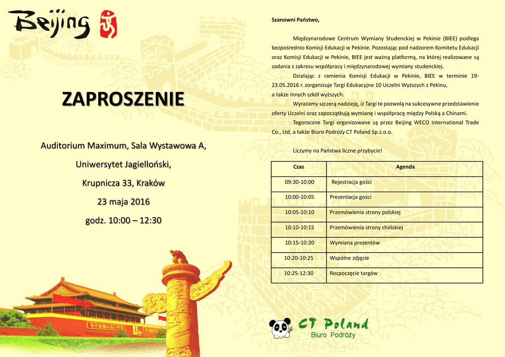 Szanowni Państwo, Międzynarodowe Centrum Wymiany Studenckiej w Pekinie (BIEE) podlega bezpośrednio Komisji Edukacji w Pekinie. Pozostając pod nadzorem Komitetu Edukacji oraz Komisji Edukacji w Pekinie, BIEE jest ważną platformą, na której realizowane są zadania z zakresu współpracy i międzynarodowej wymiany studenckiej. Działając z ramienia Komisji Edukacji w Pekinie, BIEE w terminie 1923.05.2016 r. zorganizuje Targi Edukacyjne 10 Uczelni Wyższych z Pekinu, ZAPROSZENIE a także innych szkół wyższych. Wyrażamy szczerą nadzieję, iż Targi te pozwolą na sukcesywne przedstawienie oferty Uczelni oraz zapoczątkują wymianę i współpracę między Polską a Chinami. Tegoroczne Targi organizowane są przez Beijing WECO International Trade Co., Ltd, a także Biuro Podróży CT Poland Sp.z.o.o. Auditorium Maximum, Sala Wystawowa A, Liczymy na Państwa liczne przybycie! Uniwersytet Jagielloński, Czas Krupnicza 33, Kraków 09:30-10:00 Rejestracja gości 10:00-10:05 Prezentacja gości 10:05-10:10 Przemówienia strony polskiej 10:10-10:15 Przemówienia strony chińskiej 10:15-10:20 Wymiana prezentów 10:20-10:25 Wspólne zdjęcie 10:25-12:30 Rozpoczęcie targów 23 maja 2016 godz. 10:00 – 12:30 Agenda