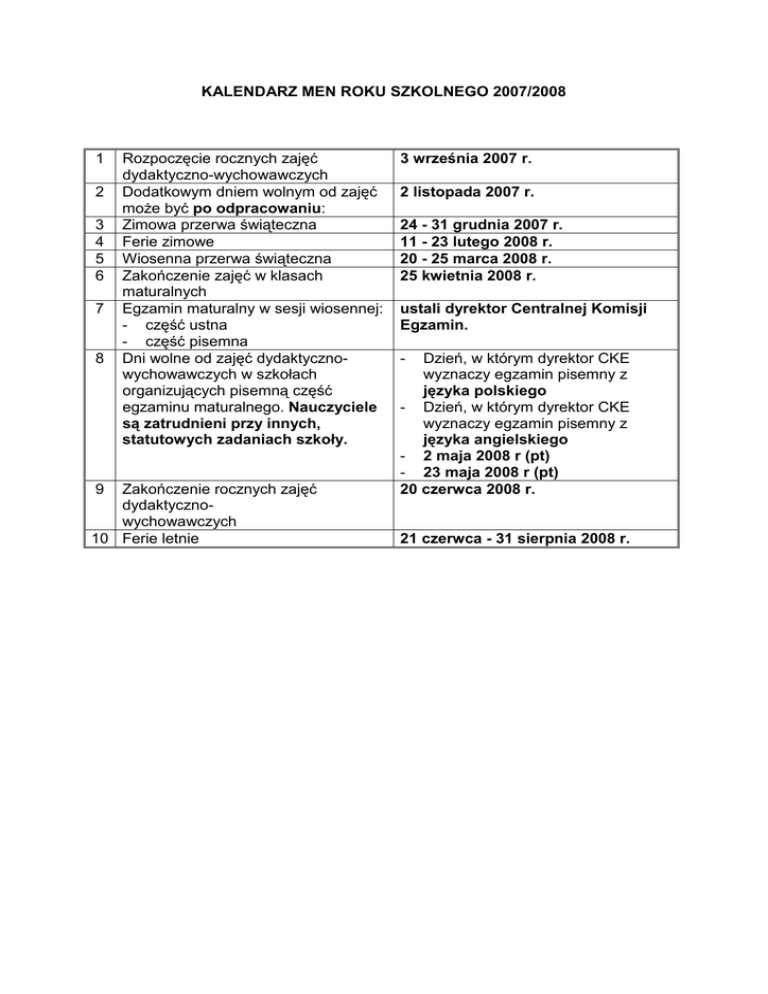 KALENDARZ MEN ROKU SZKOLNEGO 2007/2008 1 2 3 4 5 6 7 8 9 Rozpoczęcie rocznych zajęć dydaktyczno-wychowawczych Dodatkowym dniem wolnym od zajęć moŜe być po odpracowaniu: Zimowa przerwa świąteczna Ferie zimowe Wiosenna przerwa świąteczna Zakończenie zajęć w klasach maturalnych Egzamin maturalny w sesji wiosennej: - część ustna - część pisemna Dni wolne od zajęć dydaktycznowychowawczych w szkołach organizujących pisemną część egzaminu maturalnego. Nauczyciele są zatrudnieni przy innych, statutowych zadaniach szkoły. Zakończenie rocznych zajęć dydaktycznowychowawczych 10 Ferie letnie 3 września 2007 r. 2 listopada 2007 r. 24 - 31 grudnia 2007 r. 11 - 23 lutego 2008 r. 20 - 25 marca 2008 r. 25 kwietnia 2008 r. ustali dyrektor Centralnej Komisji Egzamin. - Dzień, w którym dyrektor CKE wyznaczy egzamin pisemny z języka polskiego - Dzień, w którym dyrektor CKE wyznaczy egzamin pisemny z języka angielskiego - 2 maja 2008 r (pt) - 23 maja 2008 r (pt) 20 czerwca 2008 r. 21 czerwca - 31 sierpnia 2008 r.