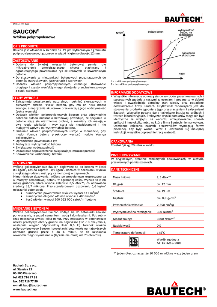 BCN 1/1 luty 2009 BAUCON® Włókna polipropylenowe OPIS PRODUKTU Baucon jest włóknem o średnicy ok. 19 µm wytłaczanym z granulatu polipropylenowego, łączonego w wiązki i cięte na długość 12 mm. ZASTOSOWANIE Dodane do świeżej mieszanki betonowej pełnią rolę mikrozbrojenia zmniejszającego skurcz plastyczny i ograniczającego powstawania rys skurczowych w stwardniałym betonie. Do stosowania w mieszankach betonowych przeznaczonych do betonów natryskowych, jastrychach i zaprawach Dodatek włókien polipropylenowych eliminuje stosowanie drogiego i często nieefektywnego zbrojenia przeciwskurczowego z siatki stalowej. CECHY WYROBU Zatrzymuje powstawanie naturalnych pęknięć skurczowych w pierwszym okresie "życia" betonu, gdy ma on niski moduł Younga, a naprężenia skurczowe przekraczają jego wytrzymałość (patrz rysunek) Dodatek włókien polipropylenowych Baucon oraz odpowiednie dobranie składu mieszanki betonowej powoduje, że spękania w betonie stają się niezmiernie drobne, a rozmiary ich maleją o dwa rzędy wielkości i rysy stają się niewidocznymi i nie mającymi wpływu na wytrzymałość betonu. Działanie włókien polipropylenowych ustaje w momencie, gdy moduł Younga betonu przekroczy wartość modułu Younga polipropylenu. Ograniczenie powstawania rys Podwyższa wytrzymałość betonu Zwiększona wodoszczelność Dodatkowe napowietrzenie zwiększające mrozoodporność Spowolnienie karbonizacji betonu DOZOWANIE Włókna polipropylenowe Baucon dodawane są do betonu w ilości 0,6 kg/m3, zaś do zapraw - 0,9 kg/m3. Różnica w dozowaniu wynika z większego udziału matrycy cementowej w zaprawach. Mimo niskiego dozowania, włókna polipropylenowe rozproszone są w matrycy cementowej betonu w ogromnej ilości. Wynika to z ich małej grubości, która wynosi zaledwie 2,5 dtex*', co odpowiada średnicy 18,7 mikrona. Przy standardowym dozowaniu 0,6 kg/m3 mieszanki betonowej: sumaryczna powierzchnia włókien wynosi 141 m2/m3 sumaryczna długość włókien wynosi 2 400 km/m3 ilość włókien wynosi 200 062 000 sztuk/m3 betonu MIESZANIE Z BETONEM Włókna polipropylenowe Baucon dodaje się do betoniarki zawsze po kruszywie, a przed cementem, wodą i domieszkami. Potrzebny czas mieszania wynosi kilka minut. Przy mieszaniu w betonowozie należy przełączyć obroty gruszki na najwyższe (12 -18 obr./min.), następnie wsypać odpowiednią ilość 0,6 kg torebek włókna polipropylenowego Baucon i pozostawić betonowóz na najwyższych obrotach gruszki przez 4 do 6 minut, aż do uzyskania równomiernego wymieszania (łącznie nie mniej niż 70 obrotów). 1 - z włóknem polipropylenowym 2 - bez włókna polipropylenowego INFORMACJE DODATKOWE Wszystkie informacje odnoszą się do wyrobów przechowywanych i stosowanych zgodnie z naszymi zaleceniami i podane są w dobrej wierze i uwzględniają aktualny stan wiedzy oraz posiadane doświadczenie firmy Bautech. Użytkownik zobowiązany jest do stosowania produktu zgodnie z jego przeznaczeniem i zaleceniami Bautech. Wszystkie podane dane techniczne bazują na próbach i testach laboratoryjnych. Praktyczne wyniki pomiarów mogą nie być identyczne ze względu na warunki, umiejscowienie, sposób aplikacji i inne okoliczności, na które firma Bautech nie ma wpływu. Odmienne zalecania naszych pracowników wymagają formy pisemnej, aby były ważne. Wraz z ukazaniem się niniejszej instrukcji, wszystkie poprzednie tracą ważność. OPAKOWANIA Torebki 0,6 kg, 20 sztuk w worku PRZECHOWYWANIE W oryginalnych, szczelnie zamkniętych opakowaniach, w suchych, przewiewnych pomieszczeniach. DANE TECHNICZNE Masa liniowa: 2,5 dtex*' Długość Średnica Gęstość Powierzchnia właściwa Wytrzymałość na rozciąganie Moduł Younga Nasiąkliwość Temperatura deformacji ok. 12 mm ok. 19 µm ok. 0,9 g/cm3 2 350 cm2/g 350 N/mm2 3500 N/mm2 0% 145oC Wyrób zgodny z AT-15-4252/2006 *' jeden dtex oznacza, że 10 000 m włókna waży jeden gram Bautech Sp. z o.o. ul. Staszica 25 05‐500 Piaseczno tel. 022 716 77 91 fax. 022 716 77 90 e‐mail: [email protected] www.bautech.eu
