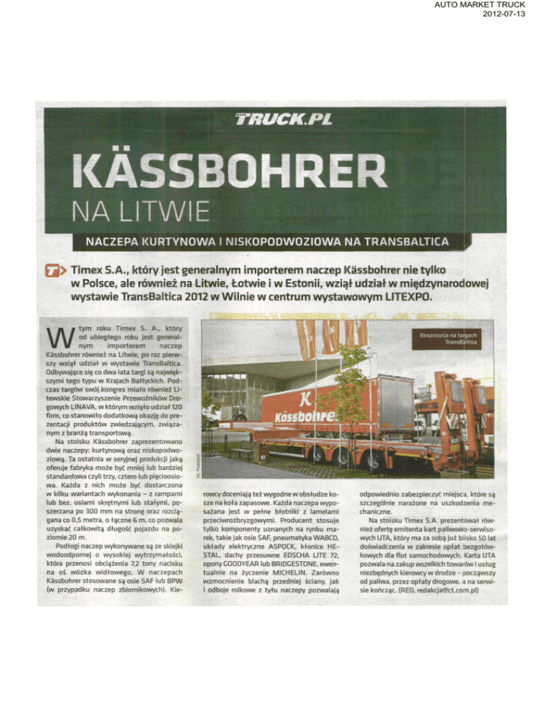 AUTO MARKET TRUCK 2012-07-13 TRUCK.PL KASSBOHRER NA LITWIE NACZEPA KURTYNOWA I NISKOPODWOZIOWA NA TRANSBALTICA £J> Timex S.A., który jest generalnym importerem naczep Kassbohrer nie tylko w Polsce, ale również na Litwie, Łotwie i w Estonii, wziął udział w międzynarodowej wystawie TransBaltica 2012 w Wilnie w centrum wystawowym LITEXPO. tym roku Timex S. A., który od ubiegłego roku jest general nym importerem naczep Kassbohrer również na Litwie, po raz pierw szy wziął udział w wystawie TransBaltica. Odbywające się co dwa lata targi są najwięk szymi tego typu w Krajach Bałtyckich. Pod czas targów swój kongres miało również Li tewskie Stowarzyszenie Przewoźników Dro gowych LINAVA, w którym wzięło udział 120 firm, co stanowiło dodatkową okazję do pre zentacji produktów zwiedzającym, związa nym z branżą transportową. Na stoisku Kassbohrer zaprezentowano dwie naczepy: kurtynową oraz niskopodwoziową. Ta ostatnia w seryjnej produkcji jaką oferuje fabryka może być mniej lub bardziej standardowa czyli trzy, cztero lub pięcioosiowa. Każda z nich może być dostarczona w kilku wariantach wykonania - z rampami lub bez, osiami skrętnymi lub stałymi, po szerzana po 300 mm na stronę oraz rozcią gana co 0,5 metra, o łączne 6 m, co pozwala uzyskać całkowitą długość pojazdu na po ziomie 20 m. Podłogi naczep wykonywane są ze sklejki wodoodpornej o wysokiej wytrzymałości, która przenosi obciążenia 7,2 tony nacisku na oś wózka widłowego. W naczepach Kassbohrer stosowane są osie SAF lub BPW (w przypadku naczep zbiornikowych). Kie- W Ekspozycja na tarcach TransBaltica * rowcy doceniają też wygodne w obsłudze ko sze na koła zapasowe. Każda naczepa wypo sażana jest w pełne błotniki z lamelami przeciwrozbryzgowymi. Producent stosuje tylko komponenty uznanych na rynku ma rek, takie jak osie SAF, pneumatyka WABCO, układy elektryczne ASPOCK, kłonice HESTAL, dachy przesuwne EDSCHA LITE 72, opony GOODYEAR lub BRIDGESTONE, ewen tualnie na życzenie MICHELIN. Zarówno wzmocnienie blachą przedniej ściany, jak i odboje rolkowe z tyłu naczepy pozwalają odpowiednio zabezpieczyć miejsca, które są szczególnie narażone na uszkodzenia me chaniczne. Na stoisku Timex S.A. prezentował rów nież ofertę emitenta kart paliwowo-serwisowych UTA, który ma za sobą już blisko 50 lat doświadczenia w zakresie opłat bezgotów kowych dla flot samochodowych. Karta UTA pozwala na zakup wszelkich towarów i usług niezbędnych kierowcy w drodze - począwszy od paliwa, przez opłaty drogowe, a na serwi sie kończąc. (RED, [email protected])