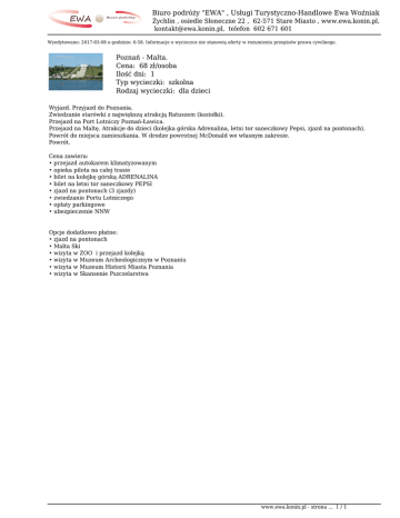 Biuro podróży "EWA" , Usługi Turystyczno-Handlowe Ewa Woźniak Żychlin , osiedle Słoneczne 22 , 62-571 Stare Miasto , www.ewa.konin.pl, [email protected], telefon 602 671 601 Wyedytowano: 2017-03-08 o godzinie: 6-58. Informacje o wycieczce nie stanowią oferty w rozumieniu przepisów prawa cywilnego. Poznań - Malta. Cena: 68 zł/osoba Ilość dni: 1 Typ wycieczki: szkolna Rodzaj wycieczki: dla dzieci Wyjazd. Przyjazd do Poznania. Zwiedzanie starówki z największą atrakcją Ratuszem (koziołki). Przejazd na Port Lotniczy Poznań-Ławica. Przejazd na Maltę. Atrakcje do dzieci (kolejka górska Adrenalina, letni tor saneczkowy Pepsi, zjazd na pontonach). Powrót do miejsca zamieszkania. W drodze powrotnej McDonald we własnym zakresie. Powrót. Cena zawiera: • przejazd autokarem klimatyzowanym • opieka pilota na całej trasie • bilet na kolejkę górską ADRENALINA • bilet na letni tor saneczkowy PEPSI • zjazd na pontonach (3 zjazdy) • zwiedzanie Portu Lotniczego • opłaty parkingowe • ubezpieczenie NNW Opcje dodatkowo płatne: • zjazd na pontonach • Malta Ski • wizyta w ZOO i przejazd kolejką • wizyta w Muzeum Archeologicznym w Poznaniu • wizyta w Muzeum Historii Miasta Poznania • wizyta w Skansenie Pszczelarstwa www.ewa.konin.pl - strona ... 1 / 1