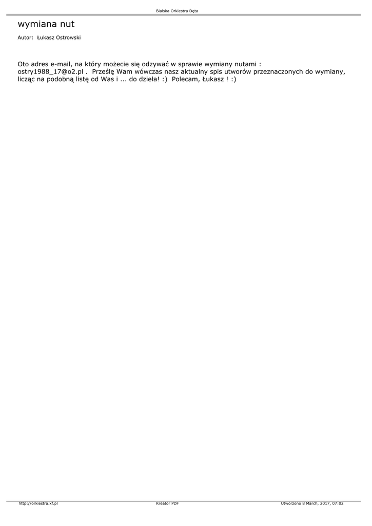 Bialska Orkiestra Dęta wymiana nut Autor: Łukasz Ostrowski Oto adres e-mail, na który możecie się odzywać w sprawie wymiany nutami : [email protected] . Prześlę Wam wówczas nasz aktualny spis utworów przeznaczonych do wymiany, licząc na podobną listę od Was i ... do dzieła! :) Polecam, Łukasz ! :) http://orkiestra.xf.pl Kreator PDF Utworzono 8 March, 2017, 07:02