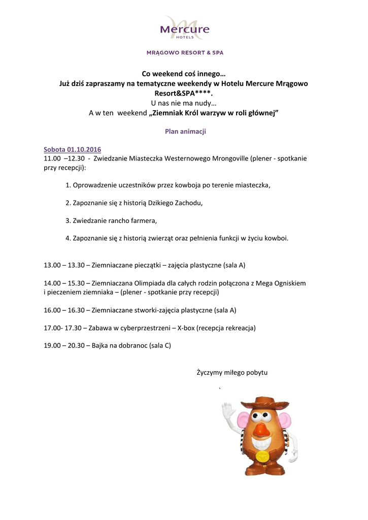 Co weekend coś innego… Już dziś zapraszamy na tematyczne weekendy w Hotelu Mercure Mrągowo Resort&SPA****. U nas nie ma nudy… A w ten weekend „Ziemniak Król warzyw w roli głównej” Plan animacji Sobota 01.10.2016 11.00 –12.30 - Zwiedzanie Miasteczka Westernowego Mrongoville (plener - spotkanie przy recepcji): 1. Oprowadzenie uczestników przez kowboja po terenie miasteczka, 2. Zapoznanie się z historią Dzikiego Zachodu, 3. Zwiedzanie rancho farmera, 4. Zapoznanie się z historią zwierząt oraz pełnienia funkcji w życiu kowboi. 13.00 – 13.30 – Ziemniaczane pieczątki – zajęcia plastyczne (sala A) 14.00 – 15.30 – Ziemniaczana Olimpiada dla całych rodzin połączona z Mega Ogniskiem i pieczeniem ziemniaka – (plener - spotkanie przy recepcji) 16.00 – 16.30 – Ziemniaczane stworki-zajęcia plastyczne (sala A) 17.00- 17.30 – Zabawa w cyberprzestrzeni – X-box (recepcja rekreacja) 19.00 – 20.30 – Bajka na dobranoc (sala C) Życzymy miłego pobytu `