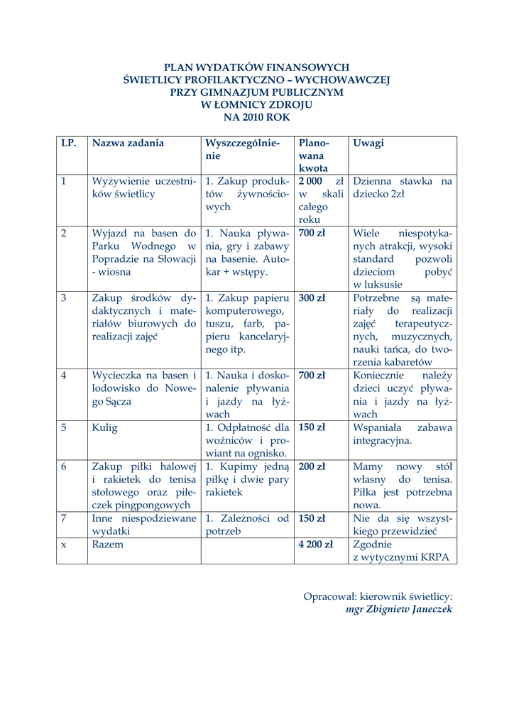 PLAN WYDATKÓW FINANSOWYCH ŚWIETLICY PROFILAKTYCZNO – WYCHOWAWCZEJ PRZY GIMNAZJUM PUBLICZNYM W ŁOMNICY ZDROJU NA 2010 ROK LP. Nazwa zadania 1 Wyżywienie uczestników świetlicy 2 Wyjazd na basen do Parku Wodnego w Popradzie na Słowacji - wiosna 3 Zakup środków dydaktycznych i materiałów biurowych do realizacji zajęć 4 Wycieczka na basen i 1. Nauka i doskolodowisko do Nowe- nalenie pływania go Sącza i jazdy na łyżwach Kulig 1. Odpłatność dla woźniców i prowiant na ognisko. Zakup piłki halowej 1. Kupimy jedną i rakietek do tenisa piłkę i dwie pary stołowego oraz piłe- rakietek czek pingpongowych Inne niespodziewane 1. Zależności od wydatki potrzeb Razem 5 6 7 x Wyszczególnienie Planowana kwota 1. Zakup produk- 2 000 zł tów żywnościo- w skali wych całego roku 1. Nauka pływa- 700 zł nia, gry i zabawy na basenie. Autokar + wstępy. 1. Zakup papieru 300 zł komputerowego, tuszu, farb, papieru kancelaryjnego itp. 700 zł 150 zł 200 zł 150 zł 4 200 zł Uwagi Dzienna stawka na dziecko 2zł Wiele niespotykanych atrakcji, wysoki standard pozwoli dzieciom pobyć w luksusie Potrzebne są materiały do realizacji zajęć terapeutycznych, muzycznych, nauki tańca, do tworzenia kabaretów Koniecznie należy dzieci uczyć pływania i jazdy na łyżwach Wspaniała zabawa integracyjna. Mamy nowy stół własny do tenisa. Piłka jest potrzebna nowa. Nie da się wszystkiego przewidzieć Zgodnie z wytycznymi KRPA Opracował: kierownik świetlicy: mgr Zbigniew Janeczek