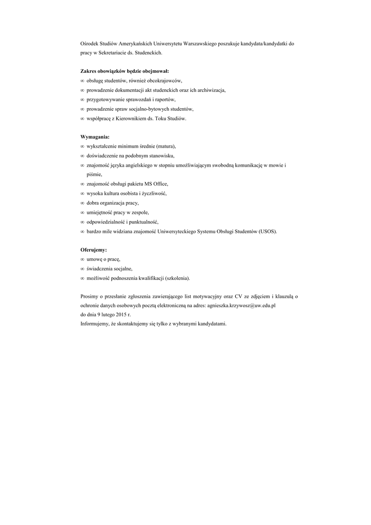 Ośrodek Studiów Amerykańskich Uniwersytetu Warszawskiego poszukuje kandydata/kandydatki do pracy w Sekretariacie ds. Studenckich. Zakres obowiązków będzie obejmował: • obsługę studentów, równieŜ obcokrajowców, • prowadzenie dokumentacji akt studenckich oraz ich archiwizacja, • przygotowywanie sprawozdań i raportów, • prowadzenie spraw socjalno-bytowych studentów, • współpracę z Kierownikiem ds. Toku Studiów. Wymagania: • wykształcenie minimum średnie (matura), • doświadczenie na podobnym stanowisku, • znajomość języka angielskiego w stopniu umoŜliwiającym swobodną komunikację w mowie i piśmie, • znajomość obsługi pakietu MS Office, • wysoka kultura osobista i Ŝyczliwość, • dobra organizacja pracy, • umiejętność pracy w zespole, • odpowiedzialność i punktualność, • bardzo mile widziana znajomość Uniwersyteckiego Systemu Obsługi Studentów (USOS). Oferujemy: • umowę o pracę, • świadczenia socjalne, • moŜliwość podnoszenia kwalifikacji (szkolenia). Prosimy o przesłanie zgłoszenia zawierającego list motywacyjny oraz CV ze zdjęciem i klauzulą o ochronie danych osobowych pocztą elektroniczną na adres: [email protected] do dnia 9 lutego 2015 r. Informujemy, Ŝe skontaktujemy się tylko z wybranymi kandydatami.