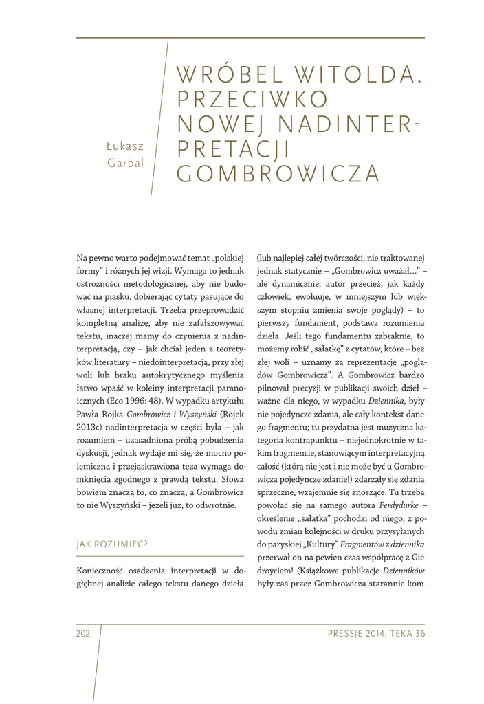 Łukasz Garbal wróbel witolda. przeciwko nowej nadinterp r e ta c j i gombrowicza Na pewno warto podejmować temat „polskiej formy” i różnych jej wizji. Wymaga to jednak ostrożności metodologicznej, aby nie budować na piasku, dobierając cytaty pasujące do własnej interpretacji. Trzeba przeprowadzić kompletną analizę, aby nie zafałszowywać tekstu, inaczej mamy do czynienia z nadinterpretacją, czy – jak chciał jeden z teoretyków literatury – niedointerpretacją, przy złej woli lub braku autokrytycznego myślenia łatwo wpaść w koleiny interpretacji paranoicznych (Eco 1996: 48). W wypadku artykułu Pawła Rojka Gombrowicz i Wyszyński (Rojek 2013c) nadinterpretacja w części była – jak rozumiem – uzasadniona próbą pobudzenia dyskusji, jednak wydaje mi się, że mocno polemiczna i przejaskrawiona teza wymaga domknięcia zgodnego z prawdą tekstu. Słowa bowiem znaczą to, co znaczą, a Gombrowicz to nie Wyszyński – jeżeli już, to odwrotnie. JAK ROZUMIEĆ? Konieczność osadzenia interpretacji w dogłębnej analizie całego tekstu danego dzieła 202 (lub najlepiej całej twórczości, nie traktowanej jednak statycznie – „Gombrowicz uważał…” – ale dynamicznie; autor przecież, jak każdy człowiek, ewoluuje, w mniejszym lub większym stopniu zmienia swoje poglądy) – to pierwszy fundament, podstawa rozumienia dzieła. Jeśli tego fundamentu zabraknie, to możemy robić „sałatkę” z cytatów, które – bez złej woli – uznamy za reprezentację „poglądów Gombrowicza”. A Gombrowicz bardzo pilnował precyzji w publikacji swoich dzieł – ważne dla niego, w wypadku Dziennika, były nie pojedyncze zdania, ale cały kontekst danego fragmentu; tu przydatna jest muzyczna kategoria kontrapunktu – niejednokrotnie w takim fragmencie, stanowiącym interpretacyjną całość (którą nie jest i nie może być u Gombrowicza pojedyncze zdanie!) zdarzały się zdania sprzeczne, wzajemnie się znoszące. Tu trzeba powołać się na samego autora Ferdydurke – określenie „sałatka” pochodzi od niego; z powodu zmian kolejności w druku przysyłanych do paryskiej „Kultury” Fragmentów z dziennika przerwał on na pewien czas współpracę z Giedroyciem! (Książkowe publikacje Dzienników były zaś przez Gombrowicza starannie kom- PRESSJE 2014, TEKA 36 ponowane i zmieniane w porównaniu z pierwodrukami w miesięczniku – pisał o tym szczegółowo Paweł Rodak). Modelowym przykładem doboru cytatów – w tym przypadku z wyraźnie złej woli – jest wykorzystanie kilku cytatów z Dziennika Gombrowicza przez ówczesnego premiera PRL, Józefa Cyrankiewicza. Pisał o tym sam Gombrowicz – i nie jest to bynajmniej mit, to prawdziwe zdarzenie. W analizie rozpatrywać trzeba całość dzieła, nie zaś wybrany fragment. Drugim fundamentem prawidłowej analizy twórczości jest połączenie ogólnego spojrzenia na całą twórczość z rejestracją szczegółów, które ulegały zmianom; innymi słowy, to zmysł autokrytycyzmu badacza, sprawdzanie, czy tendencje, wizje, „poglądy”, które widzi w danej twórczości były regułą, czy wyjątkiem. Czy stary pisarz pisał to samo, co młody? Czy możemy równolegle cytować Kosmos i Ferdydurke? Czy w ogóle możemy napisać, że „Gombrowicz uważał”, czy „Gombrowicz chciał”?… Cyrankiewicz mówił: „Oto jeden z licznych przykładów upadku tej ekspozytury Polski wczorajszej, kompletnego rozkładu tych, którzy sami siebie nazywają dziś cynicznie I – właśnie – fundament trzeci, czyli „poglą«tymczasowymi Polakami» i wstydzą się swej dy Gombrowicza”. Nie bez powodu to sforpolskości. Na łamach paryskiej «Kultury», mułowanie opatruję cudzysłowem. Przede która stała się ośrodkiem renegackiej my- wszystkim: bronię tekstu i literatury, która śli kosmopolitycznej, czytaliśmy niedawno nie jest publicystyką. W niektórych intertakie oto rozważania na temat wielkich ge- pretacjach z „Pressji” Gombrowicz staje się niuszów polskiej myśli narodowej: «Geniu- bez mała… dydaktykiem. Oczywiście, da sze? Do cholery z tymi geniuszami… Cóż się wywieść poglądy autora, ale szukanie mnie obchodzi Mickiewicz». Albo: «Lubując ich wprost w dziele literackim jest niebezsię własną kulturą obnażamy nasz prymi- pieczne i może być mylące; pisarze mają tywizm…». Autor tych słów, jeden z owych różne furtki dla zamanifestowania swojego emigracyjnych «tymczasowych Polaków» – dystansu. Literatura zaangażowana (rozupodchwytuje z zapałem argumenty wrogich miem przez to teksty literackie z tezą) najnam szowinistów niemieckich spod znaku częściej traci na jakości. W szczególnym zaś Deutschland, Deutschland üeber alles i swa- wypadku Gombrowicza, wciąż „uciekającego styki, kpiąc sobie z «niezupełnie rdzennego z gębą w rękach”, broniącego się przed zaszuKopernika» i «półfrancuskiego Szopena». fladkowaniem – pisanie o jego poglądach jest Znalazłszy przytułek wśród rozkładającej jeszcze bardziej niebezpieczne. Bo ulegliśmy się kultury burżuazyjnego Zachodu, wolą ci jego kreacji; diagnoza Jerzego Jarzębskiepanowie lżyć Mickiewicza i zachłystywać się go1, że wciąż to sam Gombrowicz pozostaje wyleniałym filozofem Bertrandem Russe- „naczelnym gombrowiczologiem” pozostaje lem” (Cyrankiewicz 1953). aktualna – nawet sprzeciwiając się różnym interpretacjom „klasycznym” posługujemy Polemizując z dawnym tekstem – także jed- się, jeśli nie kategoriami, które nam narzucił, nostronnym – Adama Michnika nie warto to „gotowcami”, cytatami-kliszami, „mówiwchodzić w buty Józefa Cyrankiewicza. my Gombrowiczem”. WRÓBEL WITOLDA • ŁUKASZ GARBAL 203 NIE RÓBCIE GO PRYMASEM! pokusie przeinterpretowywania. Jaka jest wymowa dzieł Gombrowicza? Jest nią lęk przed „zdrobnieniem” („upupienie” z Ferdydurke) i zaszufladkowaniem („ugębienie”). Jest to bunt przeciw