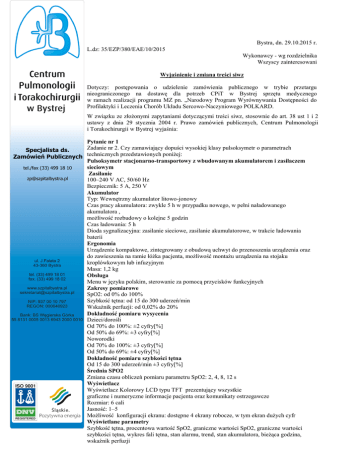 Bystra, dn. 29.10.2015 r. L.dz: 35/EZP/380/EAE/10/2015 Wykonawcy - wg rozdzielnika Wszyscy zainteresowani Wyjaśnienie i zmiana treści siwz Dotyczy: postępowania o udzielenie zamówienia publicznego w trybie przetargu nieograniczonego na dostawę dla potrzeb CPiT w Bystrej sprzętu medycznego w ramach realizacji programu MZ pn. „Narodowy Program Wyrównywania Dostępności do Profilaktyki i Leczenia Chorób Układu Sercowo-Naczyniowego POLKARD. W związku ze złożonymi zapytaniami dotyczącymi treści siwz, stosownie do art. 38 ust 1 i 2 ustawy z dnia 29 stycznia 2004 r. Prawo zamówień publicznych, Centrum Pulmonologii i Torakochirurgii w Bystrej wyjaśnia: Pytanie nr 1 Zadanie nr 2. Czy zamawiający dopuści wysokiej klasy pulsoksymetr o parametrach Specjalista ds. Zamówień Publicznych technicznych przedstawionych poniżej: Pulsoksymetr stacjonarno-transportowy z wbudowanym akumulatorem i zasilaczem sieciowym tel./fax (33) 499 18 10 Zasilanie [email protected] 100–240 V AC, 50/60 Hz Bezpiecznik: 5 A, 250 V Akumulator Typ: Wewnętrzny akumulator litowo-jonowy Czas pracy akumulatora: zwykle 5 h w przypadku nowego, w pełni naładowanego akumulatora , możliwość rozbudowy o kolejne 5 godzin Czas ładowania: 5 h Dioda sygnalizacyjna: zasilanie sieciowe, zasilanie akumulatorowe, w trakcie ładowania baterii Ergonomia Urządzenie kompaktowe, zintegrowany z obudową uchwyt do przenoszenia urządzenia oraz do zawieszenia na ramie łóżka pacjenta, możliwość montażu urządzenia na stojaku kroplówkowym lub infuzyjnym Masa: 1,2 kg Obsługa Menu w języku polskim, sterowanie za pomocą przycisków funkcyjnych Zakresy pomiarowe SpO2: od 0% do 100% Szybkość tętna: od 15 do 300 uderzeń/min Wskaźnik perfuzji: od 0,02% do 20% Dokładność pomiaru wysycenia Dzieci/dorośli Od 70% do 100%: ±2 cyfry[%] Od 50% do 69%: ±3 cyfry[%] Noworodki Od 70% do 100%: ±3 cyfry[%] Od 50% do 69%: ±4 cyfry[%] Dokładność pomiaru szybkości tętna Od 15 do 300 uderzeń/min ±3 cyfry[%] Średnia SPO2 Zmiana czasu obliczeń pomiaru parametru SpO2: 2, 4, 8, 12 s Wyświetlacz Wyświetlacz Kolorowy LCD typu TFT prezentujący wszystkie graficzne i numeryczne informacje pacjenta oraz komunikaty ostrzegawcze Rozmiar: 6 cali Jasność: 1–5 Możliwość konfiguracji ekranu: dostępne 4 ekrany robocze, w tym ekran dużych cyfr Wyświetlane parametry Szybkość tętna, procentowa wartość SpO2, graniczne wartości SpO2, graniczne wartości szybkości tętna, wykres fali tętna, stan alarmu, trend, stan akumulatora, bieżąca godzina, wskaźnik perfuzji Trendy Pamięć: 15 dni, pomiar co 10 s Prezentacja: tabela, wykres Czas trendu: 1–72 h Możliwość wyboru ekranu z jednoczesną prezentacją aktualnych wartości pomiarowych oraz trendów Alarmy 3 poziomy ważności (wysoki, średni, niski) Alarmy dźwiękowe i wizualne dla SPO2 oraz tętna Niezależne wł./wył. alarmów wszystkich parametrów Pauza alarmu dźwiękowego: 30, 60, 90, 120 s z jednoczasowym generowaniem alarmów wizualnych Regulacja głośność alarmu: 0(wył.)–7 Regulacja głośności pulsu: 0(wył.)–7 Alarm rozładowania baterii i konieczności podłączenia zasilania zewnętrznego Alarm dla odłączenia czujnika SPO2 Alarm zdjęcie czujnika SPO2 z palca Widoczne na ekranie ikony aktywnego alarmu, wyciszonego alarmu, wyłączonego alarmu Funkcja alarm info - przy wyciszonym alarmie informacja dźwiękowa o wystąpieniu alarmu podawana co 3 minuty Akcesoria podstawowe Czujnik SpO2 wielorazowego użytku dla dorosłych typu klips Przewód łączący urządzenie z czujnikiem pomiarowym dla każdego urządzenia Przewód zasilający 1 szt. Instrukcja obsługi 1 szt. 1 opakowanie po 24 szt. sensorów jednopacjentowych, sterylnych z zestawem 6 krążków przedłużających żywotność sensora zapakowanych w 1 integralnym opakowaniu z sensorem dla każdego urządzenia Akcesoria opcjonalne Czujnik SpO2 (pediatryczny, noworodkowy) Futerał Przenośna drukarka zewnętrzna Oprogramowanie na PC Zacisk do montażu na stojaku Wyjścia Sygnał wyjściowy RS-232 (port szeregowy) Wymiary 24,5 × 8,4 × 8,5 cm Klasyfikacja urządzenia • IEC60601-1 • EN475 • IPX1 • ISO9919 • EN/IEC60601-1-2 Odpowiedź Zamawiający po zapoznaniu się z treścią pytania nie może wyrazić zgody na dopuszczenie opisanego przedmiotu, pośród wymienionych w pytaniu parametrów sprzętu, który miałby być zaoferowany (dopuszczony), brak wielu wymaganych w SIWZ parametrów technicznych. Wnioskujemy więc, że oferowany przedmiot zamówienia nie posiada np.: technologii umożliwiającej pomiar saturacji u pacjenta o niskiej perfuzji; interfejsu (funkcji) przywołania pielęgniarki; wskaźnika zakłóceń; złącza USB; regulacji czasu opóźnienia reakcji alarmu na zmiany procentowe saturacji Pytanie nr 2 Dotyczy: Zadania nr 2 - PULSOKSYMETR Czy Zamawiający dopuści wysokiej klasy Pulsoksymetr amerykańskiego producenta, w technologii umożliwiającej pomiar „w ruchu” i „przy niskiej perfuzji” dzięki eliminacji artefaktów z krwi żylnej, o następujących parametrach: 1. 2. 3. 4. 5. 6. 7. 8. 9. 10. 11. 12. 13. 14. 15. 16. 17. 18. 19. 20. Pulsoksymetr dla noworodków, dzieci i dorosłych, stacjonarno-transportowy z wbudowanym akumulatorem i zasilaczem sieciowym w technologii Masimo. Zasilanie AC 220 VAC 50 Hz+/-10%, Awaryjne zasilanie z wewnętrznego akumulatora na 7 godzin pracy Waga poniżej 1 kg Zintegrowany z obudową uchwyt do przenoszenia urządzenia Zakres pomiaru saturacji 1-100% Dokładność pomiaru saturacji w zakresie 70% - 100% +/- 3 cyfry 60% - 80% +/- 4 cyfry. Zakres pomiaru pulsu 25 -240 uderzeń na minutę Dokładność pomiaru w całym zakresie +/- 3 bpm Ciągły tryb monitorowania parametrów Wyświetlacz typu LED , z możliwością regulacji kontrastu wyświetlacza Wyświetlanie wartości pulsu i saturacji oraz krzywej pletyzmograficznej w postaci wykresu słupkowego, tzw. SIQ, w przypadku niskiej jakości sygnału (niskich warto