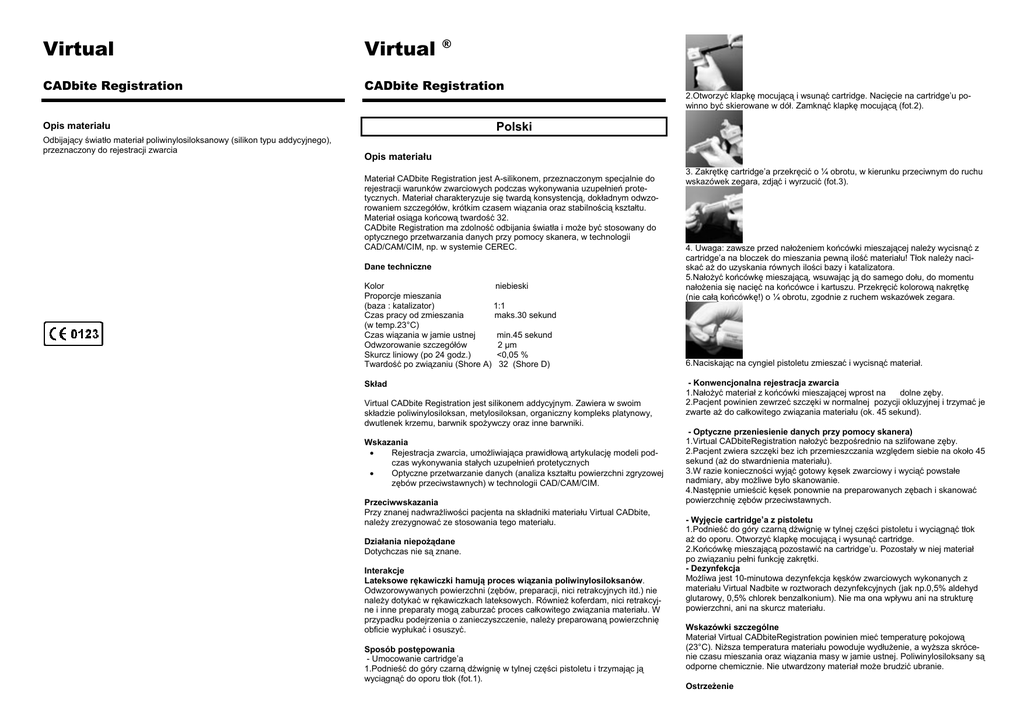 Virtual Virtual CADbite Registration CADbite Registration ® Polski Opis materiału Odbijający światło materiał poliwinylosiloksanowy (silikon typu addycyjnego), przeznaczony do rejestracji zwarcia 2.Otworzyć klapkę mocującą i wsunąć cartridge. Nacięcie na cartridge’u powinno być skierowane w dół. Zamknąć klapkę mocującą (fot.2). Opis materiału Materiał CADbite Registration jest A-silikonem, przeznaczonym specjalnie do rejestracji warunków zwarciowych podczas wykonywania uzupełnień protetycznych. Materiał charakteryzuje się twardą konsystencją, dokładnym odwzorowaniem szczegółów, krótkim czasem wiązania oraz stabilnością kształtu. Materiał osiąga końcową twardość 32. CADbite Registration ma zdolność odbijania światła i może być stosowany do optycznego przetwarzania danych przy pomocy skanera, w technologii CAD/CAM/CIM, np. w systemie CEREC. Dane techniczne Kolor niebieski Proporcje mieszania (baza : katalizator) 1:1 Czas pracy od zmieszania maks.30 sekund (w temp.23°C) Czas wiązania w jamie ustnej min.45 sekund Odwzorowanie szczegółów 2 µm Skurcz liniowy (po 24 godz.) <0,05 % Twardość po związaniu (Shore A) 32 (Shore D) Skład Virtual CADbite Registration jest silikonem addycyjnym. Zawiera w swoim składzie poliwinylosiloksan, metylosiloksan, organiczny kompleks platynowy, dwutlenek krzemu, barwnik spożywczy oraz inne barwniki. Wskazania • Rejestracja zwarcia, umożliwiająca prawidłową artykulację modeli podczas wykonywania stałych uzupełnień protetycznych • Optyczne przetwarzanie danych (analiza kształtu powierzchni zgryzowej zębów przeciwstawnych) w technologii CAD/CAM/CIM. Przeciwwskazania Przy znanej nadwrażliwości pacjenta na składniki materiału Virtual CADbite, należy zrezygnować ze stosowania tego materiału. Działania niepożądane Dotychczas nie są znane. Interakcje Lateksowe rękawiczki hamują proces wiązania poliwinylosiloksanów. Odwzorowywanych powierzchni (zębów, preparacji, nici retrakcyjnych itd.) nie należy dotykać w rękawiczkach lateksowych. Również koferdam, nici retrakcyjne i inne preparaty mogą zaburzać proces całkowitego związania materiału. W przypadku podejrzenia o zanieczyszczenie, należy preparowaną powierzchnię obficie wypłukać i osuszyć. Sposób postępowania - Umocowanie cartridge’a 1.Podnieść do góry czarną dźwignię w tylnej części pistoletu i trzymając ją wyciągnąć do oporu tłok (fot.1). 3. Zakrętkę cartridge’a przekręcić o ¼ obrotu, w kierunku przeciwnym do ruchu wskazówek zegara, zdjąć i wyrzucić (fot.3). 4. Uwaga: zawsze przed nałożeniem końcówki mieszającej należy wycisnąć z cartridge’a na bloczek do mieszania pewną ilość materiału! Tłok należy naciskać aż do uzyskania równych ilości bazy i katalizatora. 5.Nałożyć końcówkę mieszającą, wsuwając ją do samego dołu, do momentu nałożenia się nacięć na końcówce i kartuszu. Przekręcić kolorową nakrętkę (nie całą końcówkę!) o ¼ obrotu, zgodnie z ruchem wskazówek zegara. 6.Naciskając na cyngiel pistoletu zmieszać i wycisnąć materiał. - Konwencjonalna rejestracja zwarcia 1.Nałożyć materiał z końcówki mieszającej wprost na dolne zęby. 2.Pacjent powinien zewrzeć szczęki w normalnej pozycji okluzyjnej i trzymać je zwarte aż do całkowitego związania materiału (ok. 45 sekund). - Optyczne przeniesienie danych przy pomocy skanera) 1.Virtual CADbiteRegistration nałożyć bezpośrednio na szlifowane zęby. 2.Pacjent zwiera szczęki bez ich przemieszczania względem siebie na około 45 sekund (aż do stwardnienia materiału). 3.W razie konieczności wyjąć gotowy kęsek zwarciowy i wyciąć powstałe nadmiary, aby możliwe było skanowanie. 4.Następnie umieścić kęsek ponownie na preparowanych zębach i skanować powierzchnię zębów przeciwstawnych. - Wyjęcie cartridge’a z pistoletu 1.Podnieść do góry czarną dźwignię w tylnej części pistoletu i wyciągnąć tłok aż do oporu. Otworzyć klapkę mocującą i wysunąć cartridge. 2.Końcówkę mieszającą pozostawić na cartridge’u. Pozostały w niej materiał po związaniu pełni funkcję zakrętki. - Dezynfekcja Możliwa jest 10-minutowa dezynfekcja kęsków zwarciowych wykonanych z materiału Virtual Nadbite w roztworach dezynfekcyjnych (jak np.0,5% aldehyd glutarowy, 0,5% chlorek benzalkonium). Nie ma ona wpływu ani na strukturę powierzchni, ani na skurcz materiału. Wskazówki szczególne Materiał Virtual CADbiteRegistration powinien mieć temperaturę pokojową (23°C). Niższa temperatura materiału powoduje wydłużenie, a wyższa skrócenie czasu mieszania oraz wiązania masy w jamie ustnej. Poliwinylosiloksany są odporne chemicznie. Nie utwardzony materiał może brudzić ubranie. Ostrzeżenie W razie przypadkowego kontaktu nie stwardniałego materiału z oczami, należy je natychmiast wypłukać w dużej ilości wody. Przy przedłużającym się podrażnieniu należy skonsultować się z lekarzem. W razie kontaktu materiału ze skórą, należy ją przemyć wodą. Warunki przechowywania - Temperatura przechowywania: 5-28°C - Data ważności: podana na opakowaniu - Materiał przechowywać z dala od źródła ciepła Materiał p[przechowywać w miejscu niedostępnym dla dzieci! Materiał przeznaczony tylko do użytku w stomatologii! Data opracowania informacji: 07/2007 Producent IvoclarVivadent AG FL-9494 Schaan / Lichtenstein Wszelkich informacji udziela: Ivoclar Vivadent Polska Al.Jana Pawła II 78 00-175 Warszawa Infolinia: 0-22 817 11 35 E-mail: [email protected] Materiał został przeznaczony wyłącznie do stosowania w stomatologii. Przy jego stosowaniu należy ściśle przestrzegać instrukcji użycia. Nie ponosi się odpowiedzialności za szkody powstałe na skutek nieprzestrzegania instrukcji lub stosowania niezgodnie z podanymi w instrukcji wskazaniami. Użytkownik odpowiada za testowanie produktu dla swoich własnych celów i za jego