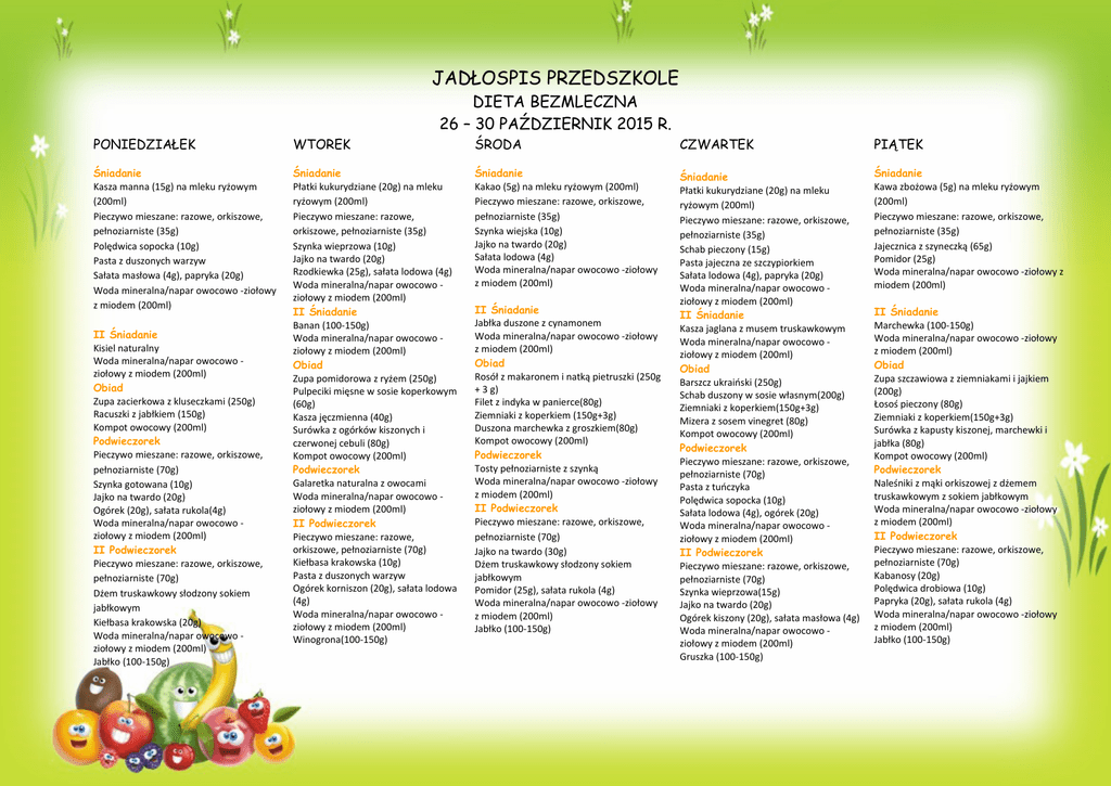 JADŁOSPIS PRZEDSZKOLE DIETA BEZMLECZNA 26 – 30 PAŹDZIERNIK 2015 R. PONIEDZIAŁEK WTOREK ŚRODA CZWARTEK PIĄTEK Śniadanie Kasza manna (15g) na mleku ryżowym (200ml) Pieczywo mieszane: razowe, orkiszowe, pełnoziarniste (35g) Polędwica sopocka (10g) Pasta z duszonych warzyw Sałata masłowa (4g), papryka (20g) Woda mineralna/napar owocowo -ziołowy z miodem (200ml) Śniadanie Płatki kukurydziane (20g) na mleku ryżowym (200ml) Pieczywo mieszane: razowe, orkiszowe, pełnoziarniste (35g) Szynka wieprzowa (10g) Jajko na twardo (20g) Rzodkiewka (25g), sałata lodowa (4g) Woda mineralna/napar owocowo ziołowy z miodem (200ml) II Śniadanie Banan (100-150g) Woda mineralna/napar owocowo ziołowy z miodem (200ml) Obiad Zupa pomidorowa z ryżem (250g) Pulpeciki mięsne w sosie koperkowym (60g) Kasza jęczmienna (40g) Surówka z ogórków kiszonych i czerwonej cebuli (80g) Kompot owocowy (200ml) Podwieczorek Galaretka naturalna z owocami Woda mineralna/napar owocowo ziołowy z miodem (200ml) II Podwieczorek Pieczywo mieszane: razowe, orkiszowe, pełnoziarniste (70g) Kiełbasa krakowska (10g) Pasta z duszonych warzyw Ogórek korniszon (20g), sałata lodowa (4g) Woda mineralna/napar owocowo ziołowy z miodem (200ml) Winogrona(100-150g) Śniadanie Kakao (5g) na mleku ryżowym (200ml) Pieczywo mieszane: razowe, orkiszowe, pełnoziarniste (35g) Szynka wiejska (10g) Jajko na twardo (20g) Sałata lodowa (4g) Woda mineralna/napar owocowo -ziołowy z miodem (200ml) Śniadanie Płatki kukurydziane (20g) na mleku ryżowym (200ml) Pieczywo mieszane: razowe, orkiszowe, pełnoziarniste (35g) Schab pieczony (15g) Pasta jajeczna ze szczypiorkiem Sałata lodowa (4g), papryka (20g) Woda mineralna/napar owocowo ziołowy z miodem (200ml) II Śniadanie Kasza jaglana z musem truskawkowym Woda mineralna/napar owocowo ziołowy z miodem (200ml) Obiad Barszcz ukraiński (250g) Schab duszony w sosie własnym(200g) Ziemniaki z koperkiem(150g+3g) Mizera z sosem vinegret (80g) Kompot owocowy (200ml) Podwieczorek Pieczywo mieszane: razowe, orkiszowe, pełnoziarniste (70g) Pasta z tuńczyka Polędwica sopocka (10g) Sałata lodowa (4g), ogórek (20g) Woda mineralna/napar owocowo ziołowy z miodem (200ml) II Podwieczorek Pieczywo mieszane: razowe, orkiszowe, pełnoziarniste (70g) Szynka wieprzowa(15g) Jajko na twardo (20g) Ogórek kiszony (20g), sałata masłowa (4g) Woda mineralna/napar owocowo ziołowy z miodem (200ml) Gruszka (100-150g) Śniadanie Kawa zbożowa (5g) na mleku ryżowym (200ml) Pieczywo mieszane: razowe, orkiszowe, pełnoziarniste (35g) Jajecznica z szyneczką (65g) Pomidor (25g) Woda mineralna/napar owocowo -ziołowy z miodem (200ml) II Śniadanie Kisiel naturalny Woda mineralna/napar owocowo ziołowy z miodem (200ml) Obiad Zupa zacierkowa z kluseczkami (250g) Racuszki z jabłkiem (150g) Kompot owocowy (200ml) Podwieczorek Pieczywo mieszane: razowe, orkiszowe, pełnoziarniste (70g) Szynka gotowana (10g) Jajko na twardo (20g) Ogórek (20g), sałata rukola(4g) Woda mineralna/napar owocowo ziołowy z miodem (200ml) II Podwieczorek Pieczywo mieszane: razowe, orkiszowe, pełnoziarniste (70g) Dżem truskawkowy słodzony sokiem jabłkowym Kiełbasa krakowska (20g) Woda mineralna/napar owocowo ziołowy z miodem (200ml) Jabłko (100-150g) II Śniadanie Jabłka duszone z cynamonem Woda mineralna/napar owocowo -ziołowy z miodem (200ml) Obiad Rosół z makaronem i natką pietruszki (250g + 3 g) Filet z indyka w panierce(80g) Ziemniaki z koperkiem (150g+3g) Duszona marchewka z groszkiem(80g) Kompot owocowy (200ml) Podwieczorek Tosty pełnoziarniste z szynką Woda mineralna/napar owocowo -ziołowy z miodem (200ml) II Podwieczorek Pieczywo mieszane: razowe, orkiszowe, pełnoziarniste (70g) Jajko na twardo (30g) Dżem truskawkowy słodzony sokiem jabłkowym Pomidor (25g), sałata rukola (4g) Woda mineralna/napar owocowo -ziołowy z miodem (200ml) Jabłko (100-150g) II Śniadanie Marchewka (100-150g) Woda mineralna/napar owocowo -ziołowy z miodem (200ml) Obiad Zupa szczawiowa z ziemniakami i jajkiem (200g) Łosoś pieczony (80g) Ziemniaki z koperkiem(150g+3g) Surówka z kapusty kiszonej, marchewki i jabłka (80g) Kompot owocowy (200ml) Podwieczorek Naleśniki z mąki orkiszowej z dżemem truskawkowym z sokiem jabłkowym Woda mineralna/napar owocowo -ziołowy z miodem (200ml) II Podwieczorek Pieczywo mieszane: razowe, orkiszowe, pełnoziarniste (70g) Kabanosy (20g) Polędwica drobiowa (10g) Papryka (20g), sałata rukola (4g) Woda mineralna/napar owocowo -ziołowy z miodem (200ml) Jabłko (100-150g)