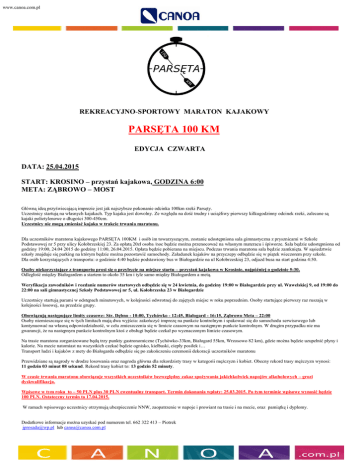 www.canoa.com.pl REKREACYJNO-SPORTOWY MARATON KAJAKOWY PARSĘTA 100 KM EDYCJA CZWARTA DATA: 25.04.2015 START: KROSINO – przystań kajakowa, GODZINA 6:00 META: ZĄBROWO – MOST Główną ideą przyświecającą imprezie jest jak najszybsze pokonanie odcinka 100km rzeki Parsęty. Uczestnicy startują na własnych kajakach. Typ kajaka jest dowolny. Ze względu na dość trudny i uciążliwy pierwszy kilkugodzinny odcinek rzeki, zalecane są kajaki polietylenowe o długości 300-450cm. Uczestnicy nie mogą zmieniać kajaka w trakcie trwania maratonu. Dla uczestników maratonu kajakowego PARSĘTA 100KM i osób im towarzyszącym, zostanie udostępniona sala gimnastyczna z prysznicami w Szkole Podstawowej nr 5 przy ulicy Kołobrzeskiej 23. Za opłatą 20zł osoba /noc będzie można przenocować na własnym materacu i śpiworze. Sala będzie udostępniona od godziny 19:00, 24.04 2015 do godziny 11:00, 26.04.2015. Opłata będzie pobierana na miejscu. Podczas trwania maratonu sala będzie zamknięta. W sąsiedztwie szkoły znajduje się parking na którym będzie można pozostawić samochody. Załadunek kajaków na przyczepy odbędzie się w piątek wieczorem przy szkole. Dla osób korzystających z transportu: o godzinie 4:40 będzie podstawiony bus w Białogardzie na ul Kołobrzeskiej 23, odjazd busa na start godzina 4:50. Osoby niekorzystające z transportu prosi się o przybycie na miejsce startu – przystań kajakowa w Krosinie, najpóźniej o godzinie 5:30. Odległość między Białogardem a startem to około 35 km i tyle samo między Białogardem a metą. Weryfikacja zawodników i rozdanie numerów startowych odbędzie się w 24 kwietnia, do godziny 19:00 w Białogardzie przy ul. Wawelskiej 9, od 19:00 do 22:00 na sali gimnastycznej Szkoły Podstawowej nr 5, ul. Kołobrzeska 23 w Białogardzie Uczestnicy startują parami w odstępach minutowych, w kolejności odwrotnej do zajętych miejsc w roku poprzednim. Osoby startujące pierwszy raz ruszają w kolejności losowej, na przedzie grupy. Obowiązują następujące limity czasowe: Str. Dębno - 10:00, Tychówko - 12:45, Białogard - 16:15, Ząbrowo Meta – 22:00 Osoby niemieszczące się w tych limitach mają dwa wyjścia: zakończyć imprezę na punkcie kontrolnym i spakować się do samochodu serwisowego lub kontynuować na własną odpowiedzialność, w celu zmieszczenia się w limicie czasowym na następnym punkcie kontrolnym. W drugim przypadku nie ma gwarancji, że na następnym punkcie kontrolnym ktoś z obsługi będzie czekał po wyznaczonym limicie czasowym. Na trasie maratonu zorganizowane będą trzy punkty gastronomiczne (Tychówko-33km, Białogard 55km, Wrzosowo 82 km), gdzie można będzie uzupełnić płyny i kalorie. Na mecie natomiast na wszystkich czekać będzie ognisko, kiełbaski, ciepły posiłek i… Transport ludzi i kajaków z mety do Białogardu odbędzie się po zakończeniu ceremonii dekoracji uczestników maratonu Przewidziane są nagrody w drodze losowania oraz nagroda główna dla rekordzisty trasy w kategorii mężczyzn i kobiet. Obecny rekord trasy mężczyzn wynosi: 11 godzin 03 minut 08 sekund. Rekord trasy kobiet to: 13 godzin 52 minuty. W czasie trwania maratonu obowiązuje wszystkich uczestników bezwzględny zakaz spożywania jakichkolwiek napojów alkoholowych – grozi dyskwalifikacja. Wpisowe w tym roku to – 50 PLN plus 30 PLN ewentualny transport. Termin dokonania wpłaty: 25.03.2015. Po tym terminie wpisowe wynosić będzie 100 PLN. Ostateczny termin to 17.04.2015. W ramach wpisowego uczestnicy otrzymują ubezpieczenie NNW, zaopatrzenie w napoje i prowiant na trasie i na mecie, oraz pamiątkę i dyplomy. Dodatkowe informacje można uzyskać pod numerem tel. 662 322 413 – Piotrek [email protected] lub [email protected]