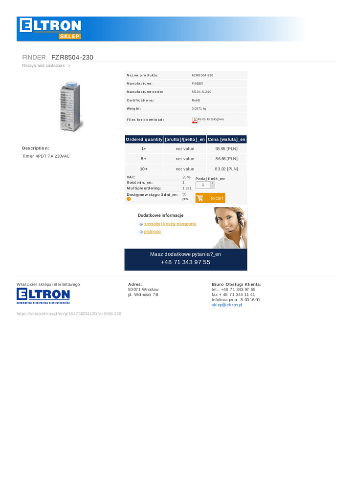 FINDERFZ R8504-230 Rel aysandcontactor s > N a z wa p ro d u ktu : FZ R8 504 -230 M a n u fa c tu rer: FI NDER M a n u fa c tu rerc o d e: 8 5.04 .8 .24 0 C erti fi c a ti o n s : RoHS Wei g h t: 0.0571kg Ka rta ka ta logowa F i l es fo rd o wn l o a d : O rderedqua ntity [brutto ] /[netto ] _en Cena [wa luta ] _en Des criptio n: Ti m er 4PDT7 A230VAC 1+ netval ue 93.95[PLN] 5+ netval ue 8 6.66[PLN] 10 + netval ue 8 3.02[PLN] VAT: Ilośćmin._en: M u ltipleord ering : 23% Pod ajIlość_en: 1 + 1 1sz t. Dostępnewciąg u 3d ni_en: 55 pcs. tocart Maszdodatkowepytania?_en +48713439755 Wł aści ci el skl epui nter netowego: https://skl ep.el tr on.pl /en/p/18 47 50234120/fz r 8 504-230 Adres : 50-07 1Wr ocł aw pl .Wol ności 7 B Biuro O bs ługiKlienta : tel .:+48 7 134397 55 fax+48 7 13441141 Infol i ni apn-pt.8 .00-16.00 skl ep@ el tr on.pl