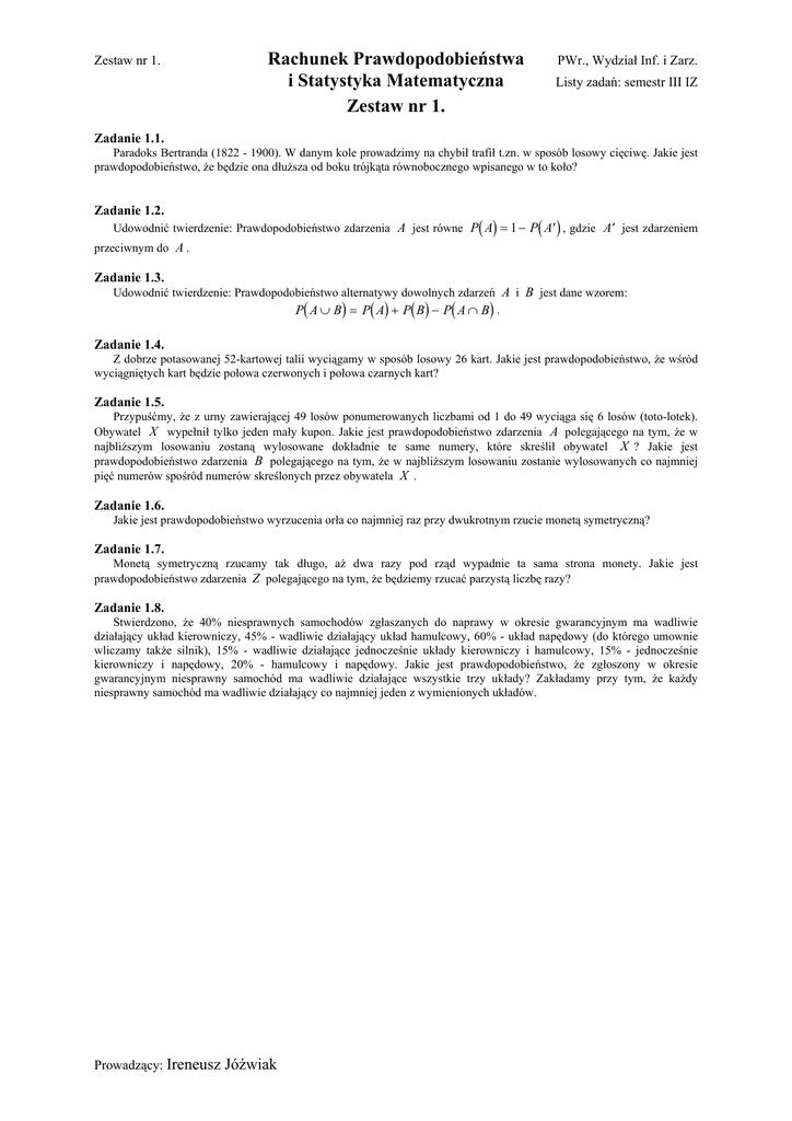 Zestaw nr 1. Rachunek Prawdopodobieństwa i Statystyka Matematyczna Zestaw nr 1. PWr., Wydział Inf. i Zarz. Listy zadań: semestr III IZ Zadanie 1.1. Paradoks Bertranda (1822 - 1900). W danym kole prowadzimy na chybił trafił t.zn. w sposób losowy cięciwę. Jakie jest prawdopodobieństwo, że będzie ona dłuższa od boku trójkąta równobocznego wpisanego w to koło? Zadanie 1.2. Udowodnić twierdzenie: Prawdopodobieństwo zdarzenia A jest równe P( A) = 1 − P( A ′ ) , gdzie A ′ jest zdarzeniem przeciwnym do A . Zadanie 1.3. Udowodnić twierdzenie: Prawdopodobieństwo alternatywy dowolnych zdarzeń A i B jest dane wzorem: P( A ∪ B) = P( A) + P( B) − P( A ∩ B) . Zadanie 1.4. Z dobrze potasowanej 52-kartowej talii wyciągamy w sposób losowy 26 kart. Jakie jest prawdopodobieństwo, że wśród wyciągniętych kart będzie połowa czerwonych i połowa czarnych kart? Zadanie 1.5. Przypuśćmy, że z urny zawierającej 49 losów ponumerowanych liczbami od 1 do 49 wyciąga się 6 losów (toto-lotek). Obywatel X wypełnił tylko jeden mały kupon. Jakie jest prawdopodobieństwo zdarzenia A polegającego na tym, że w najbliższym losowaniu zostaną wylosowane dokładnie te same numery, które skreślił obywatel X ? Jakie jest prawdopodobieństwo zdarzenia B polegającego na tym, że w najbliższym losowaniu zostanie wylosowanych co najmniej pięć numerów spośród numerów skreślonych przez obywatela X . Zadanie 1.6. Jakie jest prawdopodobieństwo wyrzucenia orła co najmniej raz przy dwukrotnym rzucie monetą symetryczną? Zadanie 1.7. Monetą symetryczną rzucamy tak długo, aż dwa razy pod rząd wypadnie ta sama strona monety. Jakie jest prawdopodobieństwo zdarzenia Z polegającego na tym, że będziemy rzucać parzystą liczbę razy? Zadanie 1.8. Stwierdzono, że 40% niesprawnych samochodów zgłaszanych do naprawy w okresie gwarancyjnym ma wadliwie działający układ kierowniczy, 45% - wadliwie działający układ hamulcowy, 60% - układ napędowy (do którego umownie wliczamy także silnik), 15% - wadliwie działające jednocześnie układy kierowniczy i hamulcowy, 15% - jednocześnie kierowniczy i napędowy, 20% - hamulcowy i napędowy. Jakie jest prawdopodobieństwo, że zgłoszony w okresie gwarancyjnym niesprawny samochód ma wadliwie działające wszystkie trzy układy? Zakładamy przy tym, że każdy niesprawny samochód ma wadliwie działający co najmniej jeden z wymienionych układów. Prowadzący: Ireneusz Jóźwiak