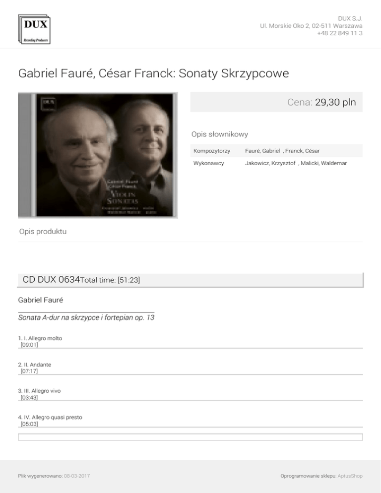 DUX S.J. Ul. Morskie Oko 2, 02-511 Warszawa +48 22 849 11 3 Gabriel Fauré, César Franck: Sonaty Skrzypcowe Cena: 29,30 pln Opis słownikowy Kompozytorzy Fauré, Gabriel ∎, Franck, César ∎ Wykonawcy Jakowicz, Krzysztof ∎, Malicki, Waldemar ∎ Opis produktu CD DUX 0634Total time: [51:23] Gabriel Fauré Sonata A-dur na skrzypce i fortepian op. 13 1. I. Allegro molto [09:01] 2. II. Andante [07:17] 3. III. Allegro vivo [03:43] 4. IV. Allegro quasi presto [05:03] Plik wygenerowano: 08-03-2017 Oprogramowanie sklepu: AptusShop DUX S.J. Ul. Morskie Oko 2, 02-511 Warszawa +48 22 849 11 3 César Franck Sonata A-dur na skrzypce i fortepian 5. I. Allegretto ben moderato [05:30] 6. II. Allegro [08:12] 7. III. Recitativo – Fantasia – Ben Moderato [06:47] 8. IV. Allegretto poco mosso [05:40] Wykonawcy: Krzysztof Jakowicz /skrzypce/ Waldemar Malicki /fortepian/ Plik wygenerowano: 08-03-2017 Powered by TCPDF (www.tcpdf.org) Oprogramowanie sklepu: AptusShop