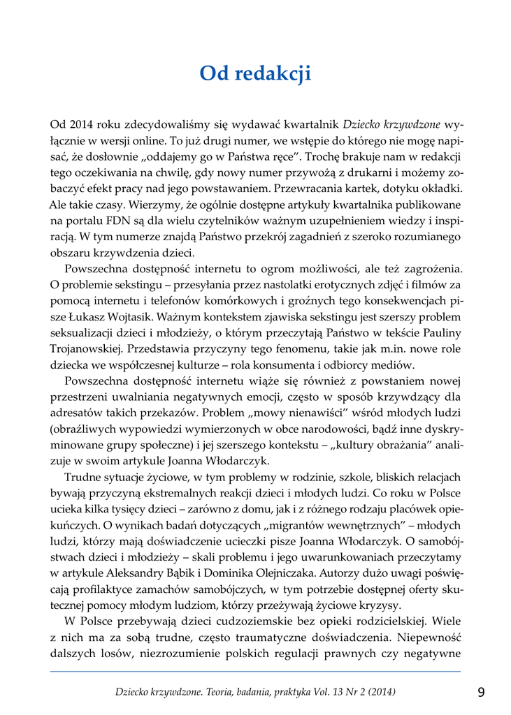 Od redakcji - Dziecko Krzywdzone. Teoria, badania, praktyka