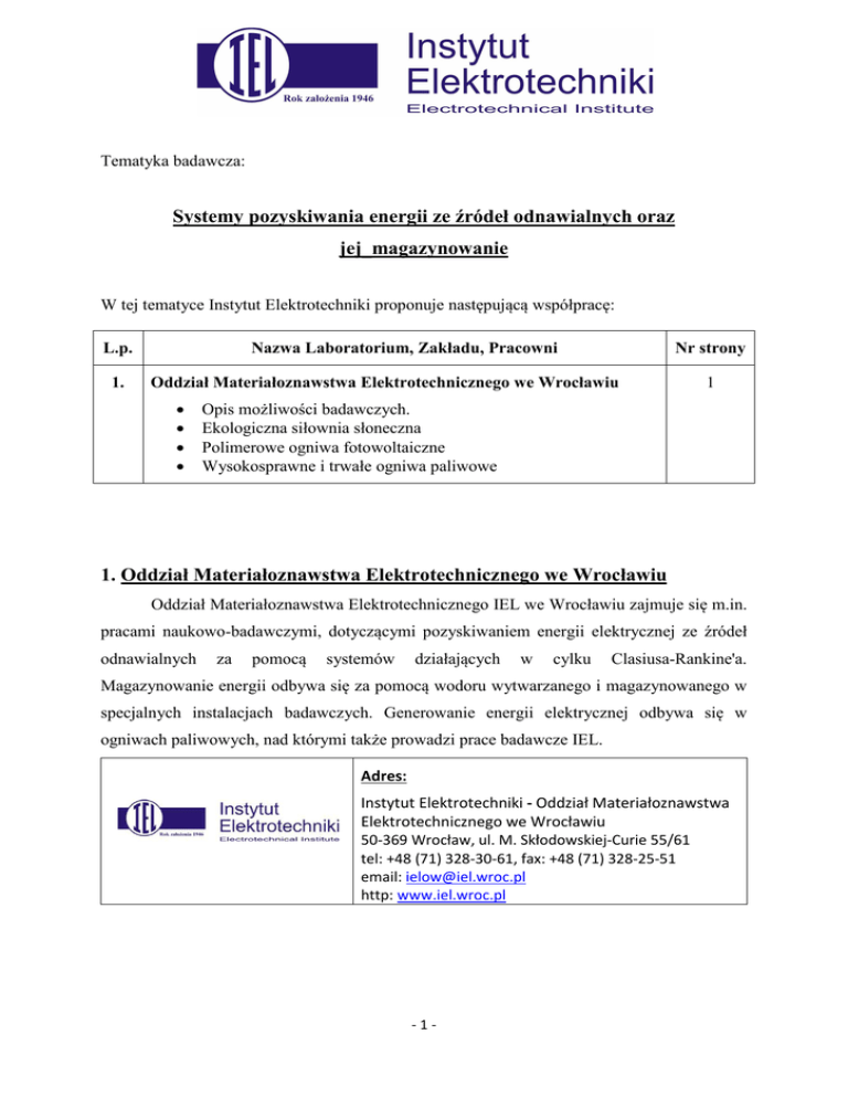 Tematyka badawcza: Systemy pozyskiwania energii ze źródeł odnawialnych oraz jej_magazynowanie W tej tematyce Instytut Elektrotechniki proponuje następującą współpracę: L.p. 1. Nazwa Laboratorium, Zakładu, Pracowni Nr strony Oddział Materiałoznawstwa Elektrotechnicznego we Wrocławiu • • • • 1 Opis możliwości badawczych. Ekologiczna siłownia słoneczna Polimerowe ogniwa fotowoltaiczne Wysokosprawne i trwałe ogniwa paliwowe 1. Oddział Materiałoznawstwa Elektrotechnicznego we Wrocławiu Oddział Materiałoznawstwa Elektrotechnicznego IEL we Wrocławiu zajmuje się m.in. pracami naukowo-badawczymi, dotyczącymi pozyskiwaniem energii elektrycznej ze źródeł odnawialnych za pomocą systemów działających w cylku Clasiusa-Rankine'a. Magazynowanie energii odbywa się za pomocą wodoru wytwarzanego i magazynowanego w specjalnych instalacjach badawczych. Generowanie energii elektrycznej odbywa się w ogniwach paliwowych, nad którymi także prowadzi prace badawcze IEL. Adres: Instytut Elektrotechniki - Oddział Materiałoznawstwa Elektrotechnicznego we Wrocławiu 50-369 Wrocław, ul. M. Skłodowskiej-Curie 55/61 tel: +48 (71) 328-30-61, fax: +48 (71) 328-25-51 email: [email protected] http: www.iel.wroc.pl -1- -2- -3- -4-