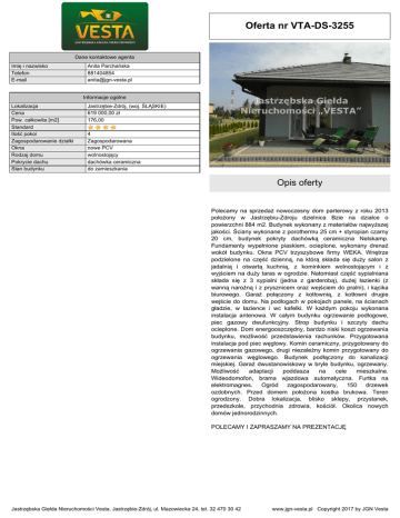 Oferta nr VTA-DS-3255 Dane kontaktowe agenta Imię i nazwisko Telefon E-mail Anita Parchańska 881404854 [email protected] Informacje ogólne Lokalizacja Cena Pow. całkowita [m2] Standard Ilość pokoi Zagospodarowanie działki Okna Rodzaj domu Pokrycie dachu Stan budynku Jastrzębie-Zdrój, (woj. ŚLĄSKIE) 619 000,00 zł 176,00 4 Zagospodarowana nowe PCV wolnostojący dachówka ceramiczna do zamieszkania Opis oferty Polecamy na sprzedaż nowoczesny dom parterowy z roku 2013 położony w Jastrzębiu-Zdroju dzielnica Bzie na działce o powierzchni 884 m2. Budynek wykonany z materiałów najwyższej jakości. Ściany wykonane z porothermu 25 cm + styropian czarny 20 cm, budynek pokryty dachówką ceramiczna Nelskamp. Fundamenty wypełnione piaskiem, ocieplone, wykonany drenaż wokół budynku. Okna PCV trzyszybowe firmy WEKA. Wnętrze podzielone na część dzienną, na którą składa się duży salon z jadalnią i otwartą kuchnią, z kominkiem wolnostojącym i z wyjściem na duży taras w ogrodzie. Natomiast część sypialniana składa się z 3 sypialni (jedna z garderobą), dużej łazienki (z wanną narożną i z prysznicem oraz wejściem do pralni), i kącika biurowego. Garaż połączony z kotłownią, z kotłowni drugie wejście do domu. Na podłogach w pokojach panele, na ścianach gładzie, w łazience i wc kafelki. W każdym pokoju wykonana instalacja antenowa. W całym budynku ogrzewanie podłogowe, piec gazowy dwufunkcyjny. Strop budynku i szczyty dachu ocieplone. Dom energooszczędny, bardzo niski koszt ogrzewania budynku, możliwość przedstawienia rachunków. Przygotowana instalacja pod piec węglowy. Komin ceramiczny, przygotowany do ogrzewania gazowego, drugi niezależny komin przygotowany do ogrzewania węglowego. Budynek podłączony do kanalizacji miejskiej. Garaż dwustanowiskowy w bryle budynku, ogrzewany. Możliwość adaptacji poddasza na cele mieszkalne. Wideodomofon, brama wjazdowa automatyczna. Furtka na elektromagnes. Ogród zagospodarowany, 150 drzewek ozdobnych. Przed domem położona kostka brukowa. Teren ogrodzony. Dobra lokalizacja, blisko sklepy, przystanek, przedszkole, przychodnia zdrowia, kościół. Okolica nowych domów jednorodzinnych. POLECAMY I ZAPRASZAMY NA PREZENTACJĘ Jastrzębska Giełda Nieruchomości Vesta, Jastrzębie-Zdrój, ul. Mazowiecka 24, tel. 32 470 30 42 www.jgn-vesta.pl Copyright 2017 by JGN Vesta