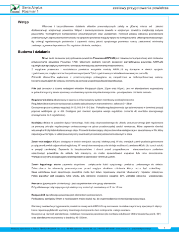Seria Airplus Rozmiar 1 zestawy przygotowania powietrza Wstêp W³aœciwe i bezproblemowe dzia³anie uk³adów pneumatycznych zale¿y w g³ównej mierze od jakoœci dostarczanego sprê¿onego powietrza. Wilgoæ i zanieczyszczenia zawarte w sprê¿onym powietrzu zwiêkszaj¹ zu¿ycie powierzchni wewnêtrznych komponentów pneumatycznych oraz uszczelnieñ. Równie¿ zmiany ciœnienia powodowane zró¿nicowanym zapotrzebowaniem uk³adu na sprê¿one powietrze maj¹ z³y wp³yw na funkcjonowanie uk³adu pneumatycznego. By unikn¹æ wymienionych problemów i zapewniæ dobr¹ jakoœæ sprê¿onego powietrza nale¿y zastosowaæ minimalny zestaw przygotowania powietrza: filtr, regulator ciœnienia, naolejacz. Budowa i dzia³anie Nowa seria zestawów przygotowania powietrza Pneumax AIRPLUS jest rozwiniêciem poprzedniej serii zestawów przygotowania powietrza Pneumax 1700. G³ównymi cechami nowych zestawów przygotowania powietrza AIRPLUS s¹ zwiêkszone przep³ywy nominalne, ³atwiejszy monta¿ przy zachowanej niezawodnoœci. Z wyj¹tkiem presostatu i rozdzielacza powietrza wszystkie modu³y AIRPLUS s¹ dostêpne w dwóch opcjach: z gwintowanymi przy³¹czami technopolimerowymi (seria T) lub z gwintowanymi wk³adkami metalowymi (seria N). Zbiorniki elementów wykonane z przeŸroczystego poliwêglanu s¹ zaopatrzone w technopolimerow¹ os³onê, która mocowana jest do korpusu elementu za pomoc¹ wygodnego z³¹cza bagnetowego. Filtr jest dostêpny z trzema rodzajami wk³adów filtruj¹cych (5µm, 20µm oraz 50µm). Jest on standardowo wyposa¿ony w pó³automatyczny zawór spustowy, uruchamiany rêcznie lub pó³automatycznie - po odprê¿eniu ciœnienia z uk³adu. Regulator ciœnienia zbudowany w oparciu o zrównowa¿ony system membrany o niskiej histerezie. Regulator ciœnienia mo¿e wystêpowaæ z p³asko zabudowanym manometrem o zakresie 0-12 bar. Dostêpne s¹ cztery zakresy regulacji: 0-12; 0-8; 0-4 i 0-2 bar. Pokrêt³o regulacyjne mo¿e byæ zablokowane w dowolnej pozycji poprzez wciœniêcie go w dó³. Dostêpna jest równie¿ specjalna wersja regulatora ciœnienia do monta¿u szeregowego (maksymalnie do 6 regulatorów). Naolejacz dzia³a na zasadzie dyszy Venturiego. Iloœæ oleju doprowadzanego do uk³adu pneumatycznego jest regulowana za pomoc¹ pokrêt³a regulacyjnego umieszczonego na górze przeŸroczystej czêœci naolejacza, która zapewnia równie¿ wizualn¹ kontrolê iloœci dostarczanego oleju. Przewód dostarczaj¹cy olej ze zbiornika naolejacza jest zaopatrzony w filtr, który zapobiega wnikniêciu w uk³ad pneumatyczny ewentualnym zanieczyszczeniom obecnym w oleju. Zawór odcinaj¹cy 3/2 jest dostêpny w dwóch wersjach: rêcznej i elektrycznej. W obu wersjach zawór posiada gwintowane przy³¹cze odpowietrzaj¹ce uk³ad wyjœciowy. W wersji sterowanej rêcznie istnieje mo¿liwoœæ za³o¿enia k³ódki (do trzech sztuk) w pozycji zamkniêtej. Zapewnia to bezpieczeñstwo i chroni przed przypadkowym i nieuprawnionym podaniem sprê¿onego powietrza do uk³adu lub maszyny, co mo¿e spowodowaæ wypadek lub inne zniszczenia. Wersja elektryczna dostêpna jest z elektropilotami o szerokoœci 15mm lub 22mm. Zawór ³agodnego startu zapewnia stopniowe zwiêkszanie iloœci sprê¿onego powietrza podawanego do uk³adu. Zabezpiecza to elementy pneumatyczne przed nag³ym skokiem ciœnienia który mo¿e byæ szkodliwy . Czas narastania iloœci sprê¿onego powietrza mo¿e byæ ³atwo regulowany poprzez wbudowany regulator przep³ywu. Pe³en przep³yw jest osi¹gany tylko wtedy, gdy ciœnienie wyjœciowe osi¹gnie 50% wartoœci ciœnienia wejœciowego. Presostat (prze³¹cznik ciœnieniowy) - jest uzupe³nieniem w/w grupy elementów. Próg ciœnienia prze³¹czaj¹cego styk elektryczny mo¿e byæ nastawiany od 2 do 10 bar. Rozga³êŸnik sprê¿onego powietrza jest elementem pomocniczym. Pod³¹czony pomiêdzy filtrem a naolejaczem mo¿e s³u¿yæ np. do wyprowadzenia nienaolejonego powietrza. Elementy zestawów przygotowania powietrza nowej serii AIRPLUS s¹ mocowane do siebie za pomoc¹ specjalnych z³¹czy które zapewniaj¹ ³atwoœæ wymiany dowolnego komponentu bez rozkrêcania ca³ego zestawu. Dostêpne s¹ równie¿ standardowe, metalowe mocowania panelowe (do monta¿u reduktorów i filtroreduktorów pod k. 90°) oraz standardowe manometry o œrednicy 40 i 50mm. Wy³¹czny dystrybutor w Polsce: RECTUS POLSKA Sp. z o.o. 43-426 Dêbowiec, Gumna 96 ; tel. (+48 033) 857 98 00 ; www.pneumax.pl ; [email protected] 1 2 Seria Airplus Rozmiar 1 zestawy przygotowania powietrza Wskazówki dotycz¹ce instalacji oraz u¿ytkowania zestawów przygotowania powietrza AIRPLUS: Zestaw przygotowania powietrza musi byæ umieszczony jak najbli¿ej zasilanej powietrzem aplikacji / maszyny. Kierunek przep³ywu sprê¿onego powietrza musi byæ zachowany w nastêpuj¹cy sposób: od wejœcia (gwintowany port oznaczony „IN” ) do wyjœcia (gwintowany port oznaczony „OUT”). Elementy zaopatrzone w zbiorniki (filtry, filtroreduktory, naolejacze) musz¹ byæ montowane pionowo, zbiornikiem skierowanym w dó³. Reduktor ciœnienia mo¿e byæ zamontowany w dowolny sposób. Pojedyncze elementy lub grupy elementów mog¹ byæ zamontowane do konstrukcji lub œciany za pomoc¹ flanszy mocuj¹cej typu „Y”. Reduktory i filtroreduktory ciœnienia mog¹ byæ równie¿ montowane poprzez ocynkowane, stalowe mocowanie. Przed za³o¿eniem metalowego mocowania konieczne jest zdjêcie pokrêt³a regulacyjnego i nakrêtki blokuj¹cej. Wszystkie elementy zestawów przygotowania powietrza musz¹ byæ u¿ywane zgodnie z p o d a n y m i w k a r t a c h k a t a l o g o w y c h p a r a m e t r a m i c i œ n i e n i a i t e m p e r a t u r y. Równie¿ nie mo¿na przekraczaæ maksymalnych momentów z jakimi dokrêcane s¹ z³¹cza. Nale¿y upewniæ siê, czy jasne os³ony korpusów elementów s¹ na miejscu przed podaniem ciœnienia. Pokrywy s¹ konieczne do w³aœciwego zablokowania górnej czêœci elementu zestawu prz