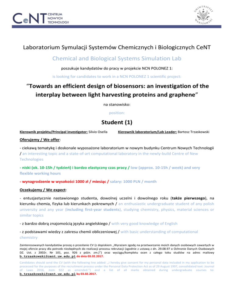 Laboratorium Symulacji Systemów Chemicznych i Biologicznych CeNT Chemical and Biological Systems Simulation Lab poszukuje kandydatów do pracy w projekcie NCN POLONEZ 1: is looking for candidates to work in a NCN POLONEZ 1 scientific project: “Towards an efficient design of biosensors: an investigation of the interplay between light harvesting proteins and graphene” na stanowisko: position: Student (1) Kierownik projektu/Principal investigator: Silvio Osella Kierownik laboratorium/Lab Leader: Bartosz Trzaskowski Oferujemy / We offer: - ciekawą tematykę i doskonale wyposażone laboratorium w nowym budynku Centrum Nowych Technologii / an interesting topic and a state-of-art computational laboratory in the newly-build Centre of New Technologies - niski (ok. 10-15h / tydzień) i bardzo elastyczny czas pracy / low (approx. 10-15h / week) and very flexible working hours - wynagrodzenie w wysokości 1000 zł / miesiąc / salary: 1000 PLN / month Oczekujemy / We expect: - entuzjastycznie nastawionego studenta, dowolnej uczelni i dowolnego roku (także pierwszego), na kierunku chemia, fizyka lub kierunkach pokrewnych / an enthusiastic undergraduate student of any polish university and any year (including first-year students), studying chemistry, physics, material sciences or similar topics - z bardzo dobrą znajomością języka angielskiego / with very good knowledge of English - z podstawami wiedzy z zakresu chemii obliczeniowej / with basic understanding of computational chemistry Zainteresowanych kandydatów proszę o przesłanie CV (z dopiskiem „Wyrażam zgodę na przetwarzanie moich danych osobowych zawartych w mojej ofercie pracy dla potrzeb niezbędnych do realizacji procesu rekrutacji (zgodnie z ustawą z dn. 29.08.97 o Ochronie Danych Osobowych DZ. Ust. z 2002r. Nr 101, poz. 926 z późn. zm.)”) oraz wyciągu/kompletu ocen z całego toku studiów na adres mailowy [email protected] do dnia 03.02.2017. Candidates should send the CV (with the following line added: „I hereby give consent for my personal data included in my application to be processed for the purposes of the recruitment process under the Personal Data Protection Act as of 29 August 1997, consolidated text: Journal of Laws 2016, item 922 as amended.”) and a list of all marks obtained during undergraduate courses to: [email protected] by 03.02.2017.