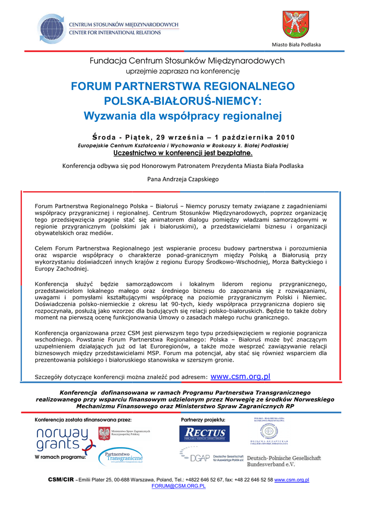 Miasto Biała Podlaska Fundacja Centrum Stosunków Międzynarodowych Mię ędzynarodowych uprzejmie przejmie zaprasza na konferencję FORUM PARTNERSTWA REGIONALNEGO POLSKA POLSKA-BIAŁORUŚ-NIEMCY: Wyzwania dla współpracy regionalnej Środa - Piątek, 29 września – 1 października 2010 Europejskie Centrum Kształcenia i Wychowania w Roskoszy k. Białej Podlaskiej Uczestnictwo czestnictwo w konferencji jest bezpłatne. Konferencja odbywa się pod Honorowym Honorowym Patronatem Prezydenta Miasta Biała Podlaska Pana Andrzeja Czapskiego Forum Partnerstwa Regionalnego Polska – Białoruś – Niemcy poruszy tematy związane z zagadnieniami współpracy przygranicznej i regionalnej. Centrum Stosunków Międzynarodowych, poprzez organizację tego przedsięwzięcia pragnie stać się animatorem animatorem dialogu pomiędzy władzami samorządowymi w regionie przygranicznym (polskimi jak i białoruskimi), a przedstawicielami biznesu i organizacji obywatelskich oraz mediów. Celem Forum Partnerstwa Regionalnego jest wspieranie procesu budowy partnerstwa i porozumienia por oraz wsparcie współpracy o charakterze ponad-granicznym ponad granicznym między Polską a Białorusią przy wykorzystaniu doświadczeń innych krajów z regionu Europy Środkowo-Wschodniej, Środkowo Wschodniej, Morza Bałtyckiego i Europy Zachodniej. Konferencja służyć będzie samorządowcom i lokalnym liderom regionu przygranicznego, przedstawicielom lokalnego małego oraz średniego biznesu do zapoznania się z rozwiązaniami, uwagami i pomysłami kształtującymi współpracę na poziomie przygranicznym Polski i Niemiec. Doświadczenia polsko-niemieckie eckie z okresu lat 90-tych, 90 tych, kiedy współpraca przygraniczna dopiero się rozpoczynała, posłużą jako wzorzec dla budujących się relacji polsko-białoruskich. polsko białoruskich. Będzie to także dobry moment na pierwszą ocenę funkcjonowania Umowy o zasadach małego ruchu granicznego. graniczne Konferencja organizowana przez CSM jest pierwszym tego typu przedsięwzięciem w regionie pogranicza wschodniego. Powstanie Forum Partnerstwa Regionalnego: Polska – Białoruś może być znaczącym uzupełnieniem działających już od lat Euroregionów, a także może wesprzeć zawiązywanie relacji biznesowych między przedstawicielami MSP. Forum ma potencjał, aby stać się również wsparciem dla prezentowania polskiego i białoruskiego stanowiska w szerszym gronie. Szczegóły dotyczące konferencji można znaleźć pod adresem: adr www.csm.org.pl Konferencja dofinansowana w ramach Programu Partnerstwa Transgranicznego realizowanego przy wsparciu finansowym udzielonym przez Norwegię ze środków Norweskiego Mechanizmu Finansowego oraz Ministerstwo Spraw Zagranicznych RP R Konferencja została sfinansowana przez: Partnerzy projektu: W ramach programu: CSM/CIR – Emilii Plater 25, 00-688 688 Warszawa, Poland, Tel.: +4822 646 52 67, fax: +48 22 646 52 58 www.csm.org.pl [email protected] Miasto Biała Podlaska Forum Partnerstwa Regionalnego Polska-Białoruś-Niemcy: Polska Niemcy: Wyzwania dla współpracy regionalnej. 29.09. – 01.10.2010 Roskosz k. BIAŁEJ PODLASKIEJ Miejsce: Roskosz k. Białej Podlaskiej (www.roskosz.pl (www.roskosz.pl) Szczegółowe i aktualne informacje o programie można żna uzyskać na stronie: Dzień ń pierwszy: 29.09.2010 18:00 18:15 – 20:00 Otwarcie konferencji Okrągły ągły stół: dyskusja panelowa: Globalizacja – temat odległy czy bliski? Rola regionów w procesach międzynarodowych? ędzynarodowych? • • • 20:00 Andrzej Czapski – Prezydent Miasta Biała Podlaska Janusz Onyszkiewicz – Członek Rady Programowej Centrum Stosunków Międzynarodowych ędzynarodowych Miraslau Kobasa – Przewodniczący Fundacji im. Lwa Sapiehy Bankiet otwierający ący konferencję Dzień ń drugi: 30.09.2010 Grupa Robocza cza 1. Rozwój małych i średnich ś przedsiębiorstw ę ębiorstw w regionach przygranicznych 10.00 – 11.45 Atrakcyjność ść regionu przygranicznego dla potencjalnych inwestorów • Dr Maciej Nowicki – Instytut Badań nad Gospodarką Rynkową • Edward Kostrubiec – Związek Prywatnych ch Pracodawców Lubelszczyzny • Aliaksandr Ivaczou – Przewodniczący Rady „Agro-Eko-Tur” – Agroturystyczna • Aliaksandr Stralcou – Wykładowca Centrum Komunikacji Biznesowej Europejskiego Uniwersytetu Humanitarnego • Deputowany Parlamentu Rep. Białoruś 11.45 – 13.15 13.15 – 14.45 Obiad Współpraca przygraniczna jako stymulator rozwoju Małej i Średniej Ś Przedsiębiorczości Przedsię ę ś • Mikhail Jukhimiuk – 1. Zastępca ę Przewodniczącego ącego Brzeskiego Wykonawczego Komitetu Obwodowego (TBC) • Anna Bula-Kopańska Bula – Dyrektor departamentu Instrumentów umentów Wsparcia, Ministerstwo Gospodarki RP (TBC) • Valerij Sidarczuk, Docent Białoruskiego Uniwersytetu Państwowego, ństwowego, Specjalista Specj zakresie prawa o małej i średniej ś przedsiębiorczości ę ś • Ivan Ilkievicz – Przewodniczący ą Grodzieńskiego ńskiego Oddziału Republikańskiej Republikań Konferederacji Pracodawców. Konferencja została sfinansowana przez: Partnerzy projektu: W ramach programu: CSM/CIR – Emilii Plater 25, 00-688 688 Warszawa, Poland, Tel.: +4822 646 52 67, fax: +48 22 646 52 58 www.csm.org.pl [email protected] Miasto Biała Podlaska • 14.45 – 15.00 15.00 – 16.30 Kazimierz Zdunowski, Dyrektor Polsko-Białoruskiej Polsko Białoruskiej Izby Handlowo Przemysłowej Przerwa kawowa Polska i Niemcy – rozwój małej i ś średniej przedsiębiorczości ę ści ś w regionach przygranicznych • • Dr. Jacek Robak Roba – Kierownik Wydziału Promocji Inwestycji i Handlu, Ambasada RP w Berlinie (TBC) Radosław adosław Popiela, Popiela Immobilien, Szczecin – Rossov Grupa Robocza 2. Ochrona środowiska naturalnego w regionie przygranicznym: nowe technologie i zmiany klimatu. 10.00 – 11.45 Ochrona środowiska jako problem globalny i ponadnarodowy • Wolfgang Te