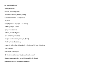 NA OBÓZ ZABIERAMY - dobry humor!!! - śpiwór, poduszkę(jasiek) - dres do spania lub grubszą piżamę - ubrania codzienne i 2 wyjściowe - ręczniki - strój kąpielowy (najlepiej 2 na zmianę) - adidasy, klapki, kalosze - przybory toaletowe - latarka, zeszyt, długopis - coś na komary i kleszcze - czapkę lub chusteczkę (nakrycie głowy) - kurtkę przeciwdeszczową - naczynia (talerzyk płytki, głęboki) – plastikowe lub inne nietłukące lub menażka - sztućce, kubek do picia - 2-wie ściereczki z materiału do wycierania naczyń - kieszonkowe na drobne wydatki (na wyjścia do sklepu) - lekarstwa (jak ktoś przyjmuje codziennie)