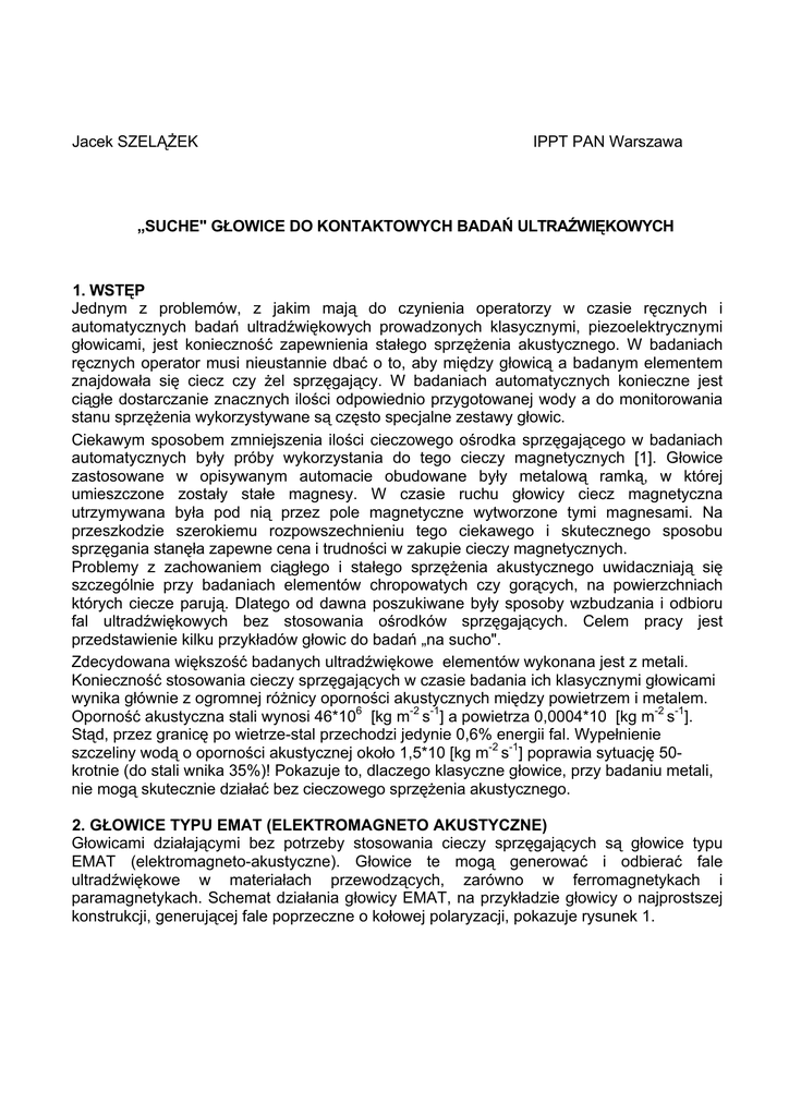 Jacek SZELĄŻEK IPPT PAN Warszawa „SUCHE" GŁOWICE DO KONTAKTOWYCH BADAŃ ULTRAŹWIĘKOWYCH 1. WSTĘP Jednym z problemów, z jakim mają do czynienia operatorzy w czasie ręcznych i automatycznych badań ultradźwiękowych prowadzonych klasycznymi, piezoelektrycznymi głowicami, jest konieczność zapewnienia stałego sprzężenia akustycznego. W badaniach ręcznych operator musi nieustannie dbać o to, aby między głowicą a badanym elementem znajdowała się ciecz czy żel sprzęgający. W badaniach automatycznych konieczne jest ciągłe dostarczanie znacznych ilości odpowiednio przygotowanej wody a do monitorowania stanu sprzężenia wykorzystywane są często specjalne zestawy głowic. Ciekawym sposobem zmniejszenia ilości cieczowego ośrodka sprzęgającego w badaniach automatycznych były próby wykorzystania do tego cieczy magnetycznych [1]. Głowice zastosowane w opisywanym automacie obudowane były metalową ramką, w której umieszczone zostały stałe magnesy. W czasie ruchu głowicy ciecz magnetyczna utrzymywana była pod nią przez pole magnetyczne wytworzone tymi magnesami. Na przeszkodzie szerokiemu rozpowszechnieniu tego ciekawego i skutecznego sposobu sprzęgania stanęła zapewne cena i trudności w zakupie cieczy magnetycznych. Problemy z zachowaniem ciągłego i stałego sprzężenia akustycznego uwidaczniają się szczególnie przy badaniach elementów chropowatych czy gorących, na powierzchniach których ciecze parują. Dlatego od dawna poszukiwane były sposoby wzbudzania i odbioru fal ultradźwiękowych bez stosowania ośrodków sprzęgających. Celem pracy jest przedstawienie kilku przykładów głowic do badań „na sucho". Zdecydowana większość badanych ultradźwiękowe elementów wykonana jest z metali. Konieczność stosowania cieczy sprzęgających w czasie badania ich klasycznymi głowicami wynika głównie z ogromnej różnicy oporności akustycznych między powietrzem i metalem. Oporność akustyczna stali wynosi 46*106 [kg m-2 s-1] a powietrza 0,0004*10 [kg m-2 s-1]. Stąd, przez granicę po wietrze-stal przechodzi jedynie 0,6% energii fal. Wypełnienie szczeliny wodą o oporności akustycznej około 1,5*10 [kg m-2 s-1] poprawia sytuację 50krotnie (do stali wnika 35%)! Pokazuje to, dlaczego klasyczne głowice, przy badaniu metali, nie mogą skutecznie działać bez cieczowego sprzężenia akustycznego. 2. GŁOWICE TYPU EMAT (ELEKTROMAGNETO AKUSTYCZNE) Głowicami działającymi bez potrzeby stosowania cieczy sprzęgających są głowice typu EMAT (elektromagneto-akustyczne). Głowice te mogą generować i odbierać fale ultradźwiękowe w materiałach przewodzących, zarówno w ferromagnetykach i paramagnetykach. Schemat działania głowicy EMAT, na przykładzie głowicy o najprostszej konstrukcji, generującej fale poprzeczne o kołowej polaryzacji, pokazuje rysunek 1. Głowica ta składa się jedynie ze stałego magnesu i spiralnej cewki. Magnes ustawiony jest tak, że linie pola magnetycznego są prostopadłe do powierzchni badanego elementu. Cewka, w której płynie prąd zmienny, znajduje się w szczelinie miedzy magnesem i powierzchnią materiału. Prąd płynący w cewce wzbudza w powierzchniowej warstwie materiału prądy wirowe. Przepływ prądu w materiale znajdującym się w stałym polu magnetycznym jest źródłem siły Lorenza powodującej cykliczne odkształcenia materiału. Odkształcenia te, w tym przypadku równoległe do powierzchni materiału, są źródłem poprzecznej fali rozchodzącej się normalnie do powierzchni i spolaryzowanej kołowo (w kierunku promieniowym, prostopadłym do przewodów cewki). W zależności od wzajemnych kierunków przepływu prądów wirowych, zależnych od ukształtowania cewki, i pola magnetycznego teoretycznie można wzbudzać wszystkie typy fal ultradźwiękowych. Działanie i budowa różnych głowic typu EMAT opisana jest w [2]. Rys. l. Schemat działania głowicy typu EMAT na kołowo spolaryzowane ale poprzczne. Natężenie generowanej fali jest proporcjonalne do natężenia pola magnetycznego i prądów wirowych a skuteczność głowicy gwałtownie spada wraz ze wzrostem szczeliny między głowicą a powierzchnią materiału. Odległość między cewką a powierzchnią zazwyczaj nie przekracza 1mm. Delikatna cewka musi być zabezpieczona przed uszkodzeniem warstwą z tworzywa sztucznego, co w praktyce oznacza, że głowica EMAT musi dotykać powierzchni badanego elementu (badania kontaktowe). Głowicami EMAT skutecznie generowane są fale powierzchniowe, fale poprzeczne rozchodzące się prostopadle do powierzchni i podpowierzchniowe fale poprzeczne typu SH. Ich skuteczność jako głowic normalnych na fale podłużne jest niestety znikoma. W literaturze często opisywane są jedynie zalety głowic typu EMAT takie jak „bezkontaktowy" sposób badania, możliwość ich szybkiego przesuwania czy badania elementów gorących. Niestety głowice te mają również szereg wad ograniczających ich zastosowania. Podstawową wadą jest niska skuteczność. Dla porównania, napięcie, jakie powstaje na okładkach przetwornika piezoelektrycznego przy odbiorze echa dużej wady jest rzędu setek miliwoltów. W przypadku odbioru echa takiej wady głowicą EMAT, w jej cewce indukowane jest napięcie jedynie rzędu setek mikrowoltów, czyli tysiąc razy niższe. Drugą wadą jest wysoki pobór prądu przy generacji fal (w cewce nadawczej konieczne jest wzbudzenie prądu o natężeniu 10-20A). Uniemożliwia to budowę miniaturowej i lekkiej, zasilanej bateryjnie aparatury z głowicami EMAT. Jeszcze inną, rzadko wspominaną a ważną z praktycznego punktu widzenia wadą jest to, że silne stałe magnesy przyciągają wszelkie metaliczne zanieczyszczenia (wiórki, opiłki itp.). Zbierają się one na powierzchni cewki i przy dociśnięciu głowicy do powierzchni materiału mogą być przyczyną uszkodzenia delikatnej cewki. Dlatego wykorzystanie głowic EMAT jest ciągle jeszcze ograniczone do przemysło