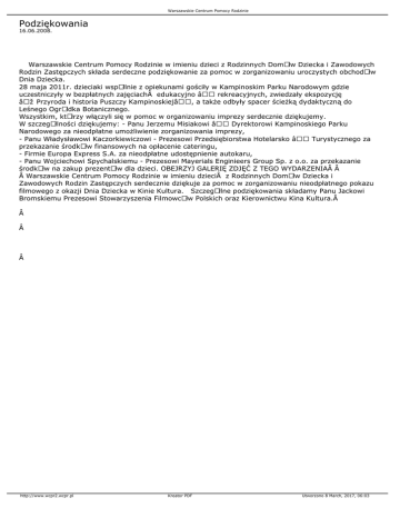 Warszawskie Centrum Pomocy Rodzinie Podziękowania 16.06.2008. Warszawskie Centrum Pomocy Rodzinie w imieniu dzieci z Rodzinnych DomÃłw Dziecka i Zawodowych Rodzin Zastępczych składa serdeczne podziękowanie za pomoc w zorganizowaniu uroczystych obchodÃłw Dnia Dziecka. 28 maja 2011r. dzieciaki wspÃłlnie z opiekunami gościły w Kampinoskim Parku Narodowym gdzie uczestniczyły w bezpłatnych zajęciach edukacyjno – rekreacyjnych, zwiedzały ekspozycję „Przyroda i historia Puszczy Kampinoskiej―, a także odbyły spacer ścieżką dydaktyczną do Leśnego OgrÃłdka Botanicznego. Wszystkim, ktÃłrzy włączyli się w pomoc w organizowaniu imprezy serdecznie dziękujemy. W szczegÃłlności dziękujemy: - Panu Jerzemu Misiakowi – Dyrektorowi Kampinoskiego Parku Narodowego za nieodpłatne umożliwienie zorganizowania imprezy, - Panu Władysławowi Kaczorkiewiczowi - Prezesowi Przedsiębiorstwa Hotelarsko – Turystycznego za przekazanie środkÃłw finansowych na opłacenie cateringu, - Firmie Europa Express S.A. za nieodpłatne udostępnienie autokaru, - Panu Wojciechowi Spychalskiemu - Prezesowi Mayerials Enginieers Group Sp. z o.o. za przekazanie środkÃłw na zakup prezentÃłw dla dzieci. OBEJRZYJ GALERIĘ ZDJĘĆ Z TEGO WYDARZENIA   Warszawskie Centrum Pomocy Rodzinie w imieniu dzieci z Rodzinnych DomÃłw Dziecka i Zawodowych Rodzin Zastępczych serdecznie dziękuje za pomoc w zorganizowaniu nieodpłatnego pokazu filmowego z okazji Dnia Dziecka w Kinie Kultura. SzczegÃłlne podziękowania składamy Panu Jackowi Bromskiemu Prezesowi Stowarzyszenia FilmowcÃłw Polskich oraz Kierownictwu Kina Kultura.    http://www.wcpr2.wcpr.pl Kreator PDF Utworzono 8 March, 2017, 06:03