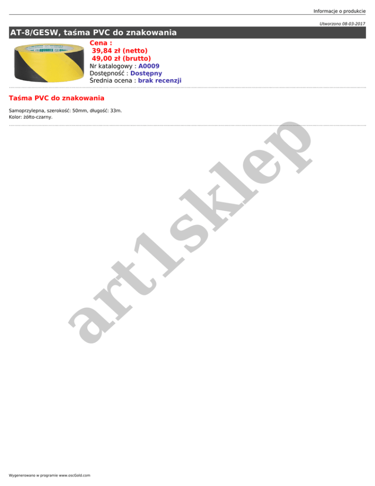 Informacje o produkcie Utworzono 08-03-2017 AT-8/GESW, taśma PVC do znakowania Cena : 39,84 zł (netto) 49,00 zł (brutto) Nr katalogowy : A0009 Dostępność : Dostępny Średnia ocena : brak recenzji Taśma PVC do znakowania ar t1 sk le p Samoprzylepna, szerokość: 50mm, długość: 33m. Kolor: żółto-czarny. Wygenerowano w programie www.oscGold.com