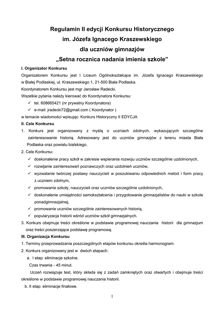 Regulamin II edycji Konkursu Historycznego im. Józefa Ignacego Kraszewskiego dla uczniów gimnazjów „Setna rocznica nadania imienia szkole” I. Organizator Konkursu Organizatorem Konkursu jest I Liceum Ogólnokształcące im. Józefa Ignacego Kraszewskiego w Białej Podlaskiej, ul. Kraszewskiego 1, 21-500 Biała Podlaska. Koordynatorem Konkursu jest mgr Jarosław Radecki. Wszelkie pytania należy kierować do Koordynatora Konkursu: tel. 608665421 (nr prywatny Koordynatora) e-mail: [email protected] ( Koordynator ) w temacie wiadomości wpisując: Konkurs Historyczny II EDYCJA II. Cele Konkursu 1. Konkurs jest organizowany z myślą o uczniach zdolnych, wykazujących szczególne zainteresowanie historią. Adresowany jest do uczniów gimnazjów z terenu miasta Biała Podlaska oraz powiatu bialskiego. 2. Cele Konkursu: doskonalenie pracy szkół w zakresie wspierania rozwoju uczniów szczególnie uzdolnionych, rozwijanie zainteresowań poznawczych oraz uzdolnień uczniów, wyzwalanie twórczej postawy nauczycieli w poszukiwaniu odpowiednich metod i form pracy z uczniem zdolnym, promowanie szkoły, nauczycieli oraz uczniów szczególnie uzdolnionych, doskonalenie umiejętności samokształcenia i przygotowanie gimnazjalistów do nauki w szkole ponadgimnazjalnej, promowanie uczniów szczególnie zainteresowanych historią, popularyzacja historii wśród uczniów szkół gimnazjalnych. 3. Konkurs obejmuje treści określone w podstawie programowej nauczania historii dla gimnazjum oraz treści poszerzające podstawę programową. III. Organizacja Konkursu 1. Terminy przeprowadzania poszczególnych etapów konkursu określa harmonogram. 2. Konkurs organizowany jest w dwóch etapach: a. I etap: eliminacje szkolne. Czas trwania - 45 minut. Uczeń rozwiązuje test, który składa się z zadań zamkniętych oraz otwartych i obejmuje treści określone w podstawie programowej nauczania historii. b. II etap: eliminacje finałowe. 1 Czas trwania - 60 minut. Uczeń rozwiązuje test, który składa się z zadań zamkniętych oraz otwartych i obejmuje treści określone w podstawie programowej nauczania historii. 3. Eliminacje konkursowe na etapie finałowym odbywać się będą w dwóch kategoriach: a. kategorii indywidualnej - w formie pisemnej, b. kategorii drużynowej (dwuosobowe zespoły z każdej zgłoszonej szkoły) - w formie ustnej. Zadaniem drużyn jest udzielenie odpowiedzi na pytania quizowe w formule teleturnieju „1 z 10”. Kategoria drużynowa odbywa się z udziałem publiczności. 4. Etap szkolny przeprowadzają Szkolne Komisje Konkursowe (SKK). 5. Etap finałowy przeprowadza Komisja Konkursowa I Liceum Ogólnokształcące im. Józefa Ignacego Kraszewskiego w Białej Podlaskiej. IV. Nagrody 1. Nagrody dla laureatów funduje INBAP Group w Białej Podlaskiej . 2. Laureatami Konkursu zostaje 10 uczestników z najwyższą liczbą punktów oraz zwycięska drużyna wyłoniona w czasie quizu. Pozostali uczestnicy finału uzyskują tytuł finalisty. a. I miejsce w kategorii indywidualnej: puchar Dyrektora I LO oraz tablet o wartości ok. 400 zł. b. II miejsce w kategorii indywidualnej: słuchawki bezprzewodowe o wartości ok. 150 zł. c. III miejsce w kategorii indywidualnej: mobilna bateria o wartości ok. 80 zł. Miejsca IV- X: pamiątkowy pendrive. d. zwycięzcy drużynowego quizu otrzymają tablety o wartości ok. 400 zł. 3. Wszyscy laureaci i finaliści otrzymają pamiątkowe dyplomy. 4. Dla opiekunów laureatów przewidziano nagrody książkowe i pamiątkowe dyplomy. V. Zasady uczestnictwa w Konkursie 1. Do konkursu mogą przystąpić uczniowie klas I-III gimnazjum. 2. Udział ucznia w Konkursie jest dobrowolny. Do I etapu Konkursu ma prawo przystąpić każdy uczeń. Jeżeli w szkole macierzystej ucznia nie organizuje się danego Konkursu, uczeń może do niego przystąpić w szkole wskazanej przez dyrektora szkoły. W takim przypadku opiekę nad uczniem sprawuje oddelegowany przez dyrektora nauczyciel. 3. Przystąpienie do Konkursu jest równoznaczne z akceptacją Regulaminu przez ucznia, jego rodziców lub opiekunów prawnych oraz przez szkołę. 4. Uczniowie przystępujący do Konkursu na etapie finałowym obowiązani są okazać legitymację szkolną. 5. Niestawienie się ucznia na eliminacje w terminie przeprowadzania Konkursu, spóźnienie o więcej niż 15 minut oraz zgłoszenie się w innym niż wyznaczone przez organizatora miejscu pozbawia ucznia możliwości uczestniczenia w konkursie (dopuszczalne jest spóźnienie tylko w szczególnie uzasadnionych sytuacjach, za zgodą Przewodniczącego odpowiedniej komisji konkursowej; w takim przypadku nie przedłuża się czasu trwania Konkursu). 2 6. W czasie trwania Konkursu uczestnicy nie mogą opuszczać sali. Przewodniczący Komisji może zezwolić, w szczególnie uzasadnionej sytuacji, na opuszczenie sali po zapewnieniu warunków wykluczających możliwość kontaktowania się uczestnika z innymi osobami (nie dotyczy sytuacji, w której konieczne jest skorzystanie z pomocy medycznej). 7. W przypadku stwierdzenia niesamodzielnej pracy uczestnika lub zakłócania prawidłowego przebiegu konkursu Przewodniczący podejmuje decyzję o przerwaniu konkursu dla danego uczestnika i unieważnia jego pracę. 8. Członkowie Komisji nie mogą udzielać uczestnikom żadnych wyjaśnień dotyczących zadań ani ich komentować w czasie trwania Konkursu. 9. Na każdym etapie Konkursu zabrania się korzystania z podręczników, książek oraz wszelkich środków łączności, np. telefonów komórkowych. VI. Harmonogram konkursu 1. Zgłoszenia szkół do Konkursu przyjmujemy drogą elektroniczną na adres e-mail Koordynatora: [email protected] do 16 grudnia 2016 r. (wzór zgłoszenia- załącznik). 2. Termin I etapu- eliminacji szkolnych: 3 lutego 2017 r. godz. 10.00. Termin II etapu- eliminacji finałowych: 10 marca 2017 r. godz. 10.00. Finał odbędzie się w dwóch kategoriach: indywidualnej i drużynowej. 3. Testy i klucz odpowiedzi do eta