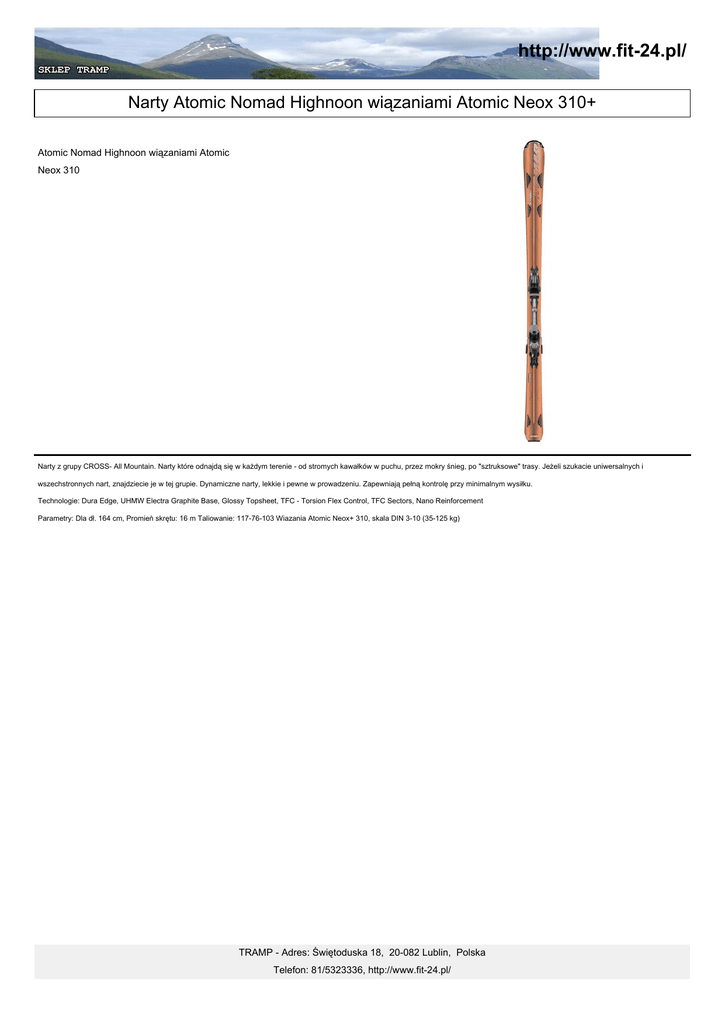 http://www.fit-24.pl/ Narty Atomic Nomad Highnoon wiązaniami Atomic Neox 310+ Atomic Nomad Highnoon wiązaniami Atomic Neox 310 Narty z grupy CROSS- All Mountain. Narty które odnajdą się w każdym terenie - od stromych kawałków w puchu, przez mokry śnieg, po "sztruksowe" trasy. Jeżeli szukacie uniwersalnych i wszechstronnych nart, znajdziecie je w tej grupie. Dynamiczne narty, lekkie i pewne w prowadzeniu. Zapewniają pełną kontrolę przy minimalnym wysiłku. Technologie: Dura Edge, UHMW Electra Graphite Base, Glossy Topsheet, TFC - Torsion Flex Control, TFC Sectors, Nano Reinforcement Parametry: Dla dł. 164 cm, Promień skrętu: 16 m Taliowanie: 117-76-103 Wiazania Atomic Neox+ 310, skala DIN 3-10 (35-125 kg) TRAMP - Adres: Świętoduska 18, 20-082 Lublin, Polska Telefon: 81/5323336, http://www.fit-24.pl/