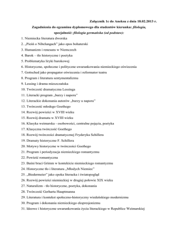 Załącznik 1c do Aneksu z dnia 18.02.2013 r. Zagadnienia do egzaminu dyplomowego dla studentów kierunku: filologia, specjalność: filologia germańska (od podstaw): 1. Niemiecka literatura dworska 2. „Pieśń o Nibelungach” jako epos bohaterski 3. Humanizm i renesans w Niemczech 4. Barok – tło historyczne i poetyka 5. Problematyka liryki barokowej 6. Historyczne, społeczne i polityczne uwarunkowania niemieckiego oświecenia 7. Gottsched jako propagator oświecenia i reformator teatru 8. Program i literatura sentymentalizmu 9. Lessing i drama mieszczańska 10. Twórczość dramatyczna Lessinga 11. Literacki program „burzy i naporu” 12. Literackie dokonania autorów „burzy u naporu” 13. Twórczość młodego Goethego 14. Rozwój powieści w XVIII wieku 15. Rozwój dramatu w XVIII wieku 16. Klasyka weimarska - osobowości, centralne pojęcia, poetyka 17. Klasyczna twórczość Goethego 18. Rozwój twórczości dramatycznej Fryderyka Schillera 19. Dramaty historyczne F. Schillera 20. Motywy historyczne w twórczości Goethego 21. Program i periodyzacja niemieckiego romantyzmu 22. Powieść romantyczna 23. Baśni braci Grimm w kontekście niemieckiego romantyzmu 24. Historyczne tło i literatura „Młodych Niemiec” 25. „Biedermeier” jako epoka literacka i światopogląd 26. Rozwój powieści niemieckiej w drugiej połowie XIX wieku 27. Naturalizm - tło historyczne, poetyka, dokonania 28. Twórczość Gerharta Hauptmanna 29. Literatura i kontekst społeczno-historyczny wiedeńskiego modernizmu 30. Program i dokonania niemieckiego ekspresjonizmu 31. Ideowe i historyczne uwarunkowania Ŝycia literackiego w Republice Weimarskiej 32. Twórczość Bertolta Brechta do roku 1935 33. Niemiecka literatura emigracyjna po roku 1933 34. Literatura niemiecka po roku 1945 - periodyzacja, programy, przedstawiciele 35. Literatura austriacka po roku 1945 - periodyzacja, programy, przedstawiciele 36. Literatura niemieckojęzycznej Szwajcarii po roku 1945 37. śycie literackie w NRD 38. Twórczość powieściowa Güntera Grassa 39. Wkład Ślązaków w rozwój literatury niemieckiej (Opitz, Eichendorff, Hauptmann) 40. Niemieckojęzyczni laureaci literackiej Nagrody Nobla