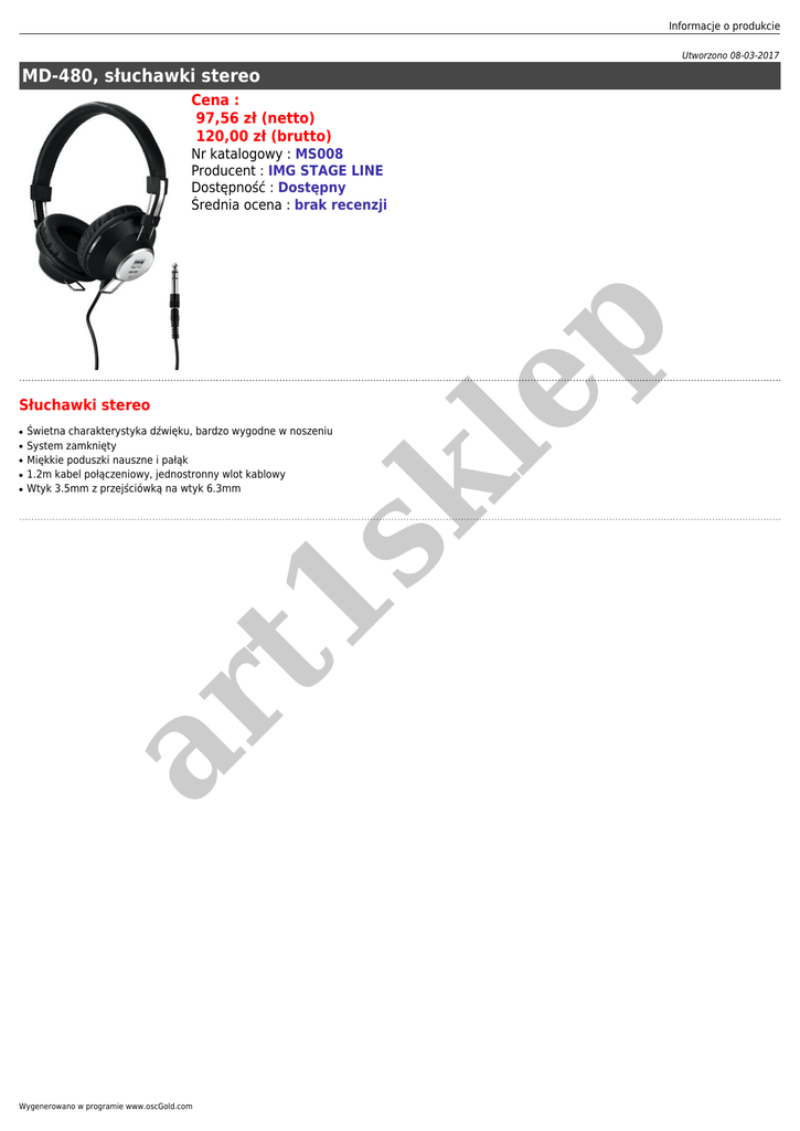 Informacje o produkcie Utworzono 08-03-2017 MD-480, słuchawki stereo Cena : 97,56 zł (netto) 120,00 zł (brutto) Słuchawki stereo ● ● ● ar ● Świetna charakterystyka dźwięku, bardzo wygodne w noszeniu System zamknięty Miękkie poduszki nauszne i pałąk 1.2m kabel połączeniowy, jednostronny wlot kablowy Wtyk 3.5mm z przejściówką na wtyk 6.3mm t1 sk ● le p Nr katalogowy : MS008 Producent : IMG STAGE LINE Dostępność : Dostępny Średnia ocena : brak recenzji Wygenerowano w programie www.oscGold.com