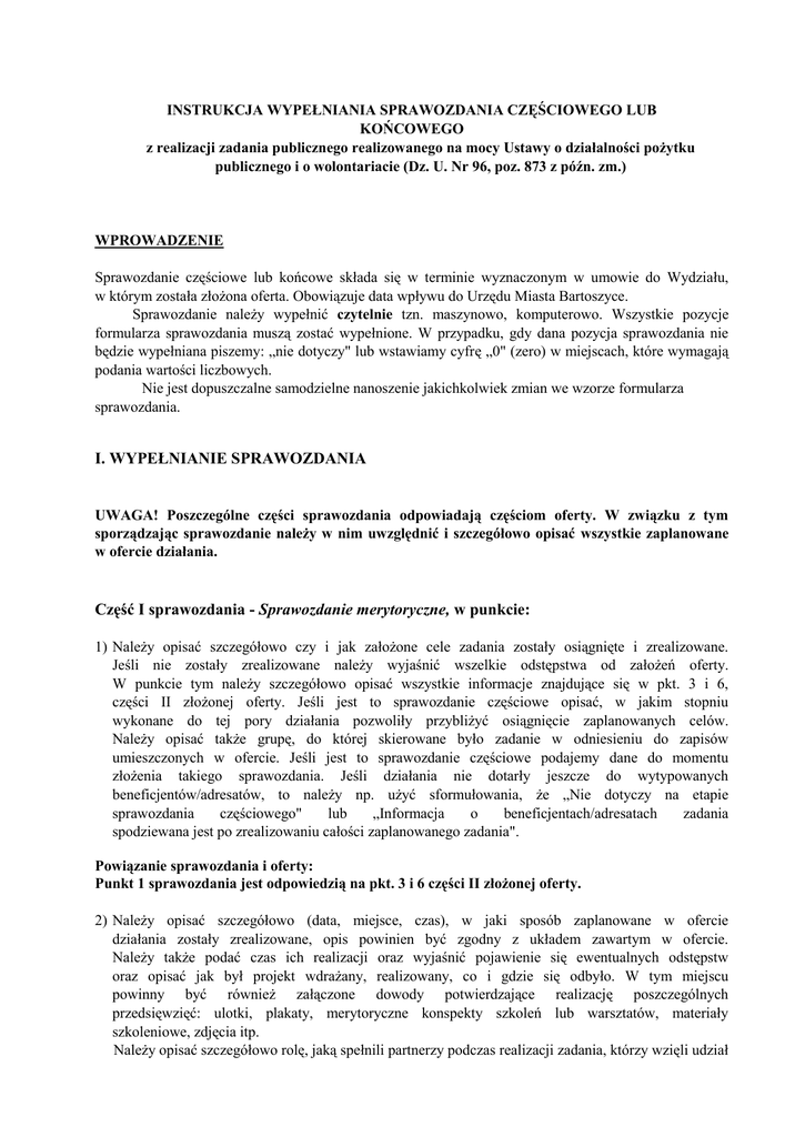INSTRUKCJA WYPEŁNIANIA SPRAWOZDANIA CZĘŚCIOWEGO LUB KOŃCOWEGO z realizacji zadania publicznego realizowanego na mocy Ustawy o działalności pożytku publicznego i o wolontariacie (Dz. U. Nr 96, poz. 873 z późn. zm.) WPROWADZENIE Sprawozdanie częściowe lub końcowe składa się w terminie wyznaczonym w umowie do Wydziału, w którym została złożona oferta. Obowiązuje data wpływu do Urzędu Miasta Bartoszyce. Sprawozdanie należy wypełnić czytelnie tzn. maszynowo, komputerowo. Wszystkie pozycje formularza sprawozdania muszą zostać wypełnione. W przypadku, gdy dana pozycja sprawozdania nie będzie wypełniana piszemy: „nie dotyczy" lub wstawiamy cyfrę „0" (zero) w miejscach, które wymagają podania wartości liczbowych. Nie jest dopuszczalne samodzielne nanoszenie jakichkolwiek zmian we wzorze formularza sprawozdania. I. WYPEŁNIANIE SPRAWOZDANIA UWAGA! Poszczególne części sprawozdania odpowiadają częściom oferty. W związku z tym sporządzając sprawozdanie należy w nim uwzględnić i szczegółowo opisać wszystkie zaplanowane w ofercie działania. Część I sprawozdania - Sprawozdanie merytoryczne, w punkcie: 1) Należy opisać szczegółowo czy i jak założone cele zadania zostały osiągnięte i zrealizowane. Jeśli nie zostały zrealizowane należy wyjaśnić wszelkie odstępstwa od założeń oferty. W punkcie tym należy szczegółowo opisać wszystkie informacje znajdujące się w pkt. 3 i 6, części II złożonej oferty. Jeśli jest to sprawozdanie częściowe opisać, w jakim stopniu wykonane do tej pory działania pozwoliły przybliżyć osiągnięcie zaplanowanych celów. Należy opisać także grupę, do której skierowane było zadanie w odniesieniu do zapisów umieszczonych w ofercie. Jeśli jest to sprawozdanie częściowe podajemy dane do momentu złożenia takiego sprawozdania. Jeśli działania nie dotarły jeszcze do wytypowanych beneficjentów/adresatów, to należy np. użyć sformułowania, że „Nie dotyczy na etapie sprawozdania częściowego" lub „Informacja o beneficjentach/adresatach zadania spodziewana jest po zrealizowaniu całości zaplanowanego zadania". Powiązanie sprawozdania i oferty: Punkt 1 sprawozdania jest odpowiedzią na pkt. 3 i 6 części II złożonej oferty. 2) Należy opisać szczegółowo (data, miejsce, czas), w jaki sposób zaplanowane w ofercie działania zostały zrealizowane, opis powinien być zgodny z układem zawartym w ofercie. Należy także podać czas ich realizacji oraz wyjaśnić pojawienie się ewentualnych odstępstw oraz opisać jak był projekt wdrażany, realizowany, co i gdzie się odbyło. W tym miejscu powinny być również załączone dowody potwierdzające realizację poszczególnych przedsięwzięć: ulotki, plakaty, merytoryczne konspekty szkoleń lub warsztatów, materiały szkoleniowe, zdjęcia itp. Należy opisać szczegółowo rolę, jaką spełnili partnerzy podczas realizacji zadania, którzy wzięli udział w zaplanowanym zadaniu, zgodnie z założeniami złożonej wcześniej oferty. Jeśli jest to sprawozdanie częściowe, to należy opisać rolę partnerów, jaką spełnili do momentu złożenia sprawozdania częściowego. W punkcie tym należy szczegółowo opisać wszystkie informacje znajdujące się w pkt. 4 i 5, części II złożonej oferty oraz w pkt. 1 i 4 części V złożonej oferty). UWAGA! Jeśli w ramach zadania nie przewidywano udziału partnerów, to piszemy: „Nie dotyczy lub „W ramach zadania nie zaplanowano udziału partnerów". Jeśli jest to sprawozdanie częściowe to należy opisać, jakie do tej pory działania zostały zrealizowane, zgodnie z zaplanowaną w ofercie kolejnością. Powiązanie sprawozdania i oferty: Punkt 2 sprawozdania jest odpowiedzią na pkt. 4 i 5 części II złożonej oferty oraz pkt. 1 i 4 części V złożonej oferty. 3) Należy, stosownie do zapisów złożonej wcześniej oferty, podać wymierne (tzn. mierzalne, policzalne) rezultaty zadania, np. ilość uczestników zadania (w tym artystów, widzów), ilość plakatów, ulotek, folderów, liczbę przeszkolonych osób itp. Ewentualne rozbieżności należy uwzględnić. W punkcie tym należy szczegółowo opisać wszystkie informacje znajdujące się w pkt. 5, części II złożonej oferty. Jeśli jest to sprawozdanie częściowe, to należy ująć tylko te rezultaty, które zostały osiągnięte do momentu złożenia sprawozdania częściowego. UWAGA! Należy podać dokładne wyliczenie ilościowych rezultatów projektu. Jeśli podane w sprawozdaniu wartości różnią od zaplanowanych w złożonej wcześniej ofercie, to należy wyjaśnić przyczyny takiej sytuacji. Powiązanie sprawozdania i oferty: Punkt 3 sprawozdania jest odpowiedzią na pkt. 5 części II złożonej oferty. Część II sprawozdania - Sprawozdanie z wykonania wydatków, w punkcie: 1. Rozliczenie ze względu na rodzaj kosztów (w zł): SPRAWOZADNIE CZĘŚCIOWE 1A. Uwaga! Dotyczy sprawozdań składanych do Wydziału S[praw Społecznych dla zadania: Upowszechnianie i rozwój kultury fizycznej. a) Kolumna „Całość zadania (zgodnie z umową)" Należy przepisać poszczególne rodzaje kosztów oraz sposób ich kalkulacji z podaniem ilości zasobów i kosztów jednostkowych z kosztorysu ze względu na rodzaj kosztów, które znajdują się w złożonej ofercie lub korekcie kosztorysu, jeśli była wymagana. b) Kolumna „Poprzednie okresy sprawozdawcze (narastająco)" W przypadku, gdy składane jest sprawozdanie częściowe należy zostawić kolumnę niewypełnioną. c) Kolumna „bieżący okres sprawozdawczy" Należy określić faktycznie poniesione wydatki w danym okresie sprawozdawczym. 1B. Uwaga! Dotyczy tylko sprawozdań składanych do Wydziału Spraw Społecznych dla zadania: Upowszechnianie i rozwój kultury fizycznej. Każdorazowo do kolumny "Całość zadania (zgodnie z umową)" należy przepisać poszczególne rodzaje kosztów, które znajdują się w złożonej ofercie lub korekcie kosztorys