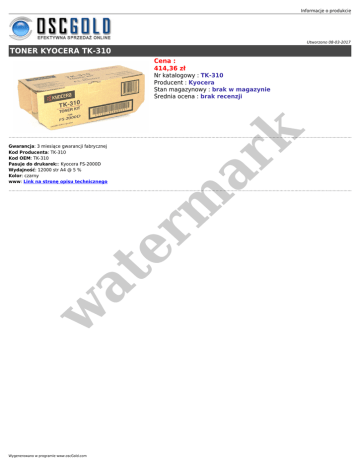 Informacje o produkcie Utworzono 08-03-2017 TONER KYOCERA TK-310 Cena : 414,36 zł er m ar k Nr katalogowy : TK-310 Producent : Kyocera Stan magazynowy : brak w magazynie Średnia ocena : brak recenzji w at Gwarancja: 3 miesiące gwarancji fabrycznej Kod Producenta: TK-310 Kod OEM: TK-310 Pasuje do drukarek:: Kyocera FS-2000D Wydajność: 12000 str A4 @ 5 % Kolor: czarny www: Link na stronę opisu technicznego Wygenerowano w programie www.oscGold.com