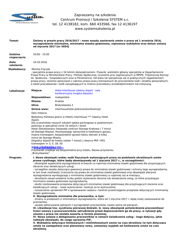 Zapraszamy na szkolenia Centrum Promocji i Szkolenia SYSTEM s.c. tel. 12 4138182, kom. 660 433566, fax 12 4136197 www.systemszkolenia.pl Temat: Zmiany w prawie pracy 2016/2017 - nowe zasady zawierania umów o pracę od 1 września 2016, wynagrodzenie minimalne, minimalna stawka godzinowa, najnowsza wykładnia oraz dalsze zmiany od stycznia 2017 [nr 5054] Godzina rozpoczęcia: 10:00 - 15:00 Data szkolenia: 19-10-2016 Wykładowcy: Lokalizacja: Monika MonikaFrączek Frączek - -specjalista specjalistaprawa prawapracy pracyzz16 16letnim letnimdoświadczeniem. doświadczeniem.Prawnik, Prawnik,wieloletni wieloletnigłówny głównyspecjalista specjalistawwDepartamencie Departamencie Prawa PrawaPracy PracywwMinisterstwie MinisterstwiePracy Pracyi iPolityki PolitykiSpołecznej. Społecznej.Uczestnik Uczestnikprac praclegislacyjnych legislacyjnychwwMPiPS, MPiPS,Trójstronnej TrójstronnejKomisji Komisji ds. ds.Społeczno Społeczno- -Gospodarczych Gospodarczychoraz orazwwParlamencie. Parlamencie.Od Odwielu wielulat latspecjalizuje specjalizujesię sięwwpraktycznych praktycznychzagadnieniach zagadnieniach prawa prawapracy. pracy.Autorka Autorkaopracowań opracowańzzzakresu zakresuprawa prawapracy pracykierowanych kierowanychdo dopracowników pracownikówkadr kadri idziałów działówpersonalnych, personalnych, aatakże takżepracodawców pracodawcówi iosób osóbzarządzających zarządzającychwwimieniu imieniupracodawcy pracodawcyprzedsiębiorstwem przedsiębiorstwemlub lubinstytucją. instytucją. Miejsce: Miejsce: Hotel InterHouse (dawny Aspel) - sala Hotel InterHouse (dawny Aspel) - sala konferencyjna (mapka dojazdu) konferencyjna (mapka dojazdu) Województwo: Województwo: małopolskie małopolskie Miasto: Kraków Miasto: Kraków Ulica: Bratysławska 22 Ulica: Bratysławska Strona www: interhousehotel.pl/biznes/konferencje/ Strona www: interhousehotel.pl/biznes/konferencje/ Opis miejsca: Opis miejsca: Będziemy Państwa gościć ww Hotelu InterHouse *** (dawny Hotel Będziemy Państwa gościć Hotelu InterHouse *** (dawny Hotel Aspel). Aspel). Dla uczestników naszych szkoleń opłata parkingowa ww podziemnym Dla uczestników naszych szkoleń opłata parkingowa podziemnym parkingu ww specjalnej cenie 1010 złotych / dzień parkingu specjalnej cenie złotych / dzień Hotel zlokalizowany nieopodal centrum Starego Krakowa ( 7( 7 minut Hotel zlokalizowany nieopodal centrum Starego Krakowa minut odod Starego Miasta). Pozostawiając samochód ww hotelowym garażu, Starego Miasta). Pozostawiając samochód hotelowym garażu, można tramwajem, bezpośrednio sprzed hotelu dotrzeć ww kilka można tramwajem, bezpośrednio sprzed hotelu dotrzeć kilka minut dodo Starego Miasta. minut Starego Miasta. Dogodny dojazd dodo hotelu (około 77 minut) z dworca PKP i PKS Dogodny dojazd hotelu (około minut) z dworca PKP i PKS tramwajem nrnr 3,3, 5,5, 18, 5050 tramwajem 18, www.jakdojade.com www.jakdojade.com Przystanek znajduje sięsię bezpośrednio przy hotelu. Nazwa przystanku Przystanek znajduje bezpośrednio przy hotelu. Nazwa przystanku „Bratysławska”. „Bratysławska”. Program: I. Nowe obowiązki wobec osób fizycznych wykonujących pracę na podstawie określonych umów prawa cywilnego, które będą obowiązywały od 1 stycznia 2017 r., w szczególności: · obowiązek wypłacania wynagrodzenia w kwocie co najmniej minimalnej stawki godzinowej dla przyjmujących zlecenie oraz świadczących usługi, · szczególne zasady dotyczące gwarancji prawa do minimalnej stawki godzinowej i ochrony tego wynagrodzenia, w tym brak możliwości zrzeczenia się prawa do minimalnej stawki godzinowej oraz obowiązek płacenia wynagrodzenia wynikającego z minimalnej stawki godzinowej co najmniej raz w miesiącu, · określanie zasad ustalania liczby godzin wykonania zlecenia lub świadczenia usług, za które przysługuje minimalna stawka godzinowa wynagrodzenia, · skutki niestosowania przepisów dotyczących minimalnej stawki godzinowej dla przyjmujących zlecenie oraz świadczących usługi – nowe wykroczenie i sankcje za to wykroczenie, · rozszerzenie uprawnień PIP o sprawowanie nadzoru i kontroli przestrzegania przepisów dotyczących minimalnej stawki godzinowej, II. Wynagrodzenie minimalne dla pracownika, w tym: · zmiany w przepisach o minimalnym wynagrodzeniu, które od 1 stycznia 2017 r. będą miały zastosowanie do pracownika, · zasady dokonywania potrąceń z wynagrodzeń pracowników, kwota wolna od potrąceń, III. Likwidacja tzw. syndromu pierwszej dniówki, tj. nowy obowiązek potwierdzania pracownikowi treści umowy o pracę/warunków zatrudnienia przed dopuszczeniem go do pracy, w sytuacji gdy umowa o pracę nie została zawarta w formie pisemnej, IV. Nowa ustawa o delegowaniu pracowników w ramach świadczenia usług – kogo dotyczy, jakie nałożyła obowiązki, do czego uprawnia PIP, V. Wykładnia dotycząca limitowanych i nielimitowanych umów na czas określony (w tym dotycząca umów na zastępstwo) oraz planowany nowy, ustawowy wyjątek od limitowania umów na czas określony, VI. Zmiany w przepisach dotyczących zatrudniania kobiet oraz problematyczne kwestie dotyczące urlopu rodzicielskiego, w szczególności: 1. Nowe przepisy w zakresie prac uciążliwych, niebezpiecznych lub szkodliwych dla zdrowia ciężarnych i karmiących dziecko piersią, 2. Planowane przedłużanie się umowy na zastępstwo do dnia porodu, 3. Wybrane, problematyczne regulacje dotyczące urlopu rodzicielskiego, w tym: · dwa tryby występowania o urlop rodzicielski – różnice w uprawnieniach i w wysokości zasiłku macierzyńskiego, ewentualny obowiązek wypłacania podwyższenia zasiłku do kwoty świadczenia rodzicielskiego, · zasady dzielenia urlopu rodzicielskiego na części, · zasady korzystania z urlopu rodzicielskiego „po przerwie”, najpóźniej do końca roku kalendarzowego, w którym dziecko pracownika kończy 6 lat, wpływ urlopu rodzicielskiego „po przerwie” na liczbę czę