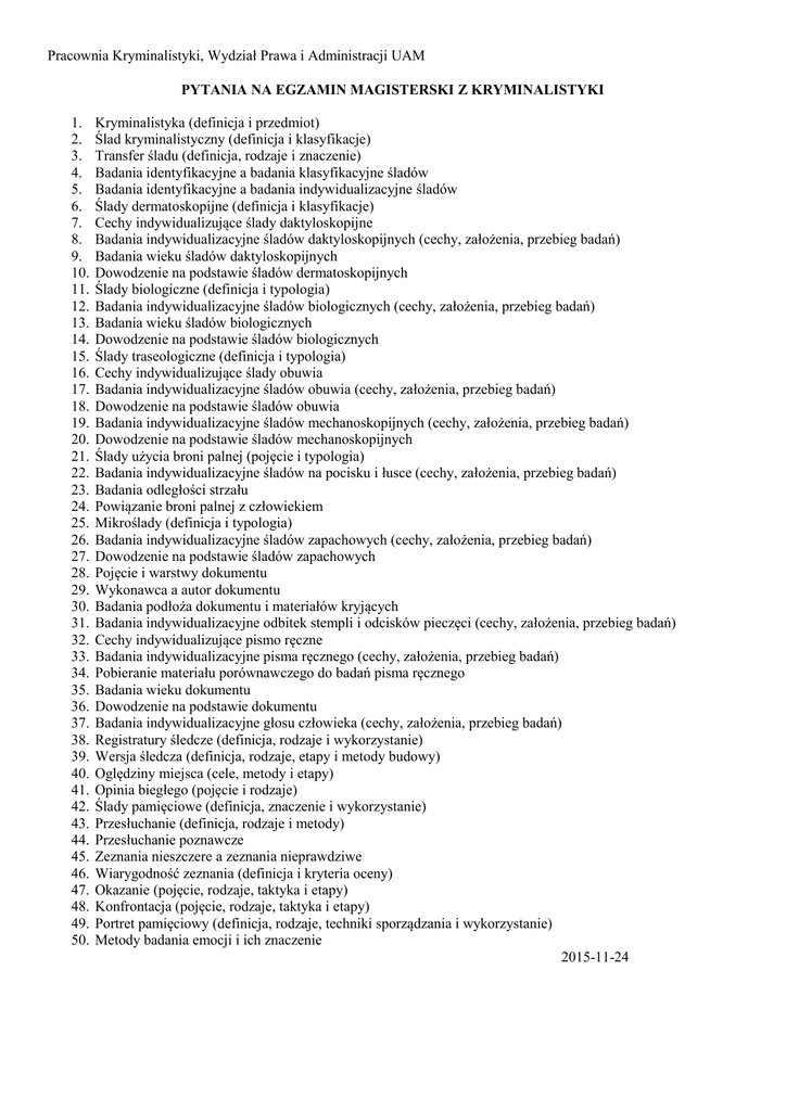 Pracownia Kryminalistyki, Wydział Prawa i Administracji UAM PYTANIA NA EGZAMIN MAGISTERSKI Z KRYMINALISTYKI 1. 2. 3. 4. 5. 6. 7. 8. 9. 10. 11. 12. 13. 14. 15. 16. 17. 18. 19. 20. 21. 22. 23. 24. 25. 26. 27. 28. 29. 30. 31. 32. 33. 34. 35. 36. 37. 38. 39. 40. 41. 42. 43. 44. 45. 46. 47. 48. 49. 50. Kryminalistyka (definicja i przedmiot) Ślad kryminalistyczny (definicja i klasyfikacje) Transfer śladu (definicja, rodzaje i znaczenie) Badania identyfikacyjne a badania klasyfikacyjne śladów Badania identyfikacyjne a badania indywidualizacyjne śladów Ślady dermatoskopijne (definicja i klasyfikacje) Cechy indywidualizujące ślady daktyloskopijne Badania indywidualizacyjne śladów daktyloskopijnych (cechy, założenia, przebieg badań) Badania wieku śladów daktyloskopijnych Dowodzenie na podstawie śladów dermatoskopijnych Ślady biologiczne (definicja i typologia) Badania indywidualizacyjne śladów biologicznych (cechy, założenia, przebieg badań) Badania wieku śladów biologicznych Dowodzenie na podstawie śladów biologicznych Ślady traseologiczne (definicja i typologia) Cechy indywidualizujące ślady obuwia Badania indywidualizacyjne śladów obuwia (cechy, założenia, przebieg badań) Dowodzenie na podstawie śladów obuwia Badania indywidualizacyjne śladów mechanoskopijnych (cechy, założenia, przebieg badań) Dowodzenie na podstawie śladów mechanoskopijnych Ślady użycia broni palnej (pojęcie i typologia) Badania indywidualizacyjne śladów na pocisku i łusce (cechy, założenia, przebieg badań) Badania odległości strzału Powiązanie broni palnej z człowiekiem Mikroślady (definicja i typologia) Badania indywidualizacyjne śladów zapachowych (cechy, założenia, przebieg badań) Dowodzenie na podstawie śladów zapachowych Pojęcie i warstwy dokumentu Wykonawca a autor dokumentu Badania podłoża dokumentu i materiałów kryjących Badania indywidualizacyjne odbitek stempli i odcisków pieczęci (cechy, założenia, przebieg badań) Cechy indywidualizujące pismo ręczne Badania indywidualizacyjne pisma ręcznego (cechy, założenia, przebieg badań) Pobieranie materiału porównawczego do badań pisma ręcznego Badania wieku dokumentu Dowodzenie na podstawie dokumentu Badania indywidualizacyjne głosu człowieka (cechy, założenia, przebieg badań) Registratury śledcze (definicja, rodzaje i wykorzystanie) Wersja śledcza (definicja, rodzaje, etapy i metody budowy) Oględziny miejsca (cele, metody i etapy) Opinia biegłego (pojęcie i rodzaje) Ślady pamięciowe (definicja, znaczenie i wykorzystanie) Przesłuchanie (definicja, rodzaje i metody) Przesłuchanie poznawcze Zeznania nieszczere a zeznania nieprawdziwe Wiarygodność zeznania (definicja i kryteria oceny) Okazanie (pojęcie, rodzaje, taktyka i etapy) Konfrontacja (pojęcie, rodzaje, taktyka i etapy) Portret pamięciowy (definicja, rodzaje, techniki sporządzania i wykorzystanie) Metody badania emocji i ich znaczenie 2015-11-24