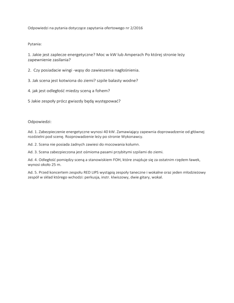 Odpowiedzi na pytania dotyczące zapytania ofertowego nr 2/2016 Pytania: 1. Jakie jest zaplecze energetyczne? Moc w kW lub Amperach Po której stronie leży zapewnienie zasilania? 2. Czy posiadacie wingi -wąsy do zawieszenia nagłośnienia. 3. Jak scena jest kotwiona do ziemi? szpile balasty wodne? 4. jak jest odległość miedzy sceną a fohem? 5 Jakie zespoły prócz gwiazdy będą występować? Odpowiedzi: Ad. 1. Zabezpieczenie energetyczne wynosi 40 kW. Zamawiający zapewnia doprowadzenie od głównej rozdzielni pod scenę. Rozprowadzenie leży po stronie Wykonawcy. Ad. 2. Scena nie posiada żadnych zawiesi do mocowania kolumn. Ad. 3. Scena zabezpieczona jest ośmioma pasami przybitymi szpilami do ziemi. Ad. 4. Odległość pomiędzy sceną a stanowiskiem FOH, które znajduje się za ostatnim rzędem ławek, wynosi około 25 m. Ad. 5. Przed koncertem zespołu RED LIPS wystąpią zespoły taneczne i wokalne oraz jeden młodzieżowy zespół w skład którego wchodzi: perkusja, instr. klwiszowy, dwie gitary, wokal.