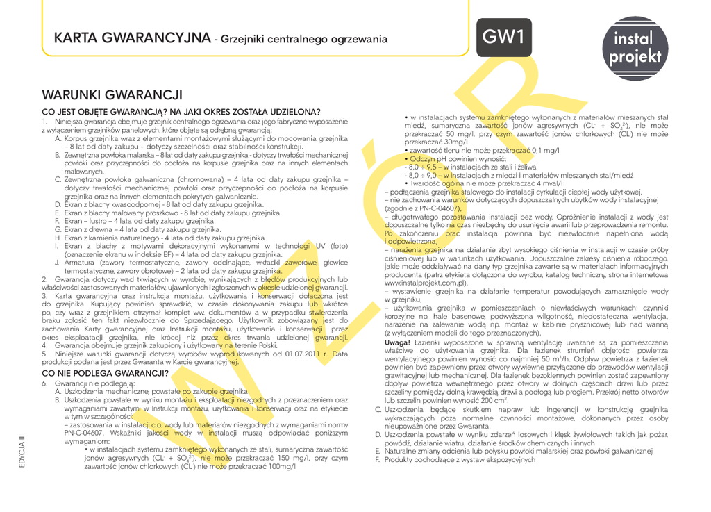 KARTA GWARANCYJNA - Grzejniki centralnego ogrzewania WARUNKI GWARANCJI • w instalacjach systemu zamkniętego wykonanych z materiałów mieszanych stal miedź, sumaryczna zawartość jonów agresywnych (CL- + SO42-), nie może przekraczać 50 mg/l, przy czym zawartość jonów chlorkowych (CL-) nie może przekraczać 30mg/l • zawartość tlenu nie może przekraczać 0,1 mg/l • Odczyn pH powinien wynosić: - 8,0 ÷ 9,5 – w instalacjach ze stali i żeliwa - 8,0 ÷ 9,0 – w instalacjach z miedzi i materiałów mieszanych stal/miedź • Twardość ogólna nie może przekraczać 4 mval/l – podłączenia grzejnika stalowego do instalacji cyrkulacji ciepłej wody użytkowej, – nie zachowania warunków dotyczących dopuszczalnych ubytków wody instalacyjnej (zgodnie z PN-C-04607), – długotrwałego pozostawania instalacji bez wody. Opróżnienie instalacji z wody jest dopuszczalne tylko na czas niezbędny do usunięcia awarii lub przeprowadzenia remontu. Po zakończeniu prac instalacja powinna być niezwłocznie napełniona wodą i odpowietrzona, – narażenia grzejnika na działanie zbyt wysokiego ciśnienia w instalacji w czasie próby ciśnieniowej lub w warunkach użytkowania. Dopuszczalne zakresy ciśnienia roboczego, jakie może oddziaływać na dany typ grzejnika zawarte są w materiałach informacyjnych producenta (patrz etykieta dołączona do wyrobu, katalog techniczny, strona internetowa www.instalprojekt.com.pl), – wystawienie grzejnika na działanie temperatur powodujących zamarznięcie wody w grzejniku, – użytkowania grzejnika w pomieszczeniach o niewłaściwych warunkach: czynniki korozyjne np. hale basenowe, podwyższona wilgotność, niedostateczna wentylacja, narażenie na zalewanie wodą np. montaż w kabinie prysznicowej lub nad wanną (z wyłączeniem modeli do tego przeznaczonych). Uwaga! Łazienki wyposażone w sprawną wentylację uważane są za pomieszczenia właściwe do użytkowania grzejnika. Dla łazienek strumień objętości powietrza wentylacyjnego powinien wynosić co najmniej 50 m3/h. Odpływ powietrza z łazienek powinien być zapewniony przez otwory wywiewne przyłączone do przewodów wentylacji grawitacyjnej lub mechanicznej. Dla łazienek bezokiennych powinien zostać zapewniony dopływ powietrza wewnętrznego przez otwory w dolnych częściach drzwi lub przez szczeliny pomiędzy dolną krawędzią drzwi a podłogą lub progiem. Przekrój netto otworów lub szczelin powinien wynosić 200 cm2. C. Uszkodzenia będące skutkiem napraw lub ingerencji w konstrukcję grzejnika wykraczających poza normalne czynności montażowe, dokonanych przez osoby nieupoważnione przez Gwaranta. D. Uszkodzenia powstałe w wyniku zdarzeń losowych i klęsk żywiołowych takich jak pożar, powódź, działanie wiatru, działanie środków chemicznych i innych E. Naturalne zmiany odcienia lub połysku powłoki malarskiej oraz powłoki galwanicznej F. Produkty pochodzące z wystaw ekspozycyjnych Z Ó 1. Niniejsza gwarancja obejmuje grzejnik centralnego ogrzewania oraz jego fabryczne wyposażenie z wyłączeniem grzejników panelowych, które objęte są odrębną gwarancją: A.Korpus grzejnika wraz z elementami montażowymi służącymi do mocowania grzejnika – 8 lat od daty zakupu – dotyczy szczelności oraz stabilności konstrukcji. B. Zewnętrzna powłoka malarska – 8 lat od daty zakupu grzejnika - dotyczy trwałości mechanicznej powłoki oraz przyczepności do podłoża na korpusie grzejnika oraz na innych elementach malowanych. C. Zewnętrzna powłoka galwaniczna (chromowana) – 4 lata od daty zakupu grzejnika – dotyczy trwałości mechanicznej powłoki oraz przyczepności do podłoża na korpusie grzejnika oraz na innych elementach pokrytych galwanicznie. D. Ekran z blachy kwasoodpornej - 8 lat od daty zakupu grzejnika. E. Ekran z blachy malowany proszkowo - 8 lat od daty zakupu grzejnika. F. Ekran – lustro – 4 lata od daty zakupu grzejnika. G.Ekran z drewna – 4 lata od daty zakupu grzejnika. H. Ekran z kamienia naturalnego - 4 lata od daty zakupu grzejnika. I. Ekran z blachy z motywami dekoracyjnymi wykonanymi w technologii UV (foto) (oznaczenie ekranu w indeksie EF) – 4 lata od daty zakupu grzejnika. J. Armatura (zawory termostatyczne, zawory odcinające, wkładki zaworowe, głowice termostatyczne, zawory obrotowe) – 2 lata od daty zakupu grzejnika. 2. Gwarancja dotyczy wad tkwiących w wyrobie, wynikających z błędów produkcyjnych lub właściwości zastosowanych materiałów, ujawnionych i zgłoszonych w okresie udzielonej gwarancji. 3. Karta gwarancyjna oraz instrukcja montażu, użytkowania i konserwacji dołaczona jest do grzejnika. Kupujący powinien sprawdzić, w czasie dokonywania zakupu lub wkrótce po, czy wraz z grzejnikiem otrzymał komplet ww. dokumentów a w przypadku stwierdzenia braku zgłosić ten fakt niezwłocznie do Sprzedającego. Użytkownik zobowiązany jest do zachowania Karty gwarancyjnej oraz Instrukcji montażu, użytkowania i konserwacji przez okres eksploatacji grzejnika, nie krócej niż przez okres trwania udzielonej gwarancji. 4. Gwarancja obejmuje grzejnik zakupiony i użytkowany na terenie Polski. 5. Niniejsze warunki gwarancji dotyczą wyrobów wyprodukowanych od 01.07.2011 r.. Data produkcji podana jest przez Gwaranta w Karcie gwarancyjnej. R CO JEST OBJĘTE GWARANCJĄ? NA JAKI OKRES ZOSTAŁA UDZIELONA? Gwarancji nie podlegają: A. Uszkodzenia mechaniczne, powstałe po zakupie grzejnika. B. Uszkodzenia powstałe w wyniku montażu i eksploatacji niezgodnych z przeznaczeniem oraz wymaganiami zawartymi w Instrukcji montażu, użytkowania i konserwacji oraz na etykiecie w tym w szczególności: – zastosowania w instalacji c.o. wody lub materiałów niezgodnych z wymaganiami normy PN-C-04607. Wskaźniki jakości wody w instalacji muszą odpowiadać poniższym wymaganiom: • w instalacjach systemu zamkniętego wykonanych ze stali, sumaryczna zawartość jonów agresywnych (CL- + SO42-), nie mo