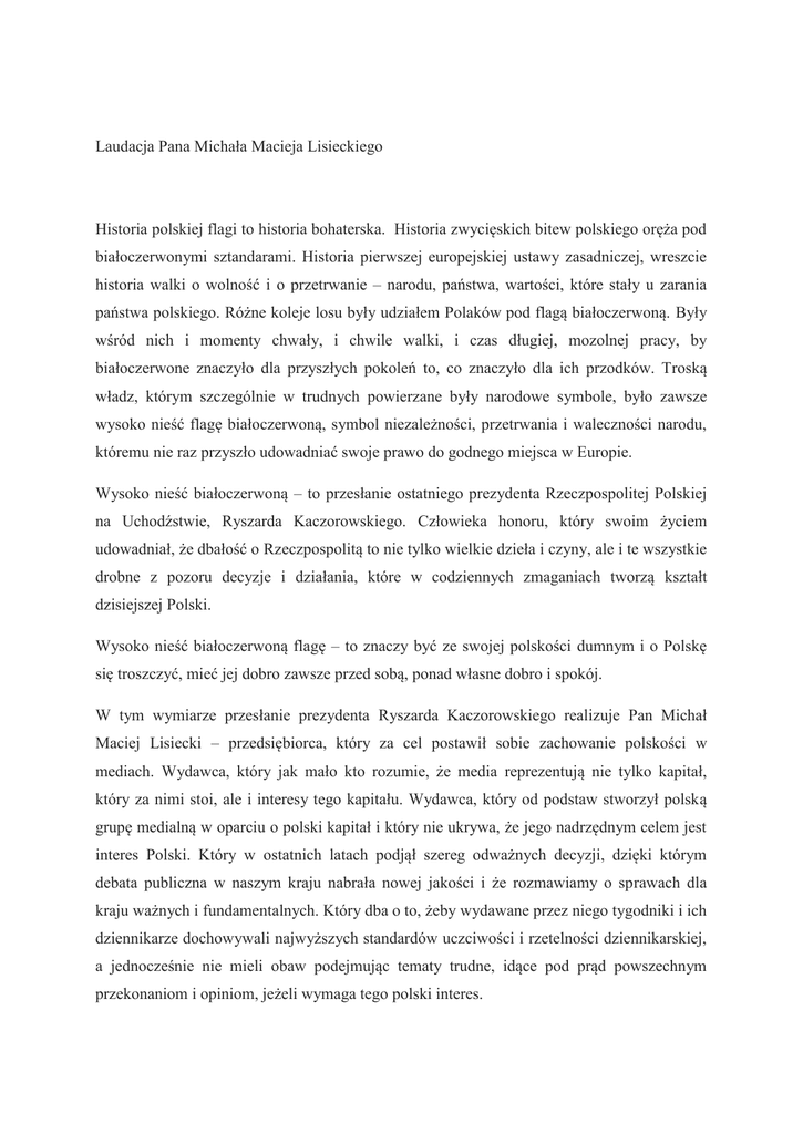 Laudacja Pana Michała Macieja Lisieckiego Historia polskiej flagi to historia bohaterska. Historia zwycięskich bitew polskiego oręża pod białoczerwonymi sztandarami. Historia pierwszej europejskiej ustawy zasadniczej, wreszcie historia walki o wolność i o przetrwanie – narodu, państwa, wartości, które stały u zarania państwa polskiego. Różne koleje losu były udziałem Polaków pod flagą białoczerwoną. Były wśród nich i momenty chwały, i chwile walki, i czas długiej, mozolnej pracy, by białoczerwone znaczyło dla przyszłych pokoleń to, co znaczyło dla ich przodków. Troską władz, którym szczególnie w trudnych powierzane były narodowe symbole, było zawsze wysoko nieść flagę białoczerwoną, symbol niezależności, przetrwania i waleczności narodu, któremu nie raz przyszło udowadniać swoje prawo do godnego miejsca w Europie. Wysoko nieść białoczerwoną – to przesłanie ostatniego prezydenta Rzeczpospolitej Polskiej na Uchodźstwie, Ryszarda Kaczorowskiego. Człowieka honoru, który swoim życiem udowadniał, że dbałość o Rzeczpospolitą to nie tylko wielkie dzieła i czyny, ale i te wszystkie drobne z pozoru decyzje i działania, które w codziennych zmaganiach tworzą kształt dzisiejszej Polski. Wysoko nieść białoczerwoną flagę – to znaczy być ze swojej polskości dumnym i o Polskę się troszczyć, mieć jej dobro zawsze przed sobą, ponad własne dobro i spokój. W tym wymiarze przesłanie prezydenta Ryszarda Kaczorowskiego realizuje Pan Michał Maciej Lisiecki – przedsiębiorca, który za cel postawił sobie zachowanie polskości w mediach. Wydawca, który jak mało kto rozumie, że media reprezentują nie tylko kapitał, który za nimi stoi, ale i interesy tego kapitału. Wydawca, który od podstaw stworzył polską grupę medialną w oparciu o polski kapitał i który nie ukrywa, że jego nadrzędnym celem jest interes Polski. Który w ostatnich latach podjął szereg odważnych decyzji, dzięki którym debata publiczna w naszym kraju nabrała nowej jakości i że rozmawiamy o sprawach dla kraju ważnych i fundamentalnych. Który dba o to, żeby wydawane przez niego tygodniki i ich dziennikarze dochowywali najwyższych standardów uczciwości i rzetelności dziennikarskiej, a jednocześnie nie mieli obaw podejmując tematy trudne, idące pod prąd powszechnym przekonaniom i opiniom, jeżeli wymaga tego polski interes. Pan Michał Maciej Lisiecki jest człowiekiem, który uratował przed upadkiem jeden z najbardziej opiniotwórczych polskich tygodników „Wprost”. Przywrócił debacie publicznej niezwykłe i najbardziej prestiżowe wyróżnienie wolnej Polski – Nagrodę Kisiela. Wsparł powstanie najważniejszego dziś głosu Polski konserwatywnej, współtworząc tygodnik dziennikarzy niepokornych „Do Rzeczy”. Na łamach obu tygodników dziennikarze niejednokrotnie podejmowali tematy trudne i stawali samotnie przeciwko powszechnej opinii – mając wsparcie w osobie wydawcy, który nie ugiął się pod naciskami politycznymi i biznesowymi i który dobrostan Polski oraz wolność słowa stawia na pierwszym miejscu, nawet jeżeli nie zawsze są one tożsame z dobrostanem wydawnictwa. Dzisiaj, w imieniu tych wszystkich, którym spuścizna II Rzeczpospolitej i jej wartości jest droga, którzy kontynuują drogę i dzieło prezydenta Ryszarda Kaczorowskiego, chcemy wyrazić uznanie Panu Michałowi Maciejowi Lisieckiemu za to, iż w codziennej działalności dowodzi, iż nieść wysoko białoczerwoną flagę można również prowadząc działalność biznesową. W jednym z wywiadów ostatni prezydent Rzeczpospolitej Polskiej na Uchodźstwie Ryszard Kaczorowski powiedział: Mam dwie takie pamiątki, bardzo dla mnie ważne, które czekają na to, żebym zabrał je ze sobą do grobu. To skała z Monte Cassino i garść ziemi spod dębów w parku na Zwierzyńcu. Tych dębów, które tworzą pomnik Konstytucji 3 Maja i pod którymi kilkadziesiąt lat temu składałem przyrzeczenie harcerskie. Ale Prezydent zostawił po sobie jeszcze jedną cenną pamiątkę: Godło Państwa Polskiego, które zdobiło siedzibę Prezydenta i Rządu II Rzeczpospolitej Polskiej na „Zamku” w polskim Londynie. Dzisiaj, w dowód uznania za działalność w polskim interesie narodowym, za odwagę i bezkompromisowość oraz za rolę, którą odgrywa w kształtowaniu polskiej debaty publicznej, to właśnie godło, symbol wartości, które stały u zarania i na straży demokratycznego i wolnego państwa polskiego, mamy honor przekazać Panu Michałowi Maciejowi Lisieckiemu, wydawcy tygodników „Wprost” i „Do Rzeczy”. To wielkie wyróżnienie, ale i wielkie zobowiązanie na przyszłość. Życzymy Panu sił, aby dalej niósł Pan tę odpowiedzialność i ten sztandar – wysoko, możliwie najwyżej.