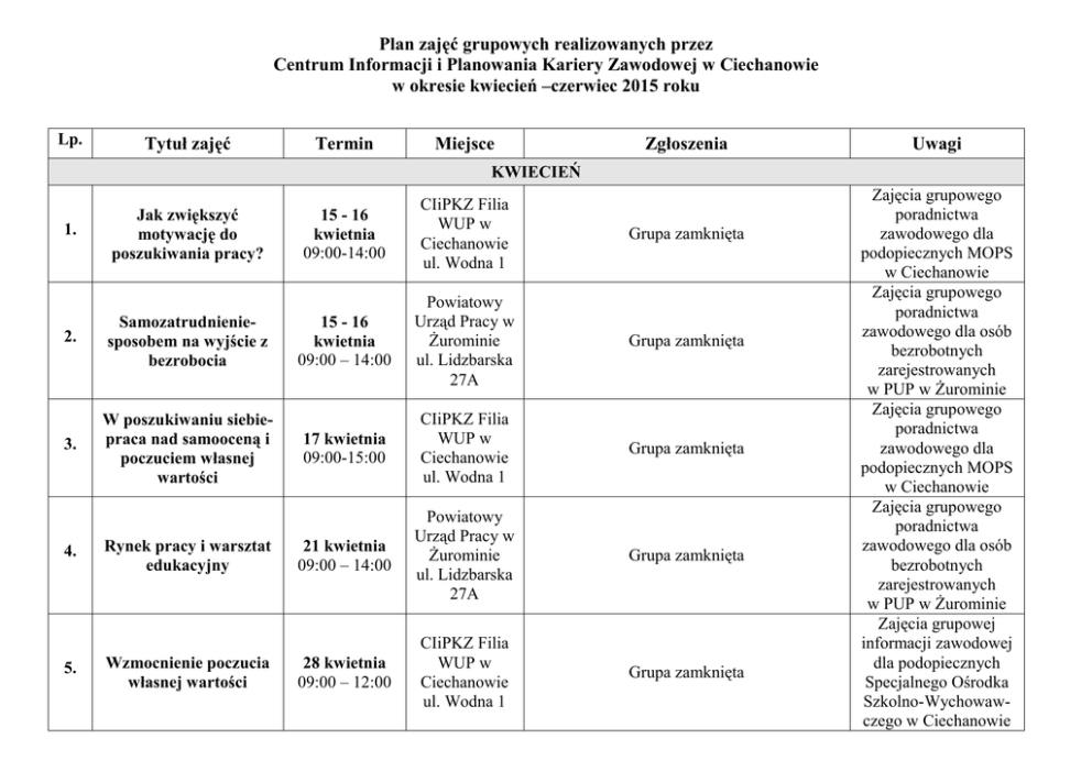 Plan zajęć grupowych realizowanych przez Centrum Informacji i Planowania Kariery Zawodowej w Ciechanowie w okresie kwiecień –czerwiec 2015 roku Lp. Tytuł zajęć Termin Miejsce Zgłoszenia Uwagi KWIECIEŃ 1. Jak zwiększyć motywację do poszukiwania pracy? 2. Samozatrudnieniesposobem na wyjście z bezrobocia 3. W poszukiwaniu siebiepraca nad samooceną i poczuciem własnej wartości 15 - 16 kwietnia 09:00-14:00 CIiPKZ Filia WUP w Ciechanowie ul. Wodna 1 Grupa zamknięta 15 - 16 kwietnia 09:00 – 14:00 Powiatowy Urząd Pracy w Żurominie ul. Lidzbarska 27A Grupa zamknięta 17 kwietnia 09:00-15:00 CIiPKZ Filia WUP w Ciechanowie ul. Wodna 1 Grupa zamknięta Grupa zamknięta Grupa zamknięta 4. Rynek pracy i warsztat edukacyjny 21 kwietnia 09:00 – 14:00 Powiatowy Urząd Pracy w Żurominie ul. Lidzbarska 27A 5. Wzmocnienie poczucia własnej wartości 28 kwietnia 09:00 – 12:00 CIiPKZ Filia WUP w Ciechanowie ul. Wodna 1 Zajęcia grupowego poradnictwa zawodowego dla podopiecznych MOPS w Ciechanowie Zajęcia grupowego poradnictwa zawodowego dla osób bezrobotnych zarejestrowanych w PUP w Żurominie Zajęcia grupowego poradnictwa zawodowego dla podopiecznych MOPS w Ciechanowie Zajęcia grupowego poradnictwa zawodowego dla osób bezrobotnych zarejestrowanych w PUP w Żurominie Zajęcia grupowej informacji zawodowej dla podopiecznych Specjalnego Ośrodka Szkolno-Wychowawczego w Ciechanowie 6. Skuteczna komunikacja i rozwiązywanie konfliktów w grupie 29 kwietnia 09:00-14:00 CIiPKZ Filia WUP w Ciechanowie ul. Wodna 1 Zgłoszenia przyjmujemy do 21 kwietnia 2015 r. tel.23 673 07 47 lub 36-38-39 [email protected] Przed zajęciami konieczne jest zgłoszenie się na wstępną konsultację z doradcą zawodowym MAJ 1. Poznaj siebie odkryj swój potencjał warsztaty rozwoju osobistego i zawodowego 2. Założenie własnej firmy 3. Stres jako czynnik wpływający na funkcjonowanie zawodowe 4. Załóż firmę – sięgnij po marzenia 14 maja 09:00 – 15:00 CIiPKZ Filia WUP w Ciechanowie ul. Wodna 1 20 maja 09:00 – 14:00 Powiatowy Urząd Pracy w Żurominie ul. Lidzbarska 27A 19 maja 09:00 – 15:00 20 - 21 maja 09:00 – 14:00 Zgłoszenia przyjmujemy do 05 maja 2015 r. tel.23 673 07 47 lub 36-38-39 [email protected] Grupa zamknięta CIiPKZ Filia WUP w Ciechanowie ul. Wodna 1 Zgłoszenia przyjmujemy do 12 maja 2015 r. tel.23 673 07 47 lub 36-38-39 [email protected] CIiPKZ Filia WUP w Ciechanowie ul. Wodna 1 Zgłoszenia przyjmujemy do 13 maja 2015 r. tel.23 673 07 39 lub 36-38-47 [email protected] Przed zajęciami konieczne jest zgłoszenie się na wstępną konsultację z doradcą zawodowym Zajęcia grupowego poradnictwa zawodowego dla osób bezrobotnych zarejestrowanych w PUP w Żurominie Przed zajęciami konieczne jest zgłoszenie się na wstępną konsultację z doradcą zawodowym Przed zajęciami konieczne jest zgłoszenie się na wstępną konsultację z doradcą zawodowym CZERWIEC 1. Elastyczne formy zatrudnienia 11 czerwca 09:00 – 12:00 Zgłoszenia przyjmujemy do 02 czerwca 2015 r. tel. 23 673 07 36-38-39-47 [email protected] Spotkanie informacyjne 2. Promocja usług urzędu pracy 3. Trening asertywności. Asertywność w kontekście pracy 4. 5. Rynek pracy i warsztat edukacyjny Jakiego koloru jest Twój SPADOCHRON? 16 czerwca 09:00 – 12:00 Powiatowy Urząd Pracy w Żurominie ul. Lidzbarska 27A Grupa zamknięta 16 czerwca 09:00-15:00 CIiPKZ Filia WUP w Ciechanowie ul. Wodna 1 Zgłoszenia przyjmujemy do 9 czerwca 2015 r. tel.23 673 07 47 lub 36-38-39 [email protected] 22 czerwca 09:00 – 14:00 Powiatowy Urząd Pracy w Żurominie ul. Lidzbarska 27A Grupa zamknięta 23 - 30 czerwca 09:00 – 15:00 Powiatowy Urząd Pracy w Żurominie ul. Lidzbarska 27A Grupa zamknięta Zajęcia grupowej informacji zawodowej dla osób bezrobotnych zarejestrowanych w PUP w Żurominie Przed zajęciami konieczne jest zgłoszenie się na wstępną konsultację z doradcą zawodowym Zajęcia grupowego poradnictwa zawodowego dla osób bezrobotnych zarejestrowanych w PUP w Żurominie Zajęcia grupowego poradnictwa zawodowego dla osób bezrobotnych zarejestrowanych w PUP w Żurominie