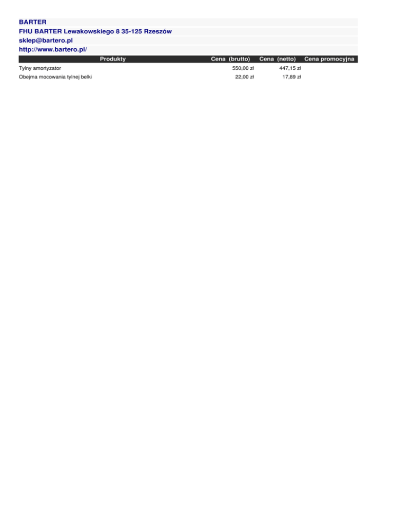 BARTER FHU BARTER Lewakowskiego 8 35-125 Rzeszów [email protected] http://www.bartero.pl/ Produkty Tylny amortyzator Obejma mocowania tylnej belki Cena (brutto) Cena (netto) 550,00 zł 447,15 zł 22,00 zł 17,89 zł Cena promocyjna