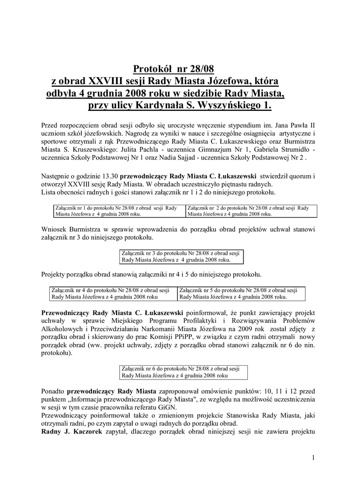 Protokół nr 28/08 z obrad XXVIII sesji Rady Miasta Józefowa, która odbyła 4 grudnia 2008 roku w siedzibie Rady Miasta, przy ulicy Kardynała S. Wyszyńskiego 1. Przed rozpoczęciem obrad sesji odbyło się uroczyste wręczenie stypendium im. Jana Pawła II uczniom szkół józefowskich. Nagrodę za wyniki w nauce i szczególne osiągnięcia artystyczne i sportowe otrzymali z rąk Przewodniczącego Rady Miasta C. Łukaszewskiego oraz Burmistrza Miasta S. Kruszewskiego: Julita Pachla - uczennica Gimnazjum Nr 1, Gabriela Strumidło uczennica Szkoły Podstawowej Nr 1 oraz Nadia Sajjad - uczennica Szkoły Podstawowej Nr 2 . Następnie o godzinie 13.30 przewodniczący Rady Miasta C. Łukaszewski stwierdził quorum i otworzył XXVIII sesję Rady Miasta. W obradach uczestniczyło piętnastu radnych. Lista obecności radnych i gości stanowi załącznik nr 1 i 2 do niniejszego protokołu. Załącznik nr 1 do protokołu Nr 28/08 z obrad sesji Rady Miasta Józefowa z 4 grudnia 2008 roku. Załącznik nr 2 do protokołu Nr 28/08 z obrad sesji Rady Miasta Józefowa z 4 grudnia 2008 roku. Wniosek Burmistrza w sprawie wprowadzenia do porządku obrad projektów uchwał stanowi załącznik nr 3 do niniejszego protokołu. Załącznik nr 3 do protokołu Nr 28/08 z obrad sesji Rady Miasta Józefowa z 4 grudnia 2008 roku. Projekty porządku obrad stanowią załączniki nr 4 i 5 do niniejszego protokołu. Załącznik nr 4 do protokołu Nr 28/08 z obrad sesji Rady Miasta Józefowa z 4 grudnia 2008 roku Załącznik nr 5 do protokołu Nr 28/08 z obrad sesji Rady Miasta Józefowa z 4 grudnia 2008 roku. Przewodniczący Rady Miasta C. Łukaszewski poinformował, że punkt zawierający projekt uchwały w sprawie Miejskiego Programu Profilaktyki i Rozwiązywania Problemów Alkoholowych i Przeciwdziałaniu Narkomanii Miasta Józefowa na 2009 rok został zdjęty z porządku obrad i skierowany do prac Komisji PPiPP, w związku z czym radni otrzymali nowy porządek obrad (ww. projekt uchwały, zdjęty z porządku obrad stanowi załącznik nr 6 do nin. protokołu). Załącznik nr 6 do protokołu Nr 28/08 z obrad sesji Rady Miasta Józefowa z 4 grudnia 2008 roku Ponadto przewodniczący Rady Miasta zaproponował omówienie punktów: 10, 11 i 12 przed punktem ,,Informacja przewodniczącego Rady Miasta", ze względu na możliwość uczestniczenia w sesji w tym czasie pracownika referatu GiGN. Przewodniczący poinformował także o zmienionym projekcie Stanowiska Rady Miasta, jaki otrzymali radni, po czym zapytał o uwagi radnych do porządku obrad. Radny J. Kaczorek zapytał, dlaczego porządek obrad niniejszej sesji nie zawiera projektu 1 uchwały w sprawie ekwiwalentu pieniężnego dla członków ochotniczej straży pożarnej, o czym rozmawiano podczas posiedzeń Komisji PPiPP. Przewodniczący Rady Miasta C. Łukaszewski wyjaśnił, że projekt nie został wprowadzony z przyczyn technicznych. Prawdopodobnie znajdzie się on w porządku obrad sesji w dniu 19 grudnia bieżącego roku. Innych uwag do porządku obrad nie zgłoszono. Został on zaakceptowany przez Radę Miasta. Porządek obrad: 1. Przyjęcie porządku obrad. 2. Przyjęcie protokołu z obrad XXVII sesji. 3. Uchwała w sprawie wprowadzenia zmian w budżecie miasta na 2008 rok. 4. Uchwała w sprawie określenia wysokości stawek podatku od nieruchomości na 2009 rok. 5. Uchwała w sprawie określenia wysokości stawek podatku od środków transportowych w 2009r. 6. Uchwała w sprawie wprowadzenia opłaty od posiadania psów i określenia wysokości opłaty od posiadania psów w 2009r. 7. Uchwała w sprawie ustalenia dziennych stawek opłaty targowej na rok 2009. 8. Uchwała w sprawie zwolnienia z podatku leśnego w 2009 roku. 9. Uchwała w sprawie zwolnień w podatku od nieruchomości. 10. Uchwała w sprawie zatwierdzenia taryf dla zbiorowego zaopatrzenia w wodę i zbiorowego odprowadzenia ścieków na 2009r. 11. Uchwała w sprawie uchwalenia rocznego programu i zasad współpracy Miasta Józefów z organizacjami pozarządowymi oraz innymi podmiotami prowadzącymi działalność pożytku publicznego na rok 2009. 12. Uchwała w sprawie zasad gospodarowania mieszkaniowym zasobem Miasta Józefowa oraz kryteriów wyboru osób, z którymi umowy najmu powinny być zawierane w pierwszej kolejności. 13. Uchwała w sprawie programu gospodarowania mieszkaniowym zasobem Miasta Józefowa na lata 2009-2013. 14. Stanowisko Rady Miasta Józefowa zmieniające stanowisko w sprawie zasad przyznawania lokali mieszkalnych będących w zasobie Towarzystwa Budownictwa Społecznego w Józefowie, w budynku położonym przy ul. Zawiszy 22 w Józefowie oraz kryteriów wyboru osób, z którymi umowy najmu powinny być zawierane. 15. Protokół Komisji Rewizyjnej z kontroli Zakładu Gospodarki Komunalnej ,, Porządek w mieście”. 16. Protokół Komisji Rewizyjnej z kontroli Straży Miejskiej w Józefowie ,, Bezpieczeństwo w mieście”. 17. Informacja Przewodniczącego Rady Miasta o działaniach w okresie od ostatniej sesji. 18. Informacja Burmistrza Miasta o podejmowaniu działań w okresie j. w. 19 Interpelacje i zapytania radnych. 20. Wolne wnioski. Ad.2 Przyjęcie protokołu z XXVII sesji Rady Miasta Józefowa. 2 Przewodniczący Rady Miasta C. Łukaszewski zapytał o ewentualne uwagi do protokołu Nr 27/08 z obrad XXVII sesji Rady Miasta Józefowa. Uwag nie zgłoszono, w związku z czym przewodniczący Rady Miasta poddał ww. protokół pod głosowanie. Protokół nr 27/08 w obecności piętnastu radnych został przyjęty jednogłośnie Następnie przewodniczący Rady Miasta C. Łukaszewski powołał Komisję Skrutacyjną w składzie : przewodniczący Z. Siekierzyński, członek R. Nowaczewski. Ad.3 Uchwała w sprawie wprowadzenia zmian w budżecie miasta na 2008 rok. Przewodniczący Rady Miasta C. Łukaszewski poprosił p. skarbnik o wyjaśnienie dotyczące ww. projektu uchwały, a szczególnie zmienionego załącznika. Pani H. Siwek wytłumaczyła, że zadanie: ,,Opracowanie pro