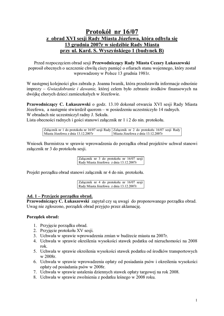 Protokół nr 16/07 z obrad XVI sesji Rady Miasta Józefowa, która odbyła się 13 grudnia 2007r w siedzibie Rady Miasta przy ul. Kard. S. Wyszyńskiego 1 (budynek B) Przed rozpoczęciem obrad sesji Przewodniczący Rady Miasta Cezary Łukaszewski poprosił obecnych o uczczenie chwilą ciszy pamięć o ofiarach stanu wojennego, który został wprowadzony w Polsce 13 grudnia 1981r. W następnej kolejności głos zabrała p. Joanna Iwanik, która przedstawiła informacje odnośnie imprezy – Gwiazdobranie i dawanie, której celem było zebranie środków finansowych na dwójkę chorych dzieci zamieszkałych w Józefowie. Przewodniczący C. Łukaszewski o godz. 13.10 dokonał otwarcia XVI sesji Rady Miasta Józefowa, a następnie stwierdził quorom – w posiedzeniu uczestniczyło 14 radnych. W obradach nie uczestniczył radny J. Sekuła. Lista obecności radnych i gości stanowi załącznik nr 1 i 2 do nin. protokołu. Załącznik nr 1 do protokołu nr 16/07 sesji Rady Załącznik nr 2 do protokołu 16/07 sesji Rady Miasta Józefowa z dnia 13.12.2007r Miasta Józefowa z dnia 13.12.2007r Wniosek Burmistrza w sprawie wprowadzenia do porządku obrad projektów uchwał stanowi załącznik nr 3 do protokołu sesji. Załącznik nr 3 do protokołu nr 16/07 sesji Rady Miasta Józefowa z dnia 13.12.2007r Projekt porządku obrad stanowi załącznik nr 4 do nin. protokołu. Załącznik nr 4 do protokołu nr 16/07 sesji Rady Miasta Józefowa z dnia 13.12.2007r Ad. 1 – Przyjęcie porządku obrad. Przewodniczący C. Łukaszewski zapytał czy są uwagi do proponowanego porządku obrad. Uwag nie zgłoszono, porządek obrad przyjęto przez aklamację. Porządek obrad: 1. 2. 3. 4. 5. 6. 7. 8. Przyjęcie porządku obrad. Przyjęcie protokołu XV sesji. Uchwała w sprawie wprowadzenia zmian w budżecie miasta na 2007r. Uchwała w sprawie określenia wysokości stawek podatku od nieruchomości na 2008 rok. Uchwała w sprawie określenia wysokości stawek podatku od środków transportowych w 2008r. Uchwała w sprawie wprowadzenia opłaty od posiadania psów i określenia wysokości opłaty od posiadania psów w 2008r. Uchwała w sprawie ustalenia dziennych stawek opłaty targowej na rok 2008. Uchwała w sprawie zwolnienia z podatku leśnego w 2008 roku. 1 9. Uchwała w sprawie Miejskiego Programu Profilaktyki i Rozwiązywania Problemów Alkoholowych i Przeciwdziałaniu Narkomanii Miasta Józefowa na rok 2008. 10. Uchwała w sprawie uchwalenia rocznego programu i zasad współpracy Miasta Józefów z organizacjami pozarządowymi oraz innymi podmiotami prowadzącymi działalność pożytku publicznego. 11. Uchwała w sprawie ustalenia czasu pracy placówek handlu detalicznego, zakładów gastronomicznych i usługowych na terenie miasta Józefowa. 12. Uchwała w sprawie ustalenia stawki procentowej opłaty adiacenckiej z tytułu wzrostu wartości nieruchomości w wyniku podziału. 13. Uchwała w sprawie rozwiązania umowy o pracę z radnym Rady Miasta Józefowa. 14. Informacja Przewodniczącego Rady Miasta o działaniach w okresie od ostatniej sesji. 15. Informacja Burmistrza Miasta o podejmowaniu działań w okresie j. w. 16. Interpelacje i zapytania Radnych. 17. Wolne wnioski Ad. 2 - Przyjęcie protokołu XV sesji . Przewodniczący C. Łukaszewski poddał pod głosowanie protokół z poprzedniej sesji Rady Miasta. Rada Miasta w obecności 14 radnych – 12 głosami „za”, przy 2 głosach „wstrzymujących się” przyjęła protokół nr 15/07 z dnia 29 listopada 2007r. Ad. 3 - Uchwała w sprawie wprowadzenia zmian w budżecie miasta na 2007r. Do Komisji Skrutacyjnej zaproponowano radnych: Andrzeja Mazka i Zbigniewa Siekierzyńskiego Rada Miasta skład Komisji Skrutacyjnej zaakceptowała przez aklamację. Przewodniczący C. Łukaszewski przedstawił i poddał pod dyskusję projekt uchwały w sprawie wprowadzenia zmian w budżecie miasta na 2007r. Pani Skarbnik Miasta H. Siwek poinformowała, ze radni dostali zamienny projekt uchwały, a następnie omówiła wprowadzone zmiany tj.: - przesuniecie środków finansowych w wysokości 42 036zł na wypłatę odszkodowania za niezgodne z prawem rejestrowanie samochodów, które pochodziły z kradzieży, - przesunięcie środków w ramach planu inwestycyjnego (przesunięcie planowanej dotacji na wydatek bieżący w wysokości 150 tys. zł na bilety dla ICSiR). Radny J. Kaczorek spytał czy to odszkodowanie będzie wypłacone ze środków miasta. Mecenas Z. Czajor poinformował, że od 2002r. Urząd Miasta Józefowa nie zajmuje się rejestracją samochodów. Od roku 1990 urząd prowadził tę sprawę na zasadzie porozumienia zawartego z Kierownikiem Urzędu Rejonowego, a potem ze Starostą. Odpowiedzialność za błędy pracowników, którą ponosi Urząd Miasta wynika z kodeksu cywilnego. Radca prawny dodał, że osoby, które dokonywały kradzieży samochodów zostały skazane wyrokiem sądu. Radny A. Mazek zwrócił uwagę, że miasto powinno odzyskać te pieniądze przeznaczone na wypłatę odszkodowania, a następnie spytał, kto sprawował kontrolę nad rejestracją samochodów. Burmistrz S. Kruszewski powiedział, że dołoży starań, aby gmina odzyskała te pieniądze. Mecenas Z. Czajor powiedział, ze teoretycznie urząd ma prawo zażądać odszkodowania od osób, które zajmowały się rejestracją. Mecenas poinformował, że kontrolę nad realizację powyższej sprawy sprawował kierownik Urzędu Rejonowego, a w późniejszym czasie Starosta. 2 Następnie Przewodniczący C. Łukaszewski zwrócił się do Komisji Skrutacyjnej o przeprowadzenie głosowania imiennego nad powyższym projektem uchwały. Po przeprowadzeniu głosowania przewodniczący Komisji Skrutacyjnej Zbigniew Siekierzyński odczytał protokół, który wraz z listą z głosowania stanowi załącznik nr 5 do nin. protokołu. Załącznik nr 5 do protokołu nr 16/07 sesji Rady Miasta Józefowa z dnia 13.12.2007r Rada Miasta w obecności 14 radnych – 14 głosami „za” podjęła Uchwał