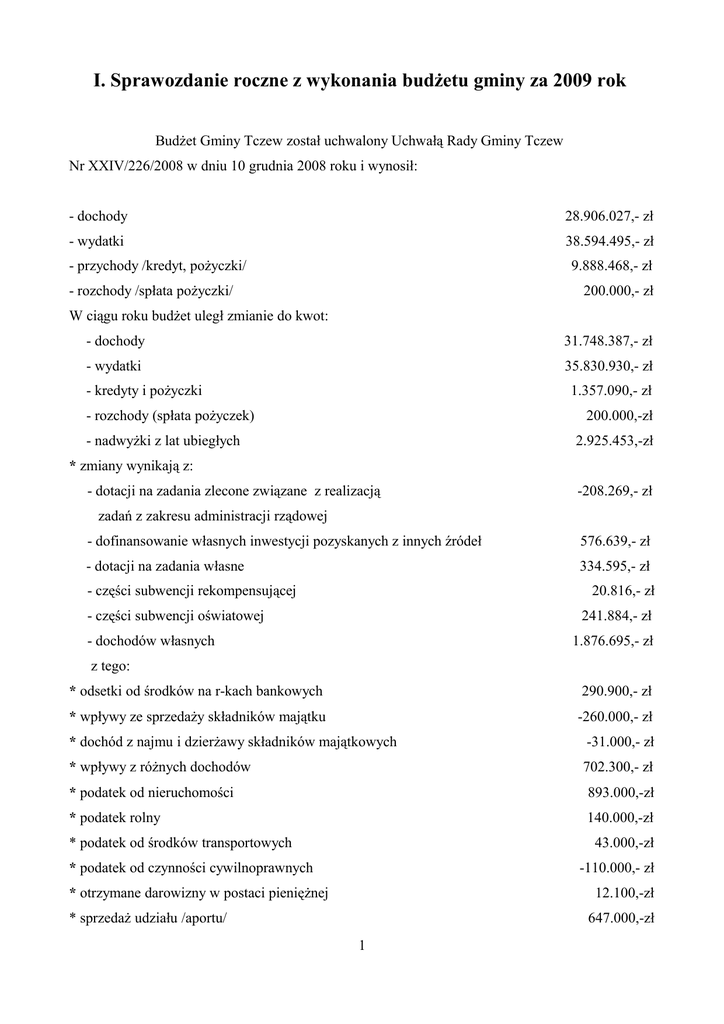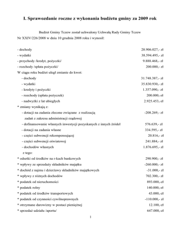 I. Sprawozdanie roczne z wykonania budżetu gminy za 2009 rok Budżet Gminy Tczew został uchwalony Uchwałą Rady Gminy Tczew Nr XXIV/226/2008 w dniu 10 grudnia 2008 roku i wynosił: - dochody 28.906.027,- zł - wydatki 38.594.495,- zł - przychody /kredyt, pożyczki/ 9.888.468,- zł - rozchody /spłata pożyczki/ 200.000,- zł W ciągu roku budżet uległ zmianie do kwot: - dochody 31.748.387,- zł - wydatki 35.830.930,- zł - kredyty i pożyczki 1.357.090,- zł - rozchody (spłata pożyczek) 200.000,-zł - nadwyżki z lat ubiegłych 2.925.453,-zł * zmiany wynikają z: - dotacji na zadania zlecone związane z realizacją -208.269,- zł zadań z zakresu administracji rządowej - dofinansowanie własnych inwestycji pozyskanych z innych źródeł 576.639,- zł - dotacji na zadania własne 334.595,- zł - części subwencji rekompensującej 20.816,- zł - części subwencji oświatowej 241.884,- zł - dochodów własnych 1.876.695,- zł z tego: * odsetki od środków na r-kach bankowych 290.900,- zł * wpływy ze sprzedaży składników majątku -260.000,- zł * dochód z najmu i dzierżawy składników majątkowych -31.000,- zł * wpływy z różnych dochodów 702.300,- zł * podatek od nieruchomości 893.000,-zł * podatek rolny 140.000,-zł * podatek od środków transportowych 43.000,-zł * podatek od czynności cywilnoprawnych -110.000,- zł * otrzymane darowizny w postaci pieniężnej 12.100,-zł * sprzedaż udziału /aportu/ 647.000,-zł 1 * wpływy z usług -87.800,-zł * udziały w podatku od osób fizycznych -400.129,-zł * odsetki od podatków i opłat 32.500,- zł * wpływy z opłaty eksploatacyjnej 172.000,- zł * wpływy z innych opłat stanowiących doch.jst na podstawie -180 .000,-zł odrębnych ustaw (z tyt. wzrostu wartości nieruchomości, za zajęcie pasa drogowego) * pozostałych dochodów własnych 12.824,- zł Struktura uchwalonych na 2009 r. wydatków budżetu gminy przedstawiała się następująco: 1) wydatki bieżące w tym: - zadania w zakresie oświaty i wychowania wraz z edukacyjną opieką wychowawczą 23.841.225,- zł 10.785.754 ,- zł tj. 66,54 % tj. 45,24 % planu wydatków bieżących - zadania z zakresu pomocy społecznej i ochrony zdrowia 5.374.512,- zł tj. 22,54 % wydatków bieżących - zadania z zakresu administracji publicznej 3.320.097,- zł tj. 13,93 % wydatków bieżących - zadania z zakresu rolnictwa 1.057.048,-zł tj. 4,43 % wydatków bieżących - transport /utrzymanie dróg/ 926.550,- zł tj. 3,89 % wydatków bieżących - pozostała działalność 2.377.264,- zł tj. 9,97 % wydatków bieżących 2) wydatki majątkowe w tym: 11.989.705,- zł tj. 33,46 % planu - oświata i wychowanie 454.600,- zł tj. 3,79 % wydatków majątkowych - transport /drogi publiczne gminne i powiatowe/ 4.044.797,- zł tj. 33,73 % - rolnictwo /infrastruktura wodociągowa i sanitacyjna wsi/ 6.759.773,- zł tj. 56,38 % wydatków majątkowych - kultura fizyczna i sport 97.000,- zł 2 tj. 0,81 % wydatków majątkowych wydatków majątkowych - kultura i ochrona dziedzictwa narodowego 358.000,- zł tj. 2,99 % wydatków majątkowych - bezpieczeństwo publiczne i ochrona przeciwpożarowa 141.635,-zł tj. 1,18 % wydatków majątkowych - gospodarka mieszkaniowa 73.900,- zł tj. 0,62 % wydatków majątkowych - ochrona zdrowia /przeciwdziałanie alkoholizmowi/ 60.000,- zł tj. 0,50 % wydatków majątkowych Struktura dochodów budżetu gminy według poszczególnych źródeł: Źródła dochodów I DOCHODY WŁASNE OGÓŁEM Plan Wykonanie 13.489.927 13.663.464,95 Wskaźnik Udział % wykonania do ogółu budżetu 101,29 43,24 w tym: 1. Podatek rolny 1.743.000 1.769.912,78 101,54 5,60 2. Podatek od nieruchomości 6.620.000 6.671.963,90 100,78 21,12 3. Podatek leśny 30.000 31.986,20 106,62 0,10 4. Podatek od środków transportowych 219.000 220.323,12 100,60 0,70 5. Podatki opłacone w formie karty podatkowej 7.000 3.882,67 55,47 0,01 6. Podatek od czynności cywilno-prawnych 405.000 417.107,60 102,99 1,32 7. Opłata skarbowa 30.000 30.230,00 100,77 0,10 8. Wpływy z opłaty za zezwolenia na sprzedaż alkoholu 120.000 129.390,51 107,83 0,41 9. Wpływy ze sprzedaży nieruchomości 440.000 447.267,43 101,65 1,42 10. Wpływy z opłaty eksploatacyjnej 192.700 179.958,76 93,39 0,57 11. Dochody z najmu i dzierżawy 83.500 93.989,61 112,56 0,30 12. Wpływy z usług z tytułu wpłaty za wyżywienie dzieci 427.000 353.095,10 82,69 1,12 13. Wpływy z innych lokalnych opłat pobieranych przez jst na podstawie innych ustaw 426.000 465.983,83 109,39 1,47 14. Odsetki od nieterminowych wpłat z tytułu podatków i opłat 42.500 54.125,93 127,36 0,17 15. Wpływy z różnych dochodów 1.349.330 1.356.774,92 100,55 4,29 16. Odsetki bankowe 363.900 400.290,62 110,00 1,27 17. Inne wpływy 137.158 152.853,90 111,44 0,48 3 Źródła dochodów 18. Wpływy z opłat za zarząd, użytkowanie i użytkowanie wieczyste nieruchomości 19. Plan Wykonanie Wskaźnik Udział % wykonania do ogółu budżetu 45.000 43.548,94 96,78 0,14 Środki na dofinansowanie własnych zadań bieżących i inwestycyjnych pozyskanych z innych źródeł 576.639 625.238,13 108,43 1,97 20. Wpływy z usług 232.200 215.541,00 92,83 0,68 II. UDZIAŁY W PODATKACH STANOWIĄCYCH DOCHÓD BUDŻETU PAŃSTWA 3.715.952 3.863.652,91 103,97 12,23 170.000 276.768,91 162,81 0,88 - od osób fizycznych 3.545.952 3.586.884,00 101,15 11,35 DOTACJE CELOWE 5.451.023 4.979.171,46 91,34 15,76 Udział we wpływach z podatku dochodowego: - od osób prawnych III. z tego: 1. Na zadania własne 716.052 693.222,31 96,81 2,20 2. Na zadania zlecone 4.734.971 4.285.949,15 90,52 13,56 IV. SUBWENCJA OGÓLNA 9.091.485 9.091.485,00 100,00 28,77 6.990.033 6.990.033,00 100,00 22,12 20.816 20.816,00 100,00 0,07 2.080.636 2.080.636,00 100,00 6,58 31.748.387 31.597.774,32 99,53 - z tego: - część oświatowa - część rekompensująca - część wyrównawcza RAZEM: Struktura wykonania dochodów za 2009 rok według źródeł powstania 4 Realizacja dochodów ogółem za 2009 r