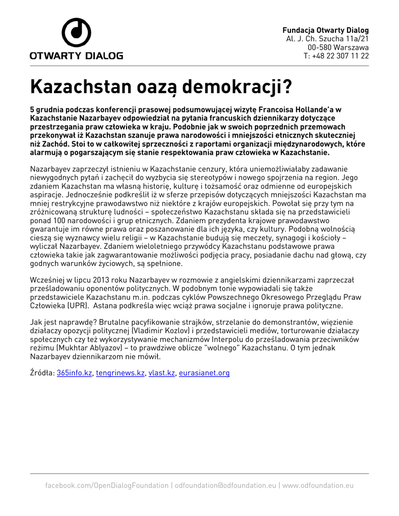 Fundacja Otwarty Dialog Al. J. Ch. Szucha 11a/21 00-580 Warszawa T: +48 22 307 11 22 Kazachstan oazą demokracji? 5 grudnia podczas konferencji prasowej podsumowującej wizytę Francoisa Hollande’a w Kazachstanie Nazarbayev odpowiedział na pytania francuskich dziennikarzy dotyczące przestrzegania praw człowieka w kraju. Podobnie jak w swoich poprzednich przemowach przekonywał iż Kazachstan szanuje prawa narodowości i mniejszości etnicznych skuteczniej niż Zachód. Stoi to w całkowitej sprzeczności z raportami organizacji międzynarodowych, które alarmują o pogarszającym się stanie respektowania praw człowieka w Kazachstanie. Nazarbayev zaprzeczył istnieniu w Kazachstanie cenzury, która uniemożliwiałaby zadawanie niewygodnych pytań i zachęcił do wyzbycia się stereotypów i nowego spojrzenia na region. Jego zdaniem Kazachstan ma własną historię, kulturę i tożsamość oraz odmienne od europejskich aspiracje. Jednocześnie podkreślił iż w sferze przepisów dotyczących mniejszości Kazachstan ma mniej restrykcyjne prawodawstwo niż niektóre z krajów europejskich. Powołał się przy tym na zróżnicowaną strukturę ludności – społeczeństwo Kazachstanu składa się na przedstawicieli ponad 100 narodowości i grup etnicznych. Zdaniem prezydenta krajowe prawodawstwo gwarantuje im równe prawa oraz poszanowanie dla ich języka, czy kultury. Podobną wolnością cieszą się wyznawcy wielu religii – w Kazachstanie budują się meczety, synagogi i kościoły – wyliczał Nazarbayev. Zdaniem wieloletniego przywódcy Kazachstanu podstawowe prawa człowieka takie jak zagwarantowanie możliwości podjęcia pracy, posiadanie dachu nad głową, czy godnych warunków życiowych, są spełnione. Wcześniej w lipcu 2013 roku Nazarbayev w rozmowie z angielskimi dziennikarzami zaprzeczał prześladowaniu oponentów politycznych. W podobnym tonie wypowiadali się także przedstawiciele Kazachstanu m.in. podczas cyklów Powszechnego Okresowego Przeglądu Praw Człowieka (UPR). Astana podkreśla więc wciąż prawa socjalne i ignoruje prawa polityczne. Jak jest naprawdę? Brutalne pacyfikowanie strajków, strzelanie do demonstrantów, więzienie działaczy opozycji politycznej (Vladimir Kozlov) i przedstawicieli mediów, torturowanie działaczy społecznych czy też wykorzystywanie mechanizmów Interpolu do prześladowania przeciwników reżimu (Mukhtar Ablyazov) – to prawdziwe oblicze "wolnego" Kazachstanu. O tym jednak Nazarbayev dziennikarzom nie mówił. Źródła: 365info.kz, tengrinews.kz, vlast.kz, eurasianet.org facebook.com/OpenDialogFoundation | [email protected] | www.odfoundation.eu