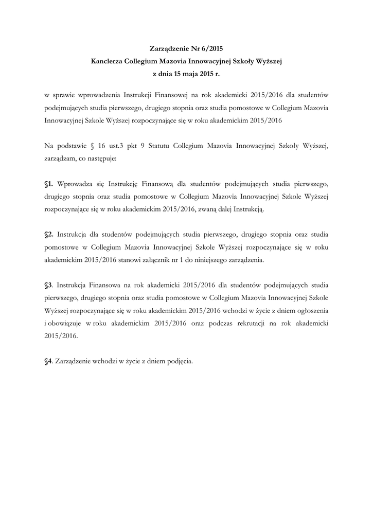 Zarządzenie Nr 6/2015 Kanclerza Collegium Mazovia Innowacyjnej Szkoły Wyższej z dnia 15 maja 2015 r. w sprawie wprowadzenia Instrukcji Finansowej na rok akademicki 2015/2016 dla studentów podejmujących studia pierwszego, drugiego stopnia oraz studia pomostowe w Collegium Mazovia Innowacyjnej Szkole Wyższej rozpoczynające się w roku akademickim 2015/2016 Na podstawie § 16 ust.3 pkt 9 Statutu Collegium Mazovia Innowacyjnej Szkoły Wyższej, zarządzam, co następuje: §1. Wprowadza się Instrukcję Finansową dla studentów podejmujących studia pierwszego, drugiego stopnia oraz studia pomostowe w Collegium Mazovia Innowacyjnej Szkole Wyższej rozpoczynające się w roku akademickim 2015/2016, zwaną dalej Instrukcją. §2. Instrukcja dla studentów podejmujących studia pierwszego, drugiego stopnia oraz studia pomostowe w Collegium Mazovia Innowacyjnej Szkole Wyższej rozpoczynające się w roku akademickim 2015/2016 stanowi załącznik nr 1 do niniejszego zarządzenia. §3. Instrukcja Finansowa na rok akademicki 2015/2016 dla studentów podejmujących studia pierwszego, drugiego stopnia oraz studia pomostowe w Collegium Mazovia Innowacyjnej Szkole Wyższej rozpoczynające się w roku akademickim 2015/2016 wchodzi w życie z dniem ogłoszenia i obowiązuje w roku akademickim 2015/2016 oraz podczas rekrutacji na rok akademicki 2015/2016. §4. Zarządzenie wchodzi w życie z dniem podjęcia. Załącznik nr 1 do Zarządzenia nr 6/2015 Kanclerza Collegium Mazovia Innowacyjnej Szkoły Wyższej z dnia 15 maja 2015 r. Instrukcja finansowa dla studentów podejmujących studia pierwszego, drugiego stopnia oraz studia pomostowe w Collegium Mazovia Innowacyjnej Szkole Wyższej rozpoczynające się w roku akademickim 2015/2016 Rozdział I – Postanowienia ogólne 1. 2. 3. 4. 5. 1. 2. 3. 4. §1 Instrukcja finansowa dla studentów Collegium Mazovia Innowacyjnej Szkoły Wyższej określa odpłatności za studia i inne opłaty związane z tokiem studiów oraz zasady ich wnoszenia. Instrukcja finansowa dotyczy studentów podejmujących studia pierwszego i drugiego stopnia oraz studia pomostowe w Collegium Mazovia Innowacyjnej Szkole Wyższej rozpoczynające się w roku akademickim 2015/2016. Studenci, którzy kontynuują studia po urlopie dziekańskim, wznawiają studia lub przenoszą się z innej uczelni, wnoszą czesne zgodnie z Instrukcją finansową obowiązującą dany tok studiów do którego dołączają. Instrukcja nie dotyczy studentów, którzy podejmują studia współfinansowane ze środków Unii Europejskiej. W dalszej części Instrukcja finansowa zwana jest Instrukcją, a Collegium Mazovia Innowacyjna Szkoła Wyższa – Uczelnią. §2 Studia w Collegium Mazovia Innowacyjnej Szkole Wyższej są studiami odpłatnymi. Wysokość odpłatności za studia, określona w niniejszej Instrukcji, może być zmieniana w drodze aneksu do umowy o studia. Opłata za studia zwana dalej czesnym, wnoszona jest z góry za każdy semestr studiów. Na opłaty związane z tokiem studiów składają się opłaty określone w rozdziale V niniejszej instrukcji.: Rozdział II – Zasady wnoszenia opłat 1. 2. 3. 4. §3 Wszystkie opłaty związane z tokiem studiów powinny być wnoszone przez studentów przelewem bankowym bądź przekazem pocztowym na konto bankowe Uczelni. Każdy student Uczelni otrzymuje indywidualne, przyporządkowane studentowi subkonto bankowe. Student jest zobowiązany do dokonywania wszelkich opłat wynikających z toku studiów wyłącznie na swoje indywidualne subkonto bankowe. W wyjątkowych przypadkach student może wpłacać drobne kwoty do kasy Uczelni, po uzyskaniu akceptacji kasjerki na przyjęcie wpłaty. Na blankiecie polecenia przelewu bądź przekazu należy czytelnie wpisać: imię i nazwisko wpłacającego, tytuł wpłaty oraz numer albumu. Uczelnia nie ponosi odpowiedzialności za błędne księgowanie wpłat opisanych nieczytelnie i bez podanego numeru albumu. 5. Wpłaty studenta są księgowane zgodnie z podanym tytułem wpłaty. 6. Wpłaty bez podania tytułu księgowane są na poczet czesnego. 7. W przypadku, gdy student ma zaległości finansowe wobec Uczelni, w pierwszej kolejności pokryte zostaną odsetki ustawowe naliczone z powodu nieterminowych wpłat, w drugiej zaległe należności a w trzeciej tytuł wpłaty. 1. 2. 3. 4. §4 Opłaty powinny być wnoszone w wysokościach i w terminach zgodnych z niniejszą Instrukcją. Za dzień dokonania wpłaty uznaje się dzień wpływu środków na konto bankowe Uczelni lub do kasy Uczelni. Jeżeli termin przypada na dzień ustawowo wolny od pracy, obowiązek zapłaty przesuwa się na dzień następny. Opłaty wynikające z decyzji Dziekana lub Rektora powinny być wnoszone w terminie do 14 dni od daty tej decyzji. Studenci ostatniego semestru dokonują wpłaty należności, o których mowa w § 4 ust. 1 i 3, nie później niż do dnia obrony. §5 W przypadku powstania znaczących zaległości finansowych studenta wobec Uczelni, Kanclerz wzywa studenta do ich uregulowania, powiadamiając studenta listem o wysokości zobowiązań i wyznaczając 14-dniowy termin ostateczny. §6 Skreślenie studenta z listy studentów nie zwalnia go z obowiązku rozliczenia się z zaległości finansowych wobec Uczelni. Rozdział III – Czesne 1. 2. 3. 4. 5. §7 Podstawową formą płatności za studia jest opłata czesnego za semestr. Opłaty semestralne za studia powinny być wniesione do 15 września za semestr zimowy i do 15 lutego za semestr letni. Student studiujący na wszystkich kierunkach studiów z wyjątkiem kierunku fizjoterapia może skorzystać z dodatkowego sposobu wpłacania czesnego w czterech ratach w każdym semestrze, płaconych co miesiąc począwszy od 15 września do 15 grudnia w semestrze zimowym i od 15 lutego do 15 maja w semestrze letnim. Student studiujący na kierunku fizjoterapia może skorzystać z dodatkowego sposobu wpłacania czesnego w pięciu ratach w każdym semestrze, płaconych co miesiąc począws