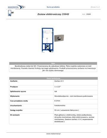 Karta produktu Zestaw elektroniczny 3504S Strona 1 z 2 kod: 3504S Opis Bezdotykowy stelaż do WC. Przeznaczony do zabudowy lekkiej. Płyta czujnika wykonana ze stali nierdzewnej. Posiada również funkcję ręcznego spłukiwania. Produkt przeznaczony zarówno na inwestycje jak i do użytku domowego. Zasilanie Dane techniczne Zasilacz 6 V Przyłącze 1 x 1/2" Spłukiwanie ręczne tak Wykonanie Wandaloodporne - stal nierdzewna polerowana Czas przepływu wody 6 l/min Uruchamianie Fotokomórka Zasięg czujnika 55 cm ( ustawienie fabryczne ) W zestawie Płyta główna z elektroniką, stelaż podtynkowy, skrzynka montażowa, blok elektrozaworu, zestaw montażowy. Zawiera zasilacz 6 V ( wyposażenie dodatkowe ) www.makoinstal.pl Karta produktu Zestaw elektroniczny 3504S www.makoinstal.pl Strona 2 z 2 kod: 3504S